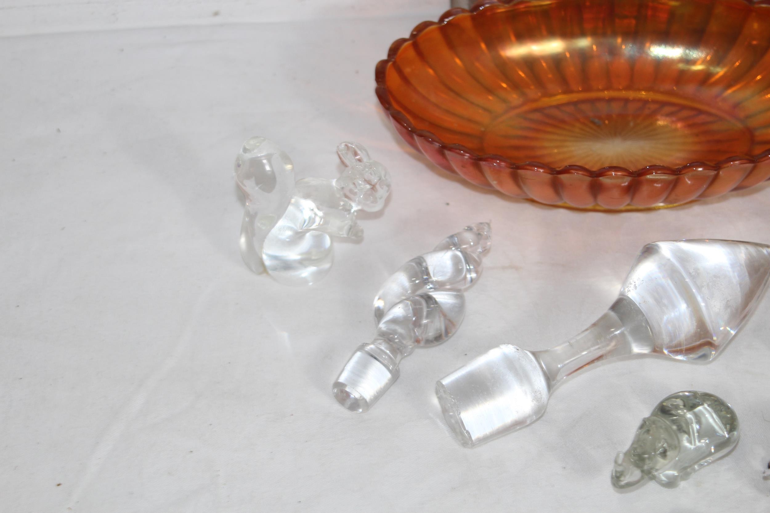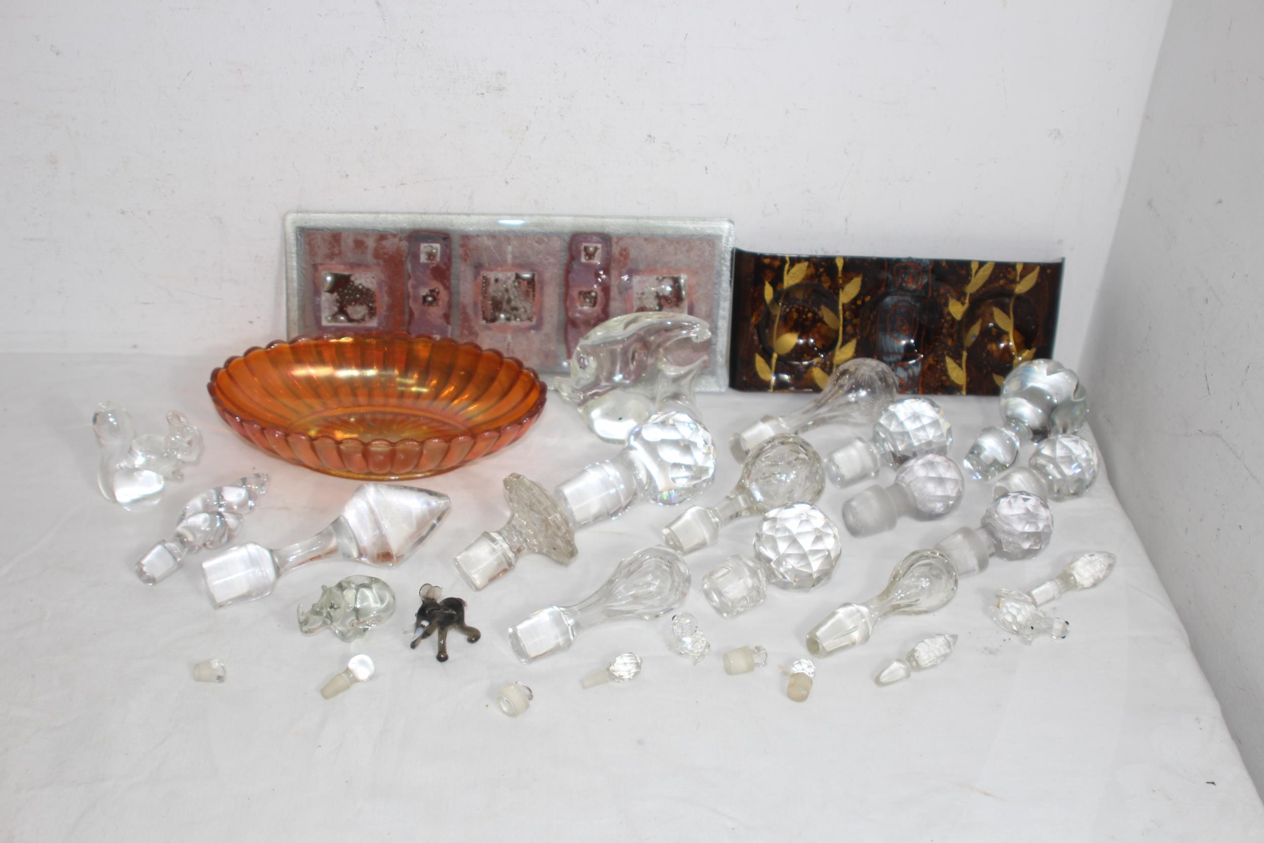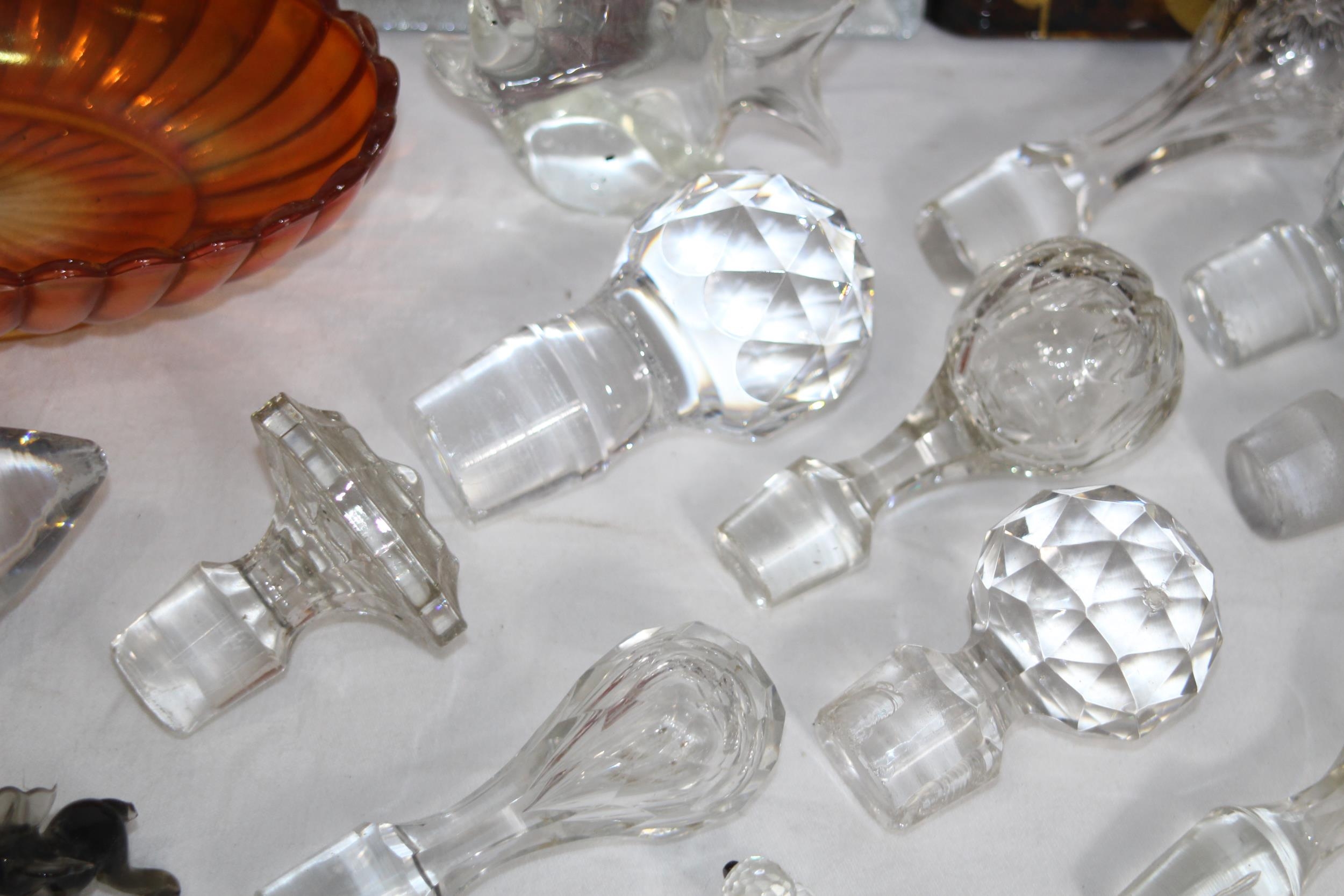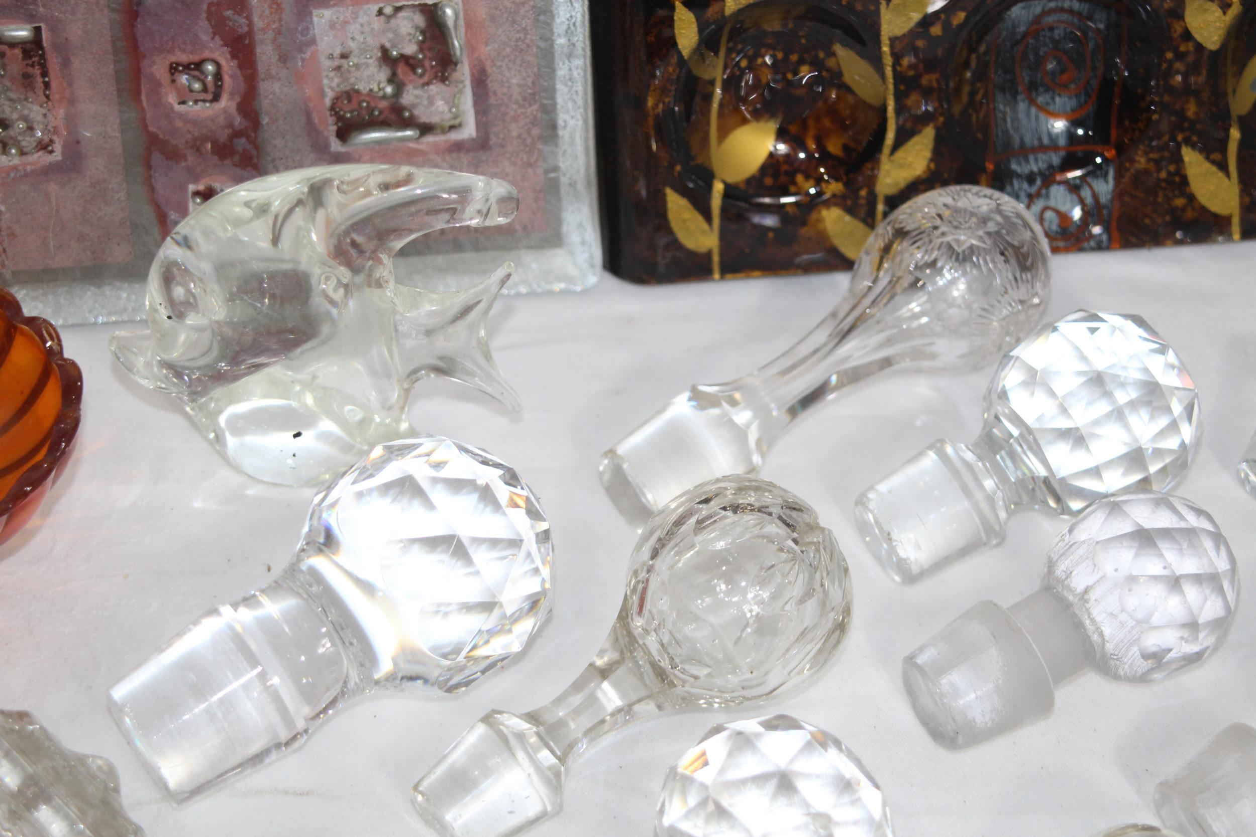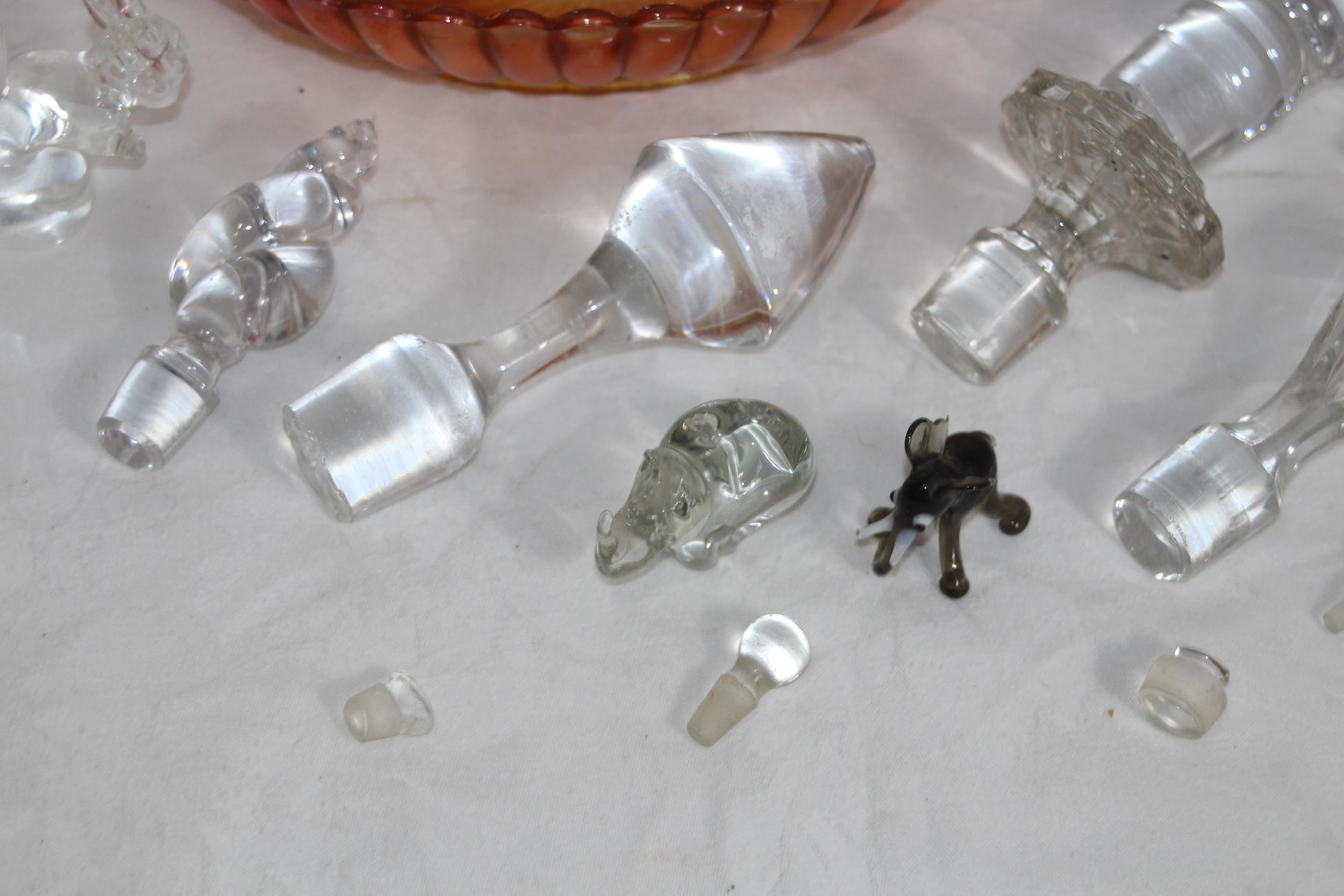 MIXTURE OF ART GLASS, GLASS ANIMALS AND A QTY OF GLASS STOPPERS IN VARIETY OF SIZES FOR DECANTERS & SCENTS