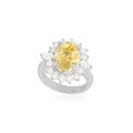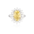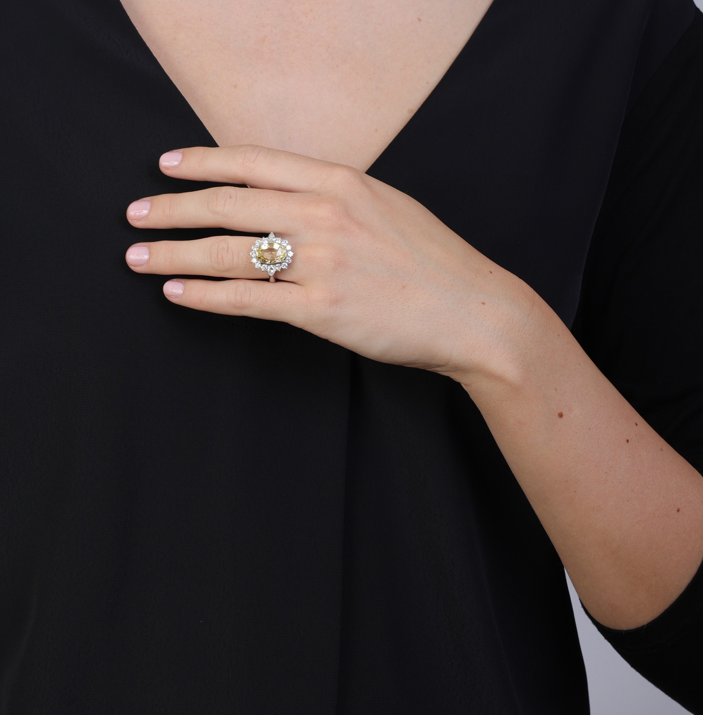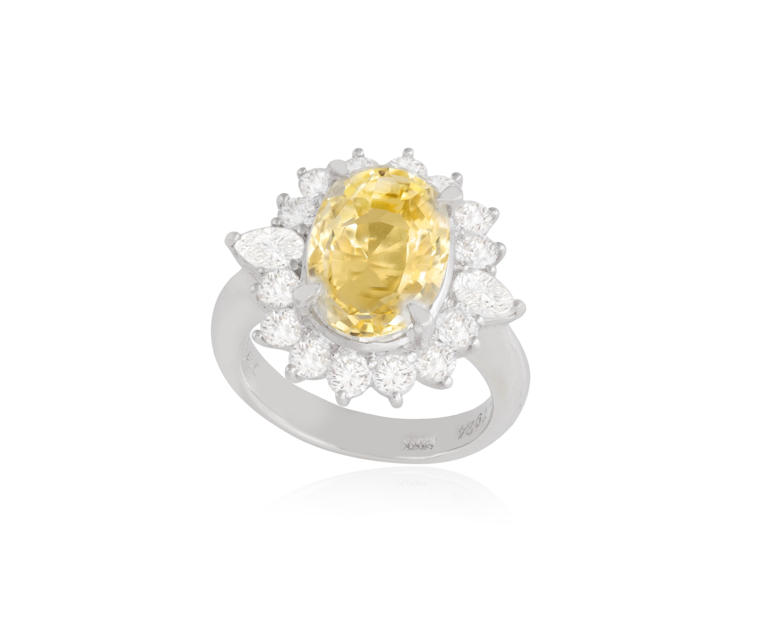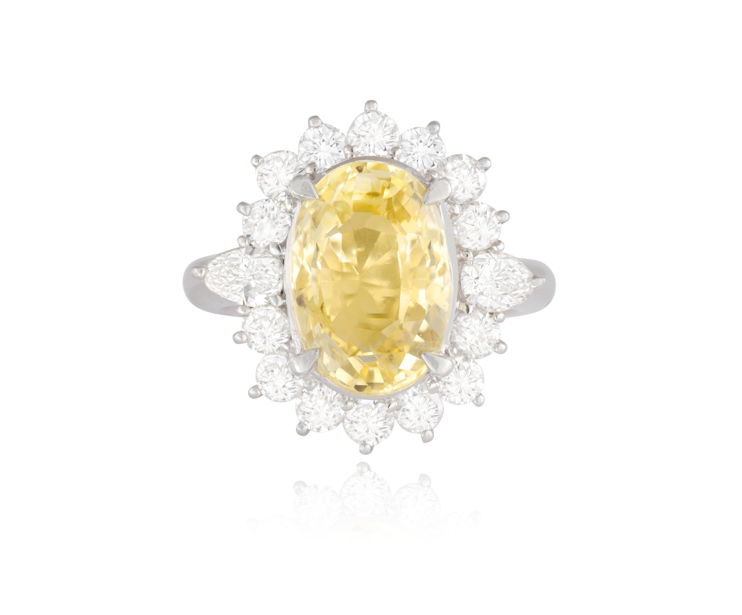 A YELLOW SAPPHIRE AND DIAMOND DRESS RING Of cluster-design, centring an oval-shaped yellow sapphire weighing approximately 7.90cts, framed by brilliant-cut and pear-shaped diamonds, mounted in platinum, diamonds approximately 1.70cts total, French assay marks, ring size L½