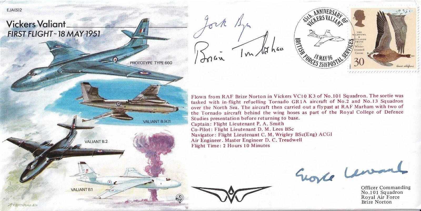 EJA(S)2c Vickers Valiant Flown cover Signed by Brian Trubshaw, Sir G Edwards, J Bryce. 18 May 96 BFPS 2518 45th Anniversary of Vickers Valiant 1st Flight. Personally Signed Brian Trubshaw Concorde Test Pilot, Sir G. Edwards Chief Designer and J. Bryce. Chief Test Pilot Details enclosed. Certified Copy 00441 of 499. Good condition. All autographs come with a Certificate of Authenticity. We combine postage on multiple winning lots and can ship worldwide. UK postage from £5.99, EU from £7.99, Rest of World from £9.99
