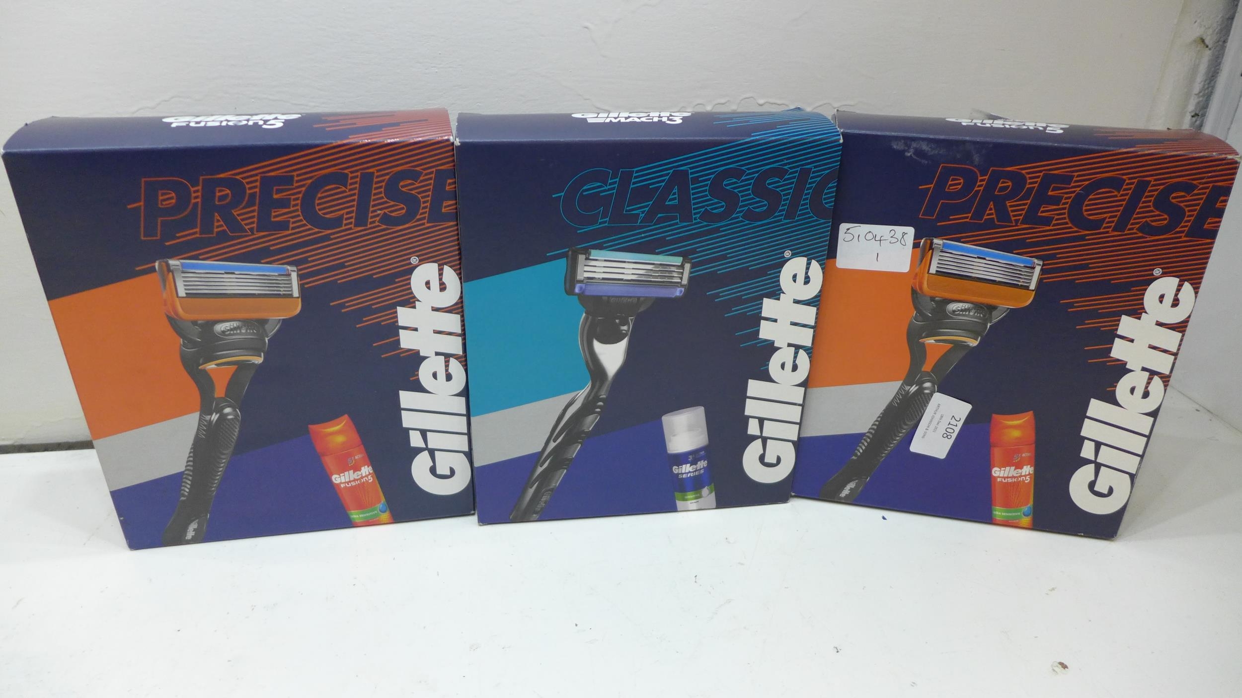 3 boxed unused Gillette Fusion 5 razor kits (1 blade, razor and gel)