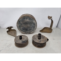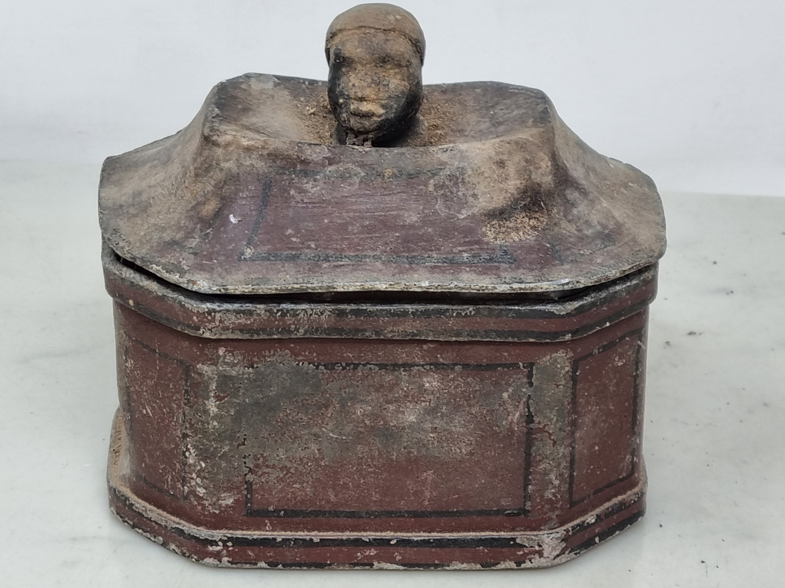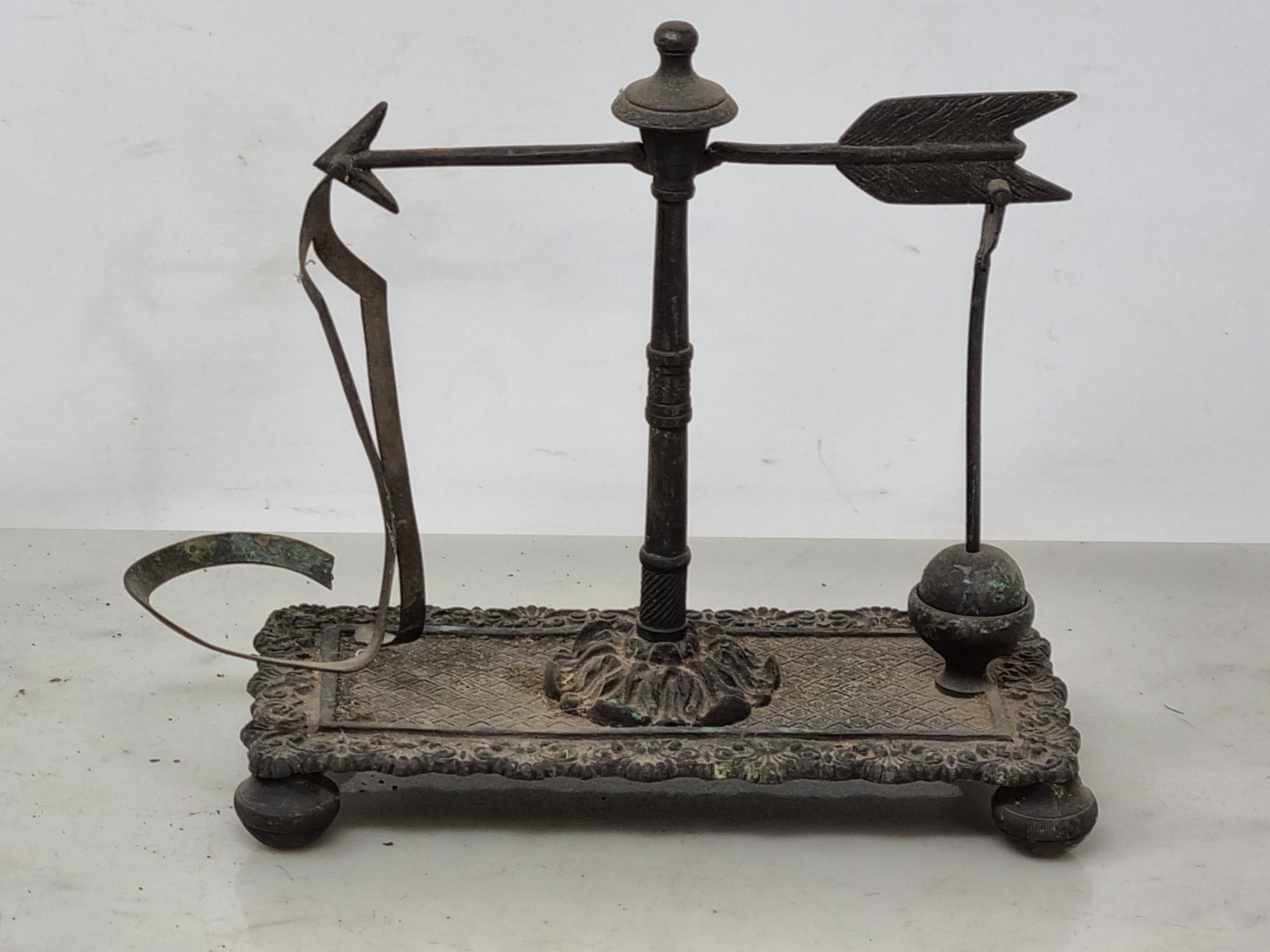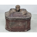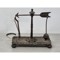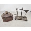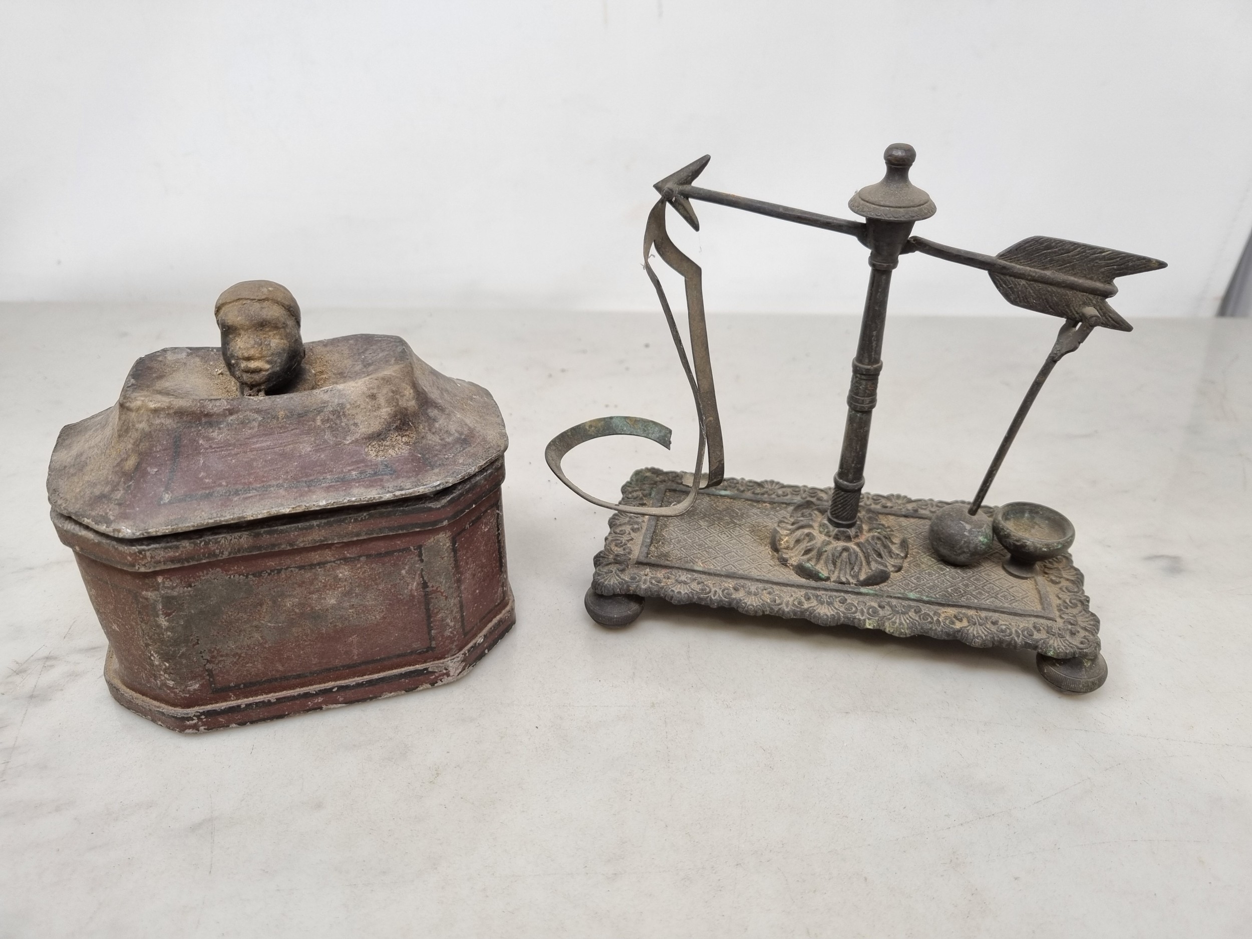 An antique lead Tobacco Box, press and cover with negro's head finial having painted details, 5in, and a Set of Scales with arrow beam and platform base on bun feet (CAB)