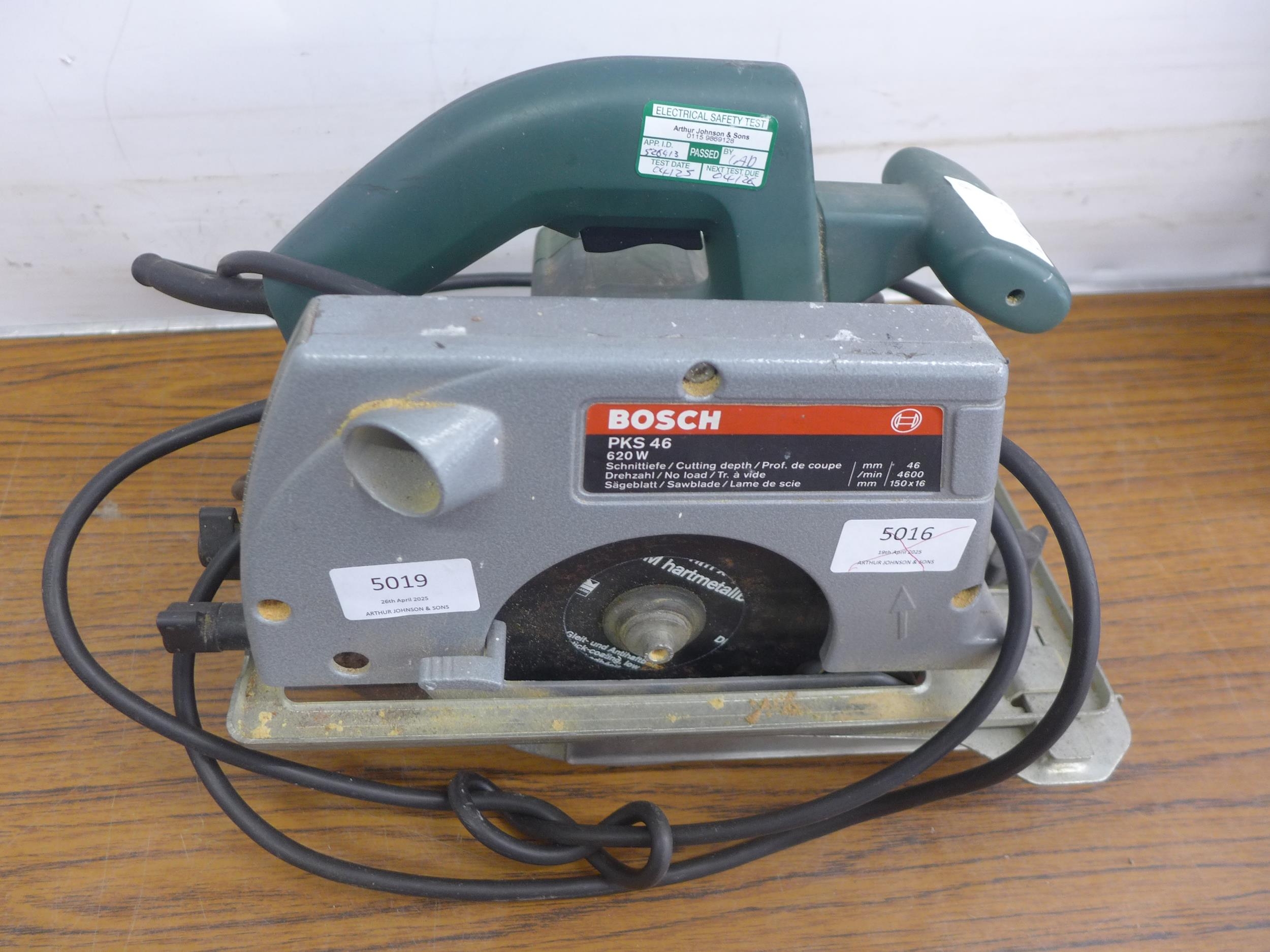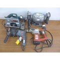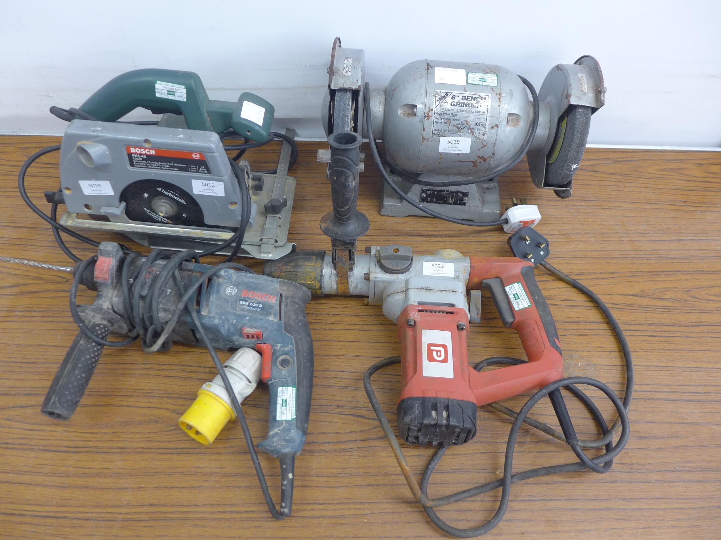 A quantity of power tools including a Bosch PKS-46 240v circular saw, a Bosch professional GBH -D 110v hammer drill, a Performance Power 240v hammer drill and a Hilka 6" 240v bench grinder