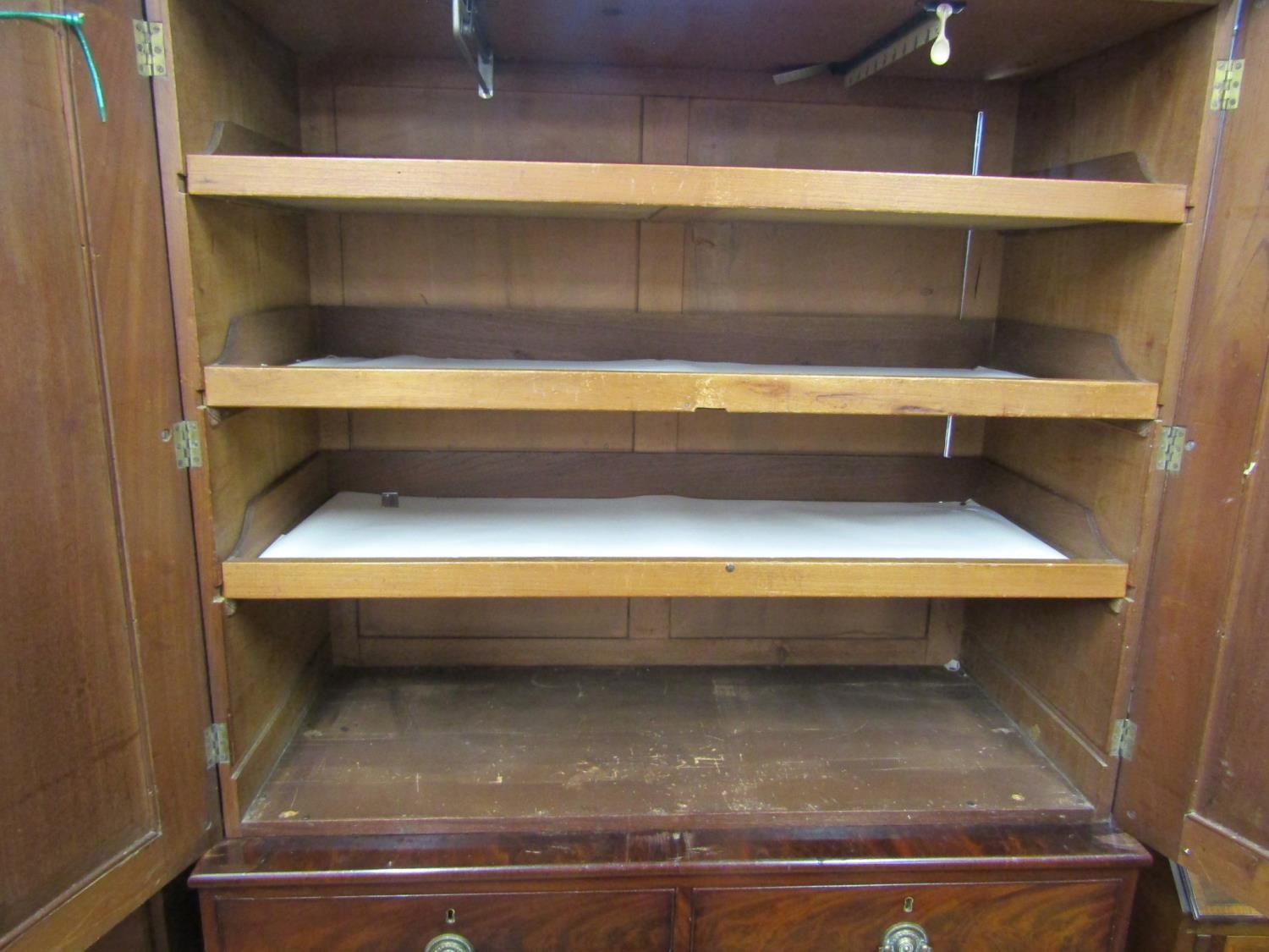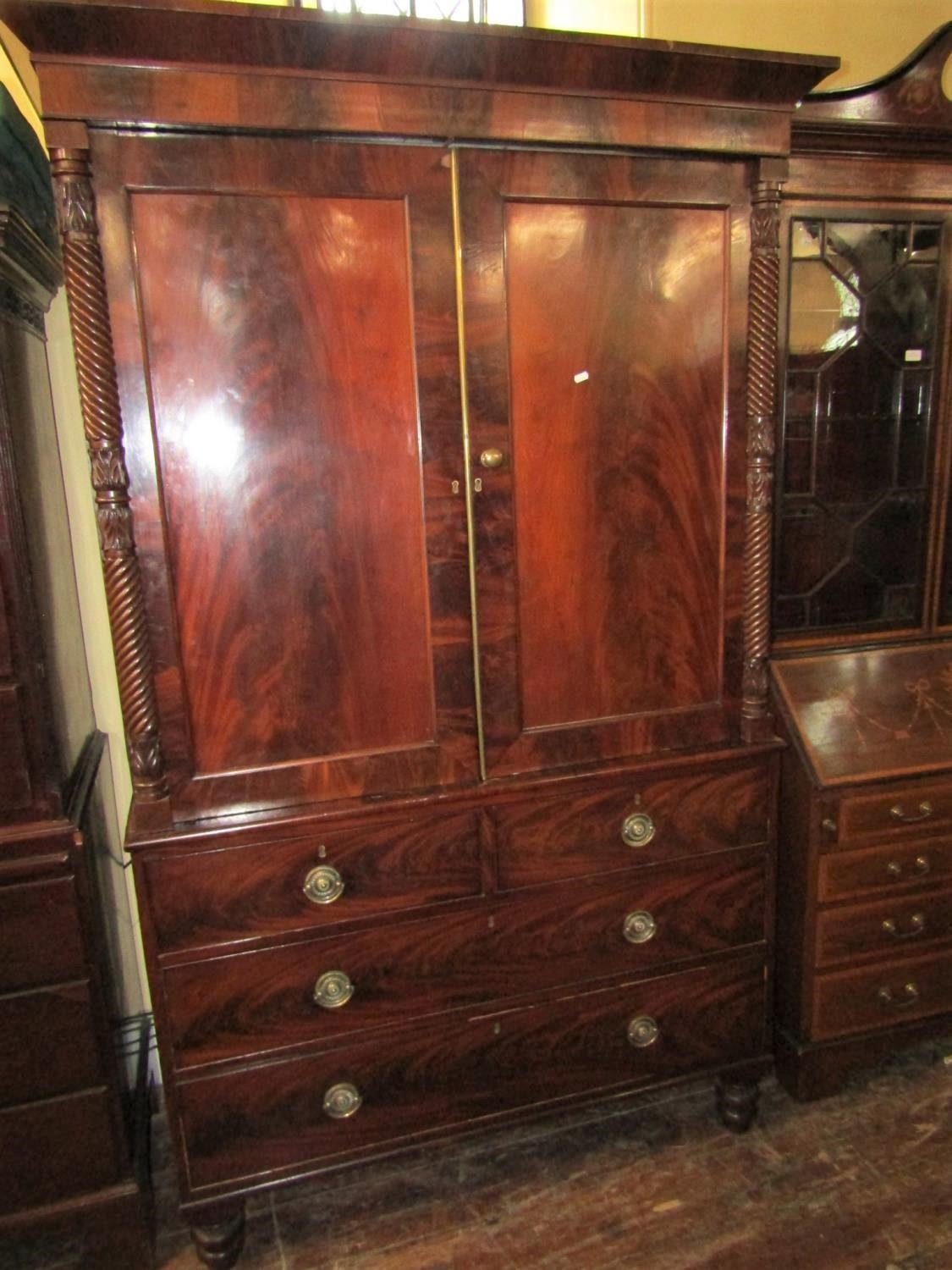 A William IV mahogany linen press, the lower section enclosed by two long and two short drawers, the upper section by two well matched flame veneered panelled doors, within carved split spindle mouldings, 130cm wide