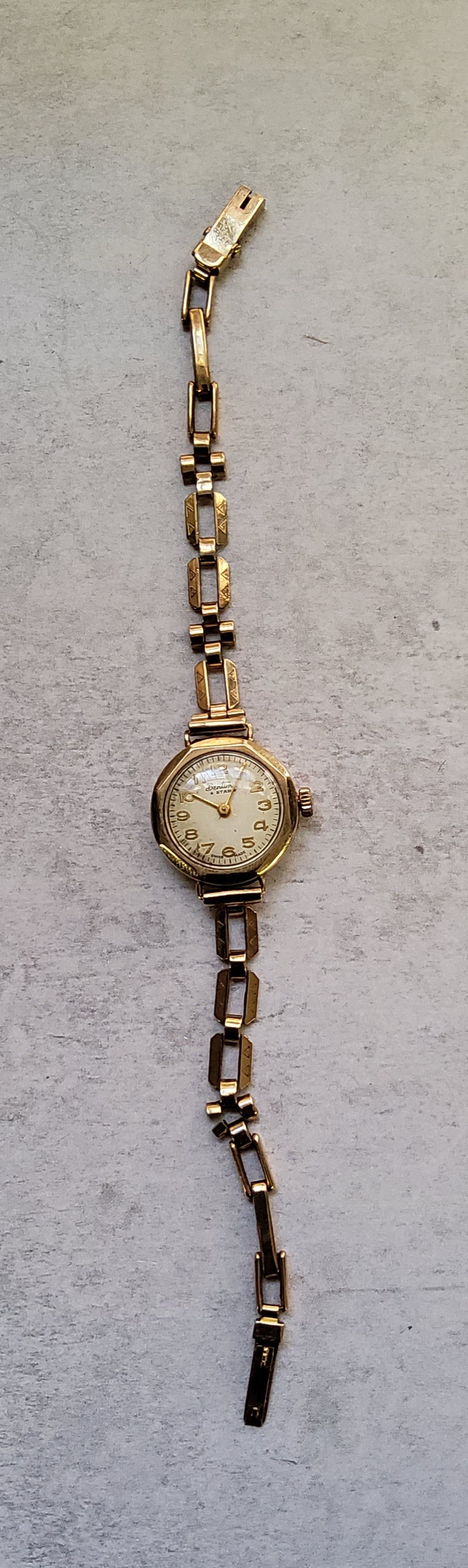 A 9ct gold Bentima lady's wristwatch, Swiss 15 jewel movement, silver dial, gold Arabic numerals, integral 9ct gold bracelet 8.93g (without movement) gross