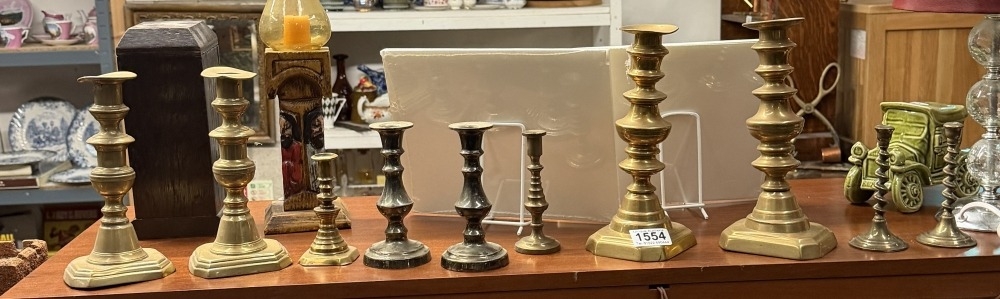 10 Various sized brass candlesticks