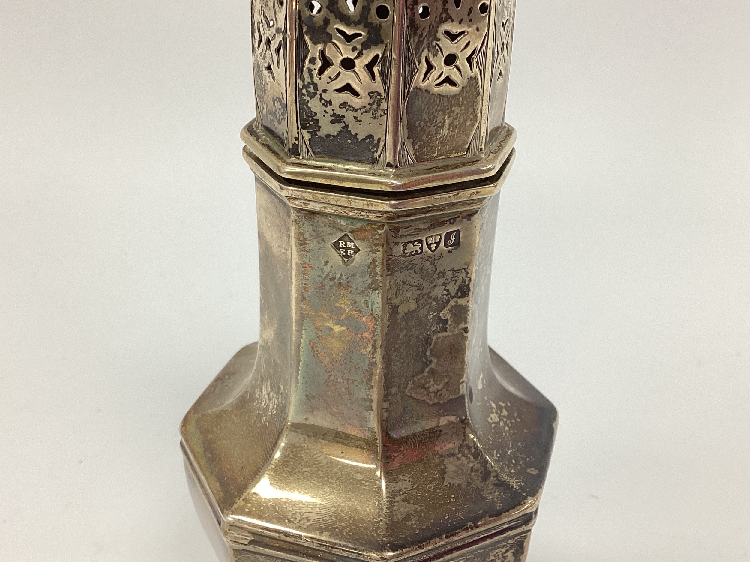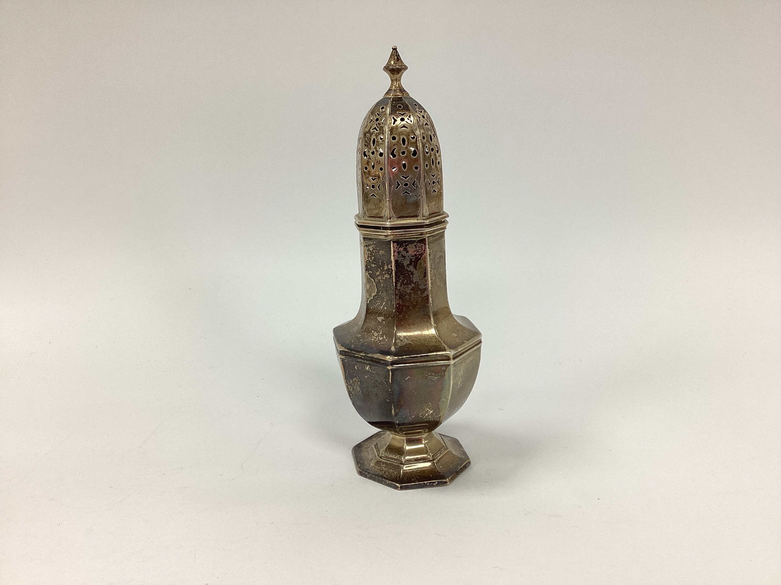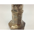 A Hallmarked Silver Sugar Caster, Martin, Hall & Co, Chester 1909, of octagonal balustr form, with pierced pull off cover, on octagonal spreading base, 19cm high. 125grams
