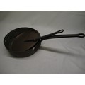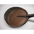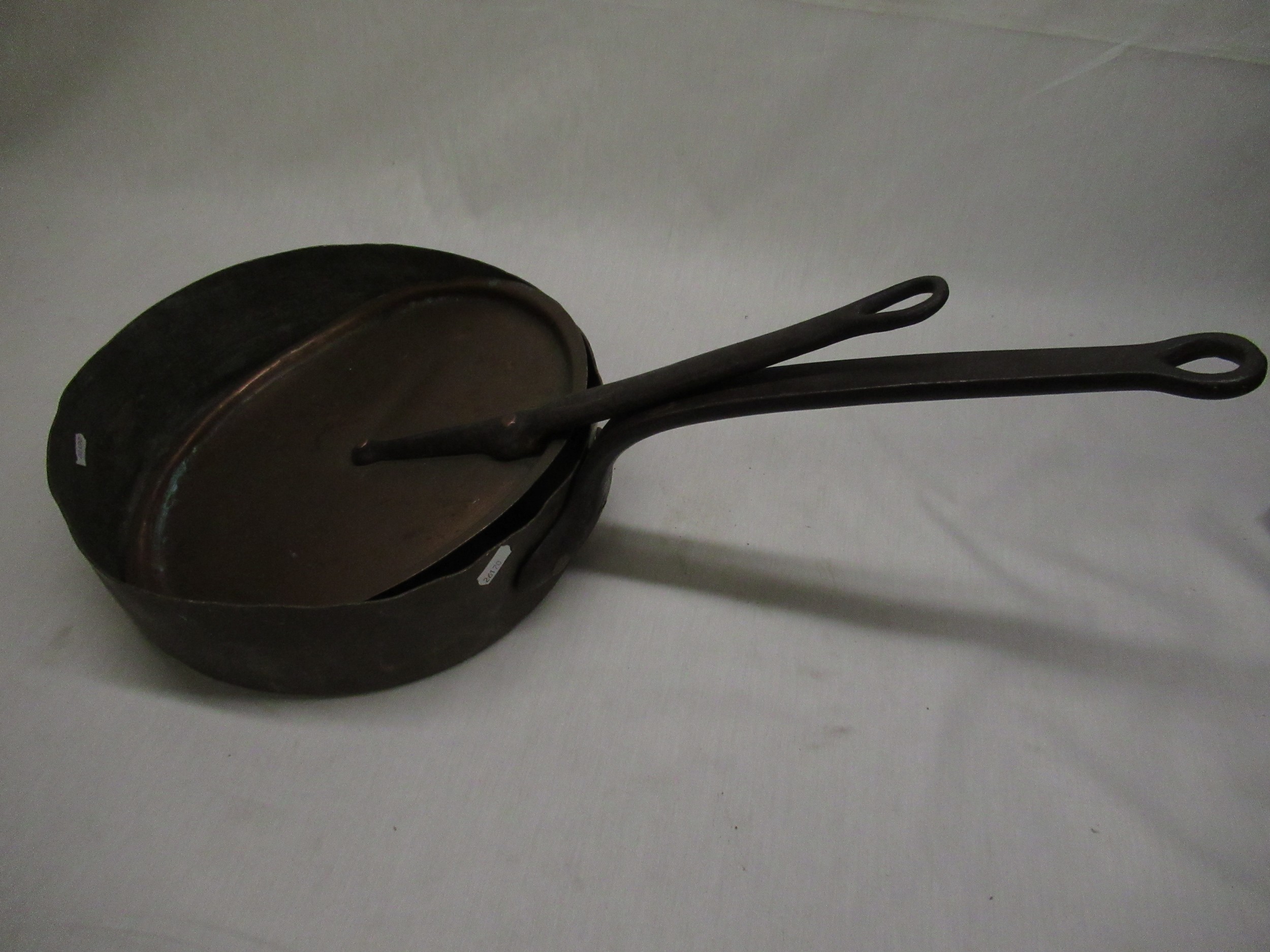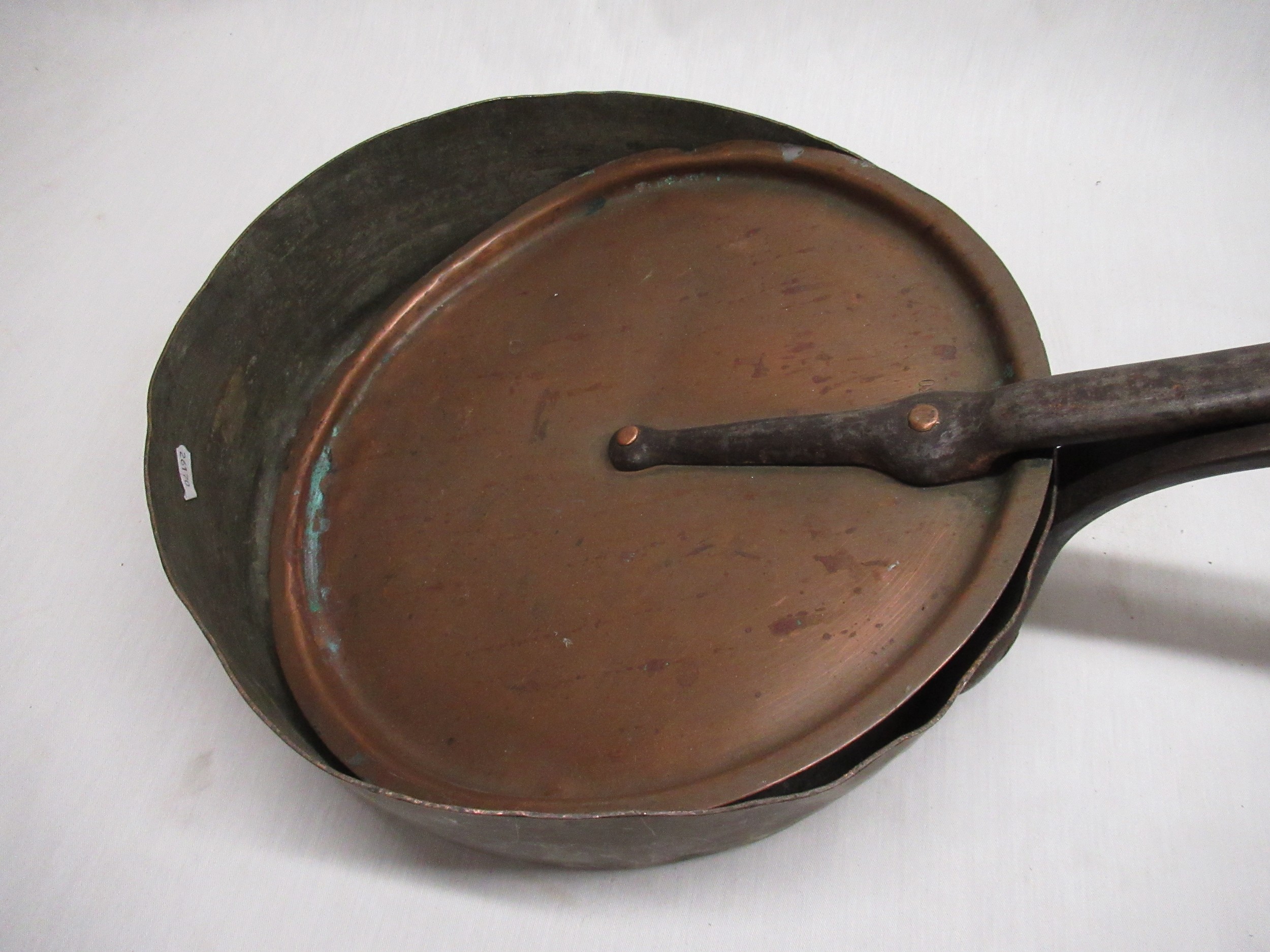 Late C19th shallow copper saucepan with riveted wrought iron handle and matching copper lid. D32cm