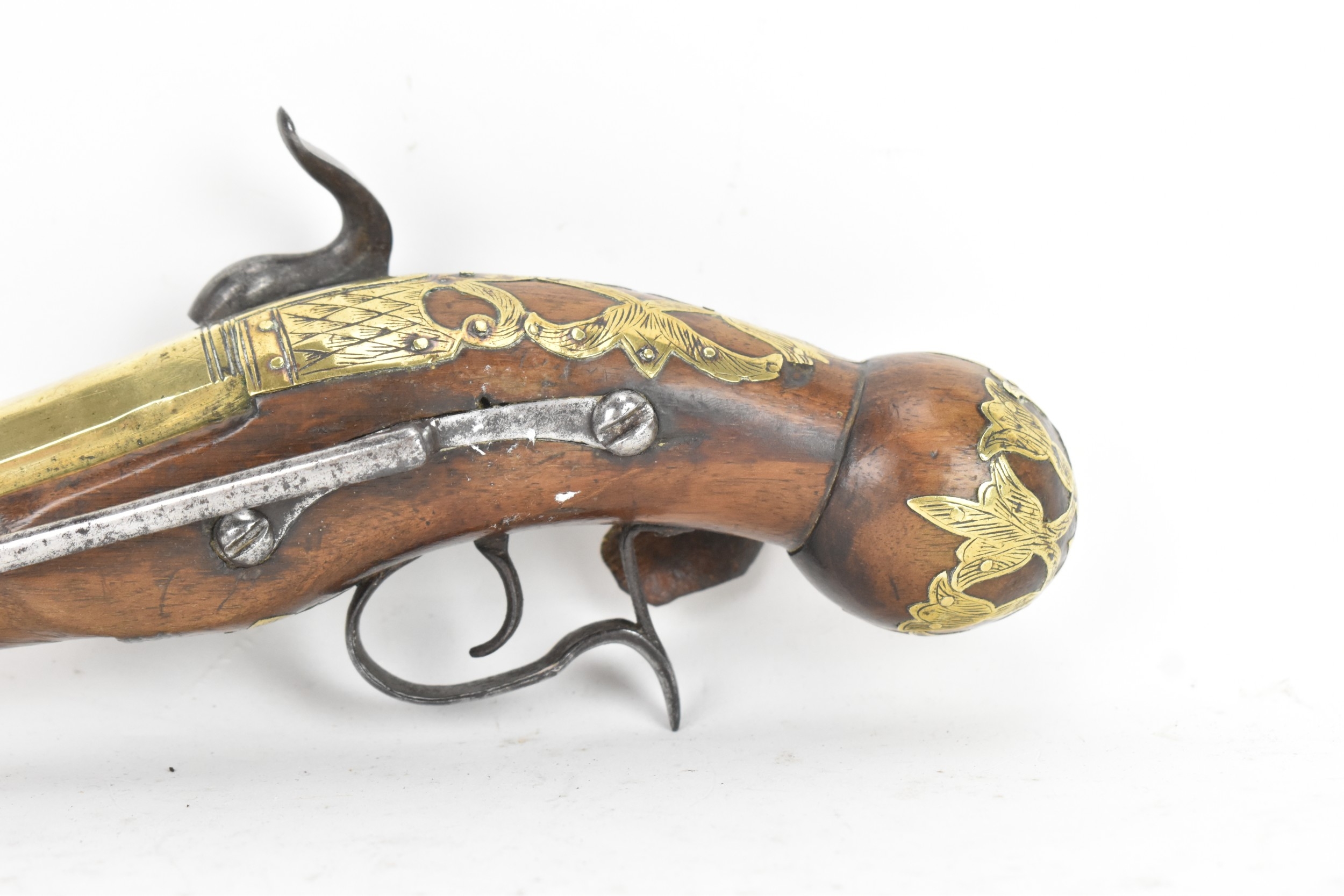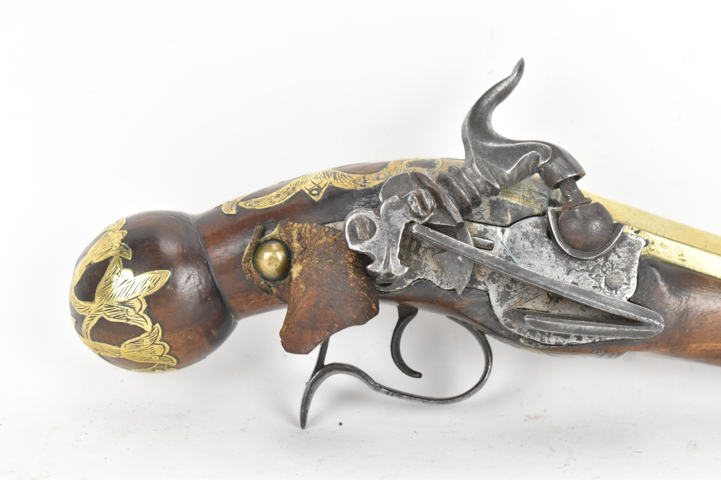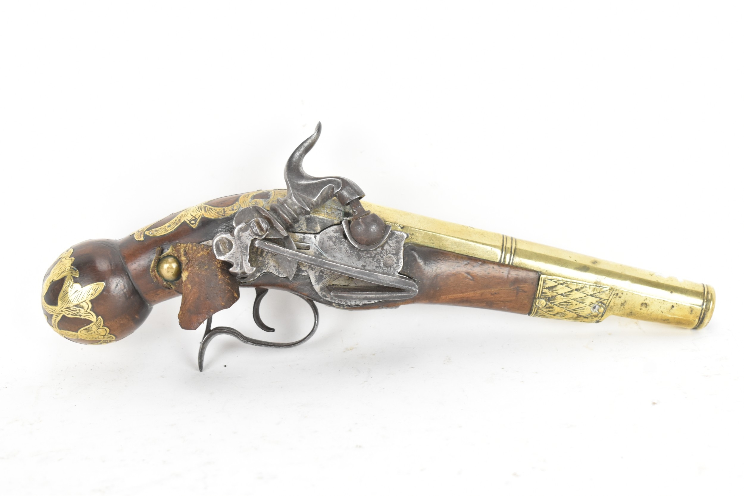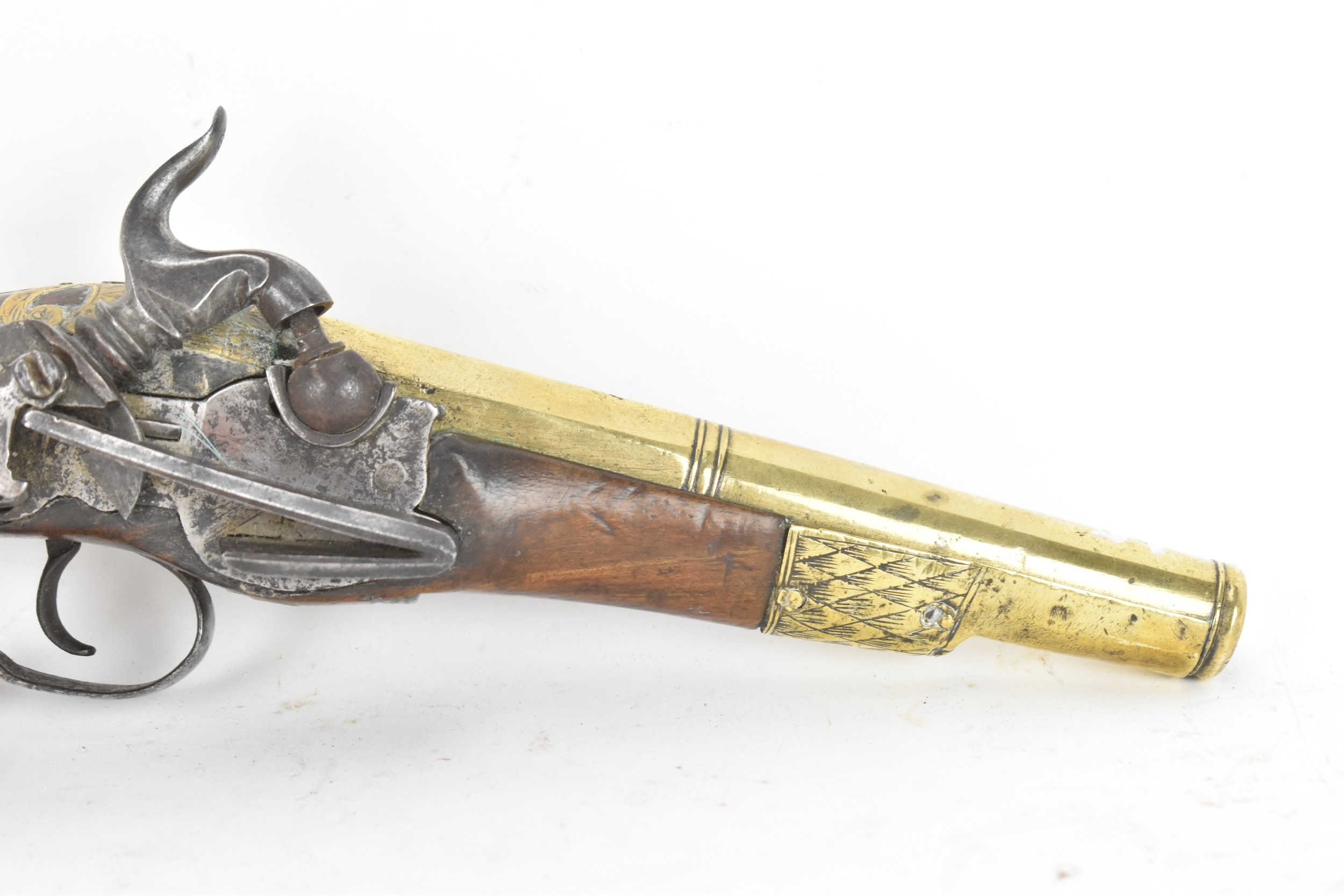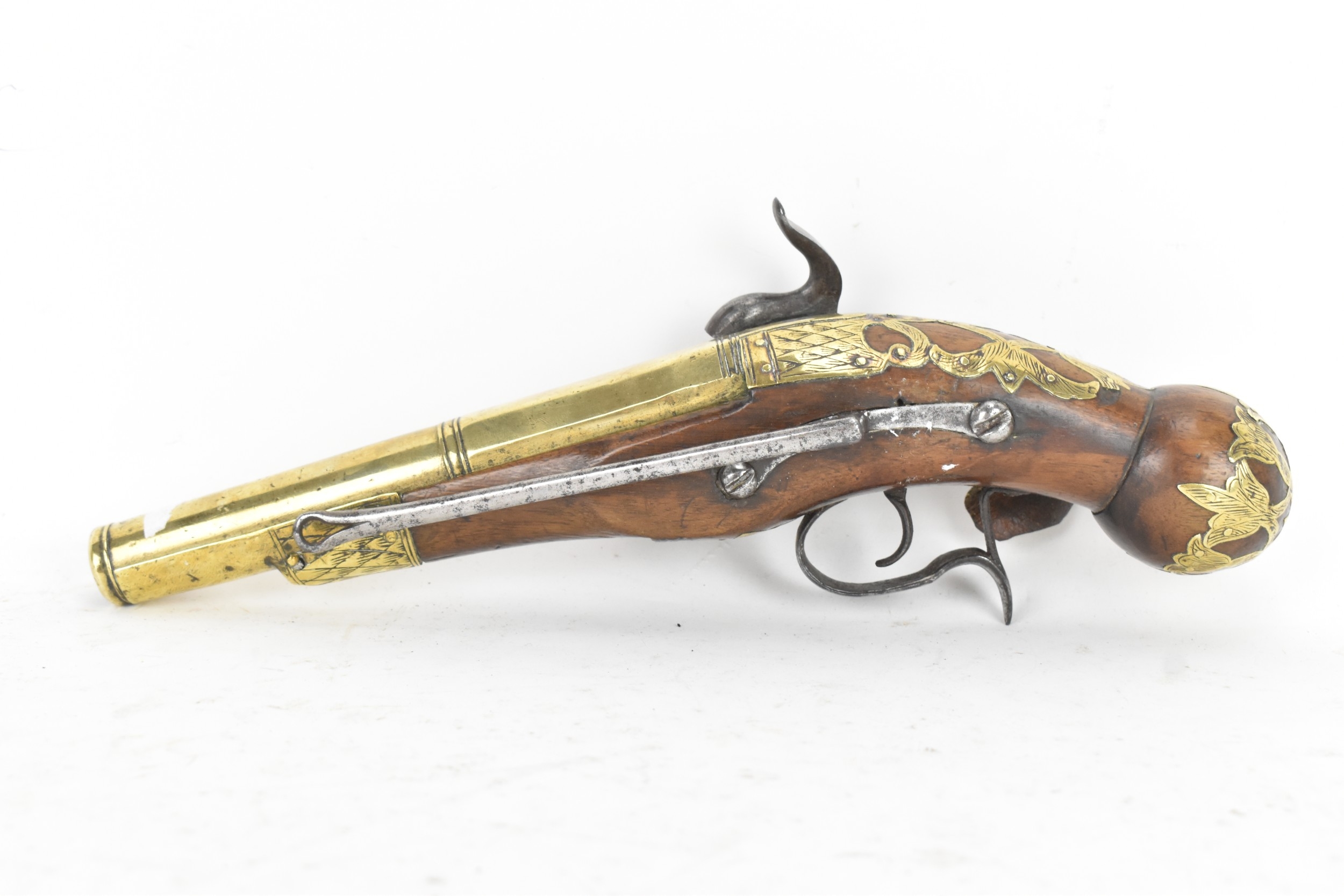 A late 18th/early 19th century Balkan or Ottoman flintlock pistol, with a brass barrel engraved with foliate motifs, iron lockplate and cock, the walnut stock inlaid with engraved gilt-brass scrollwork, with a domed butt and long iron trigger guard, 27cm total length