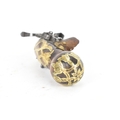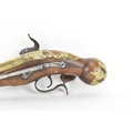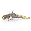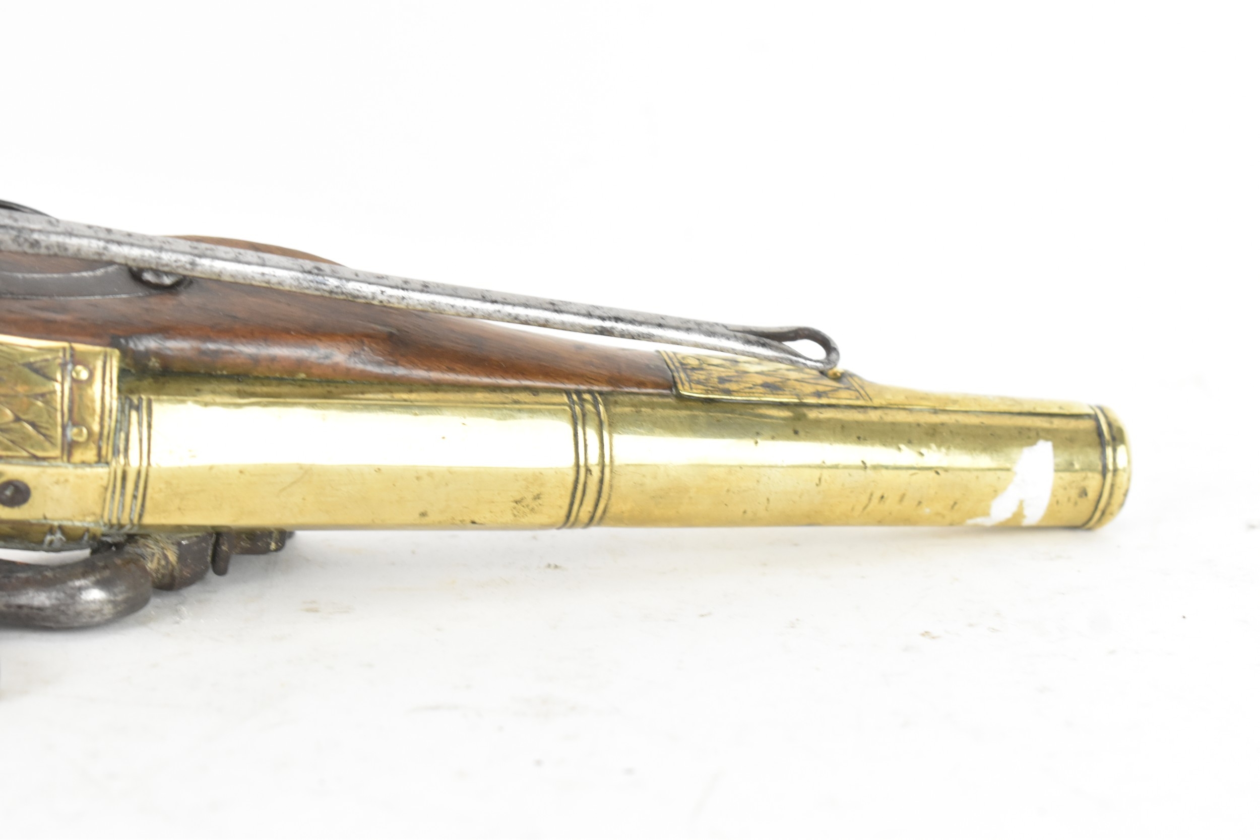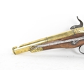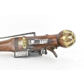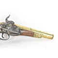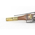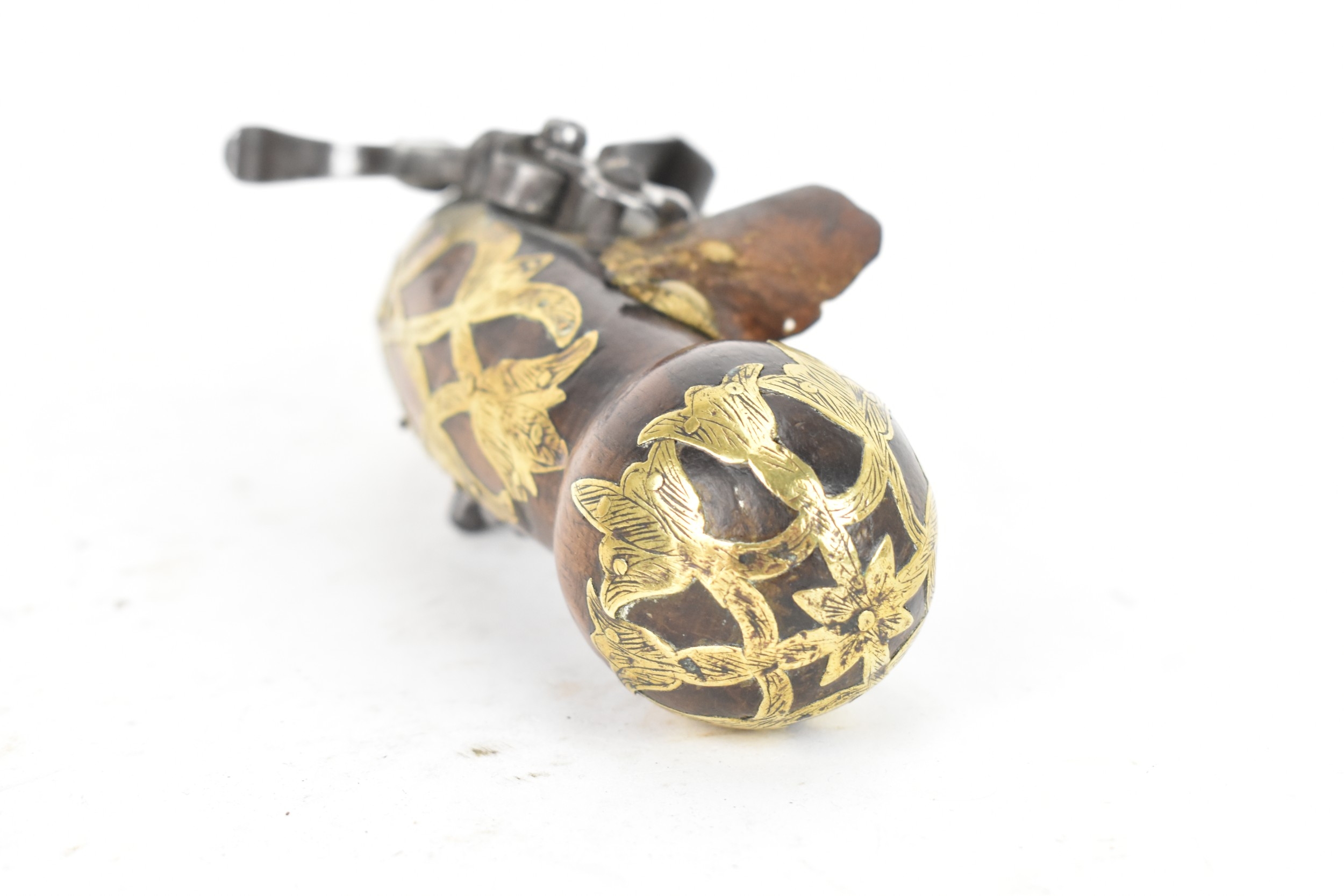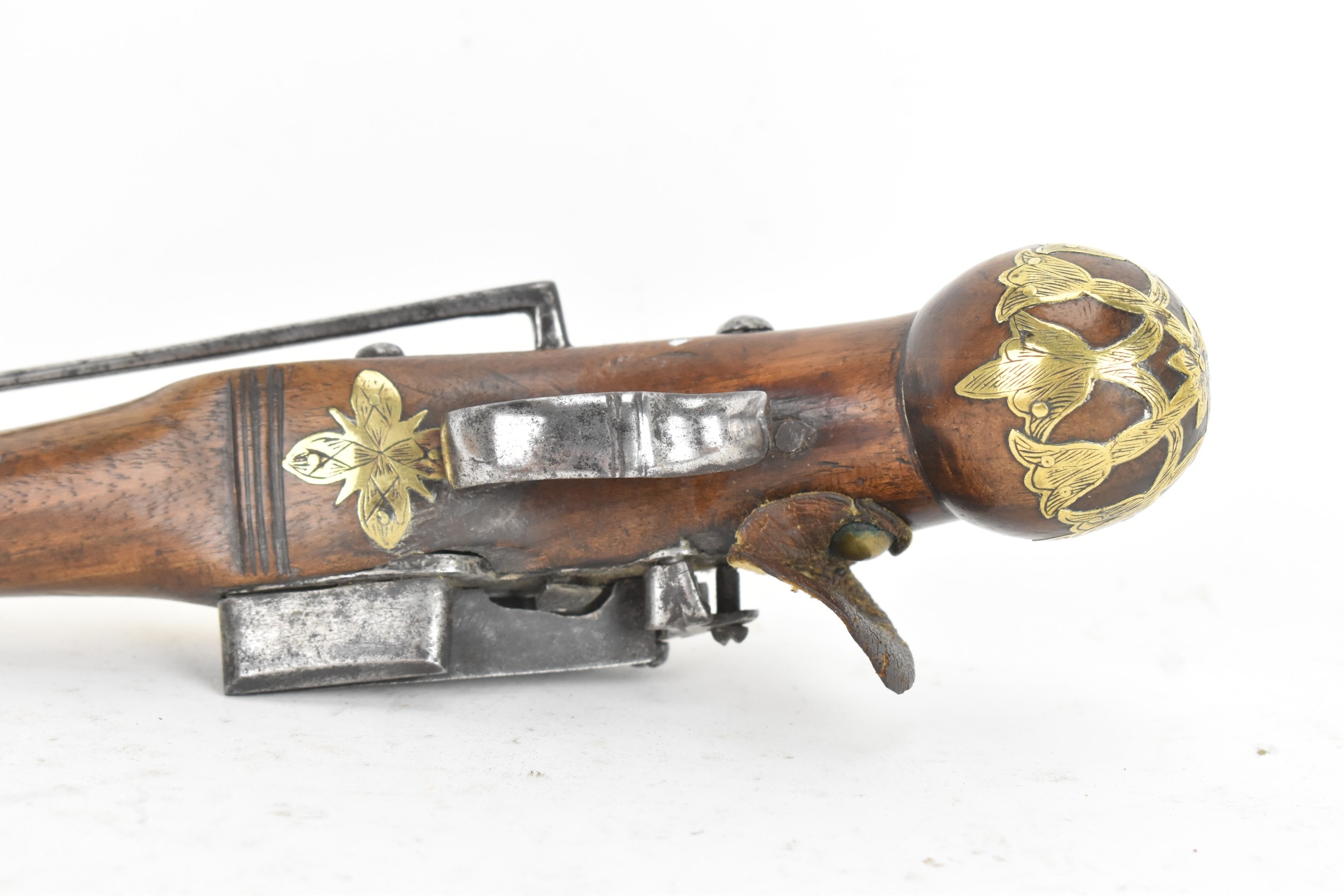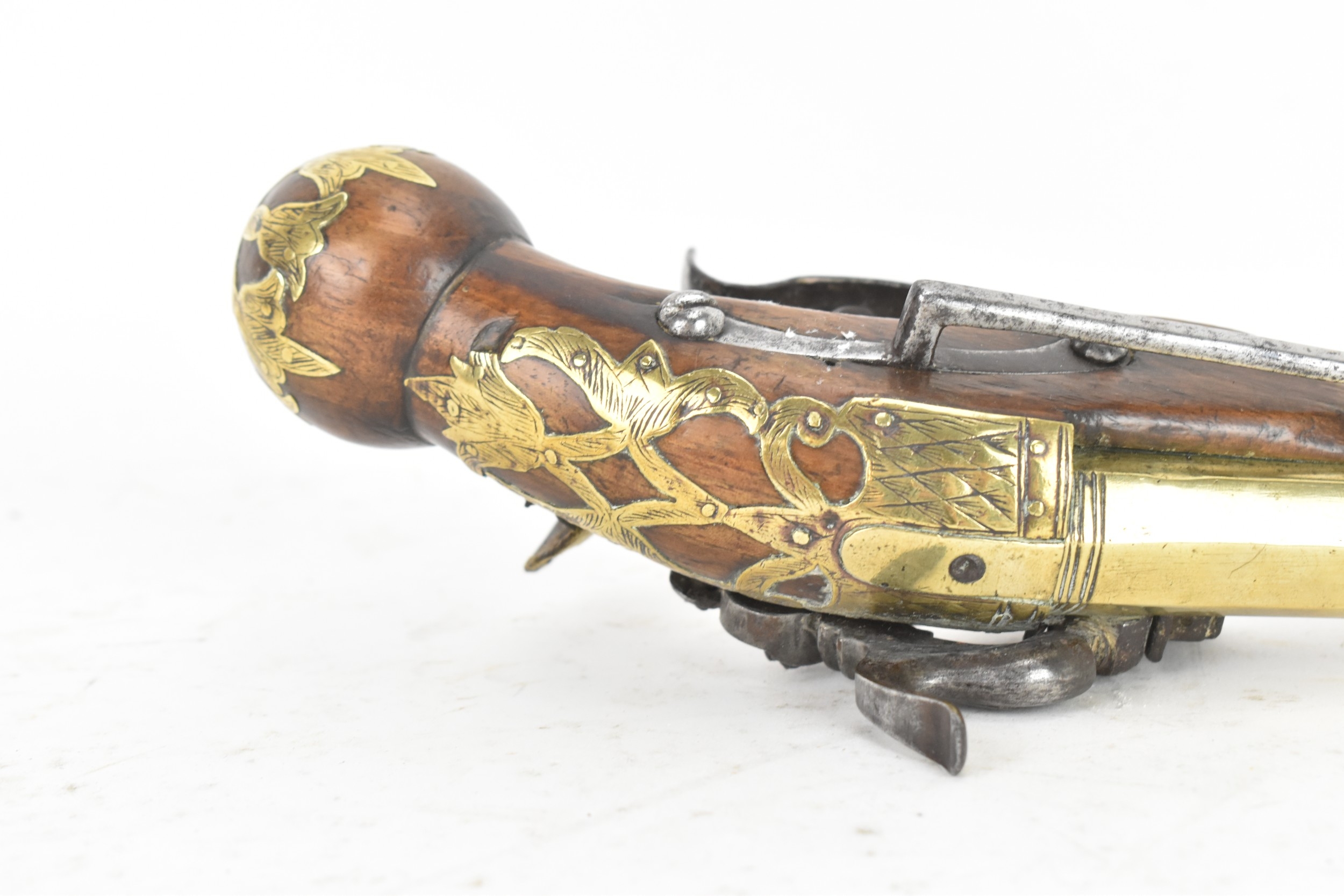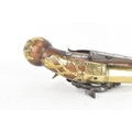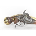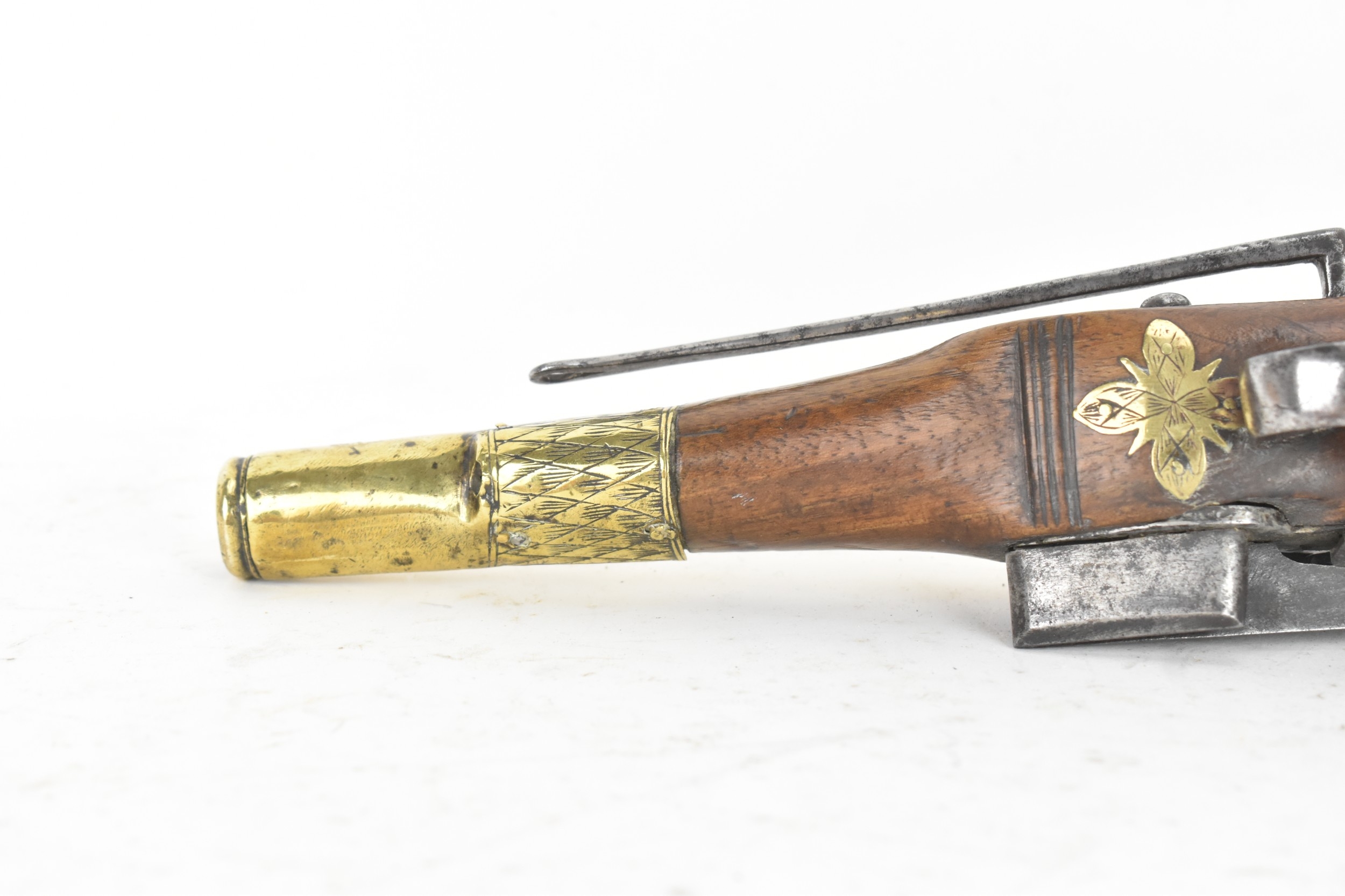 A late 18th/early 19th century Balkan or Ottoman flintlock pistol, with a brass barrel engraved with foliate motifs, iron lockplate and cock, the walnut stock inlaid with engraved gilt-brass scrollwork, with a domed butt and long iron trigger guard, 27cm total length