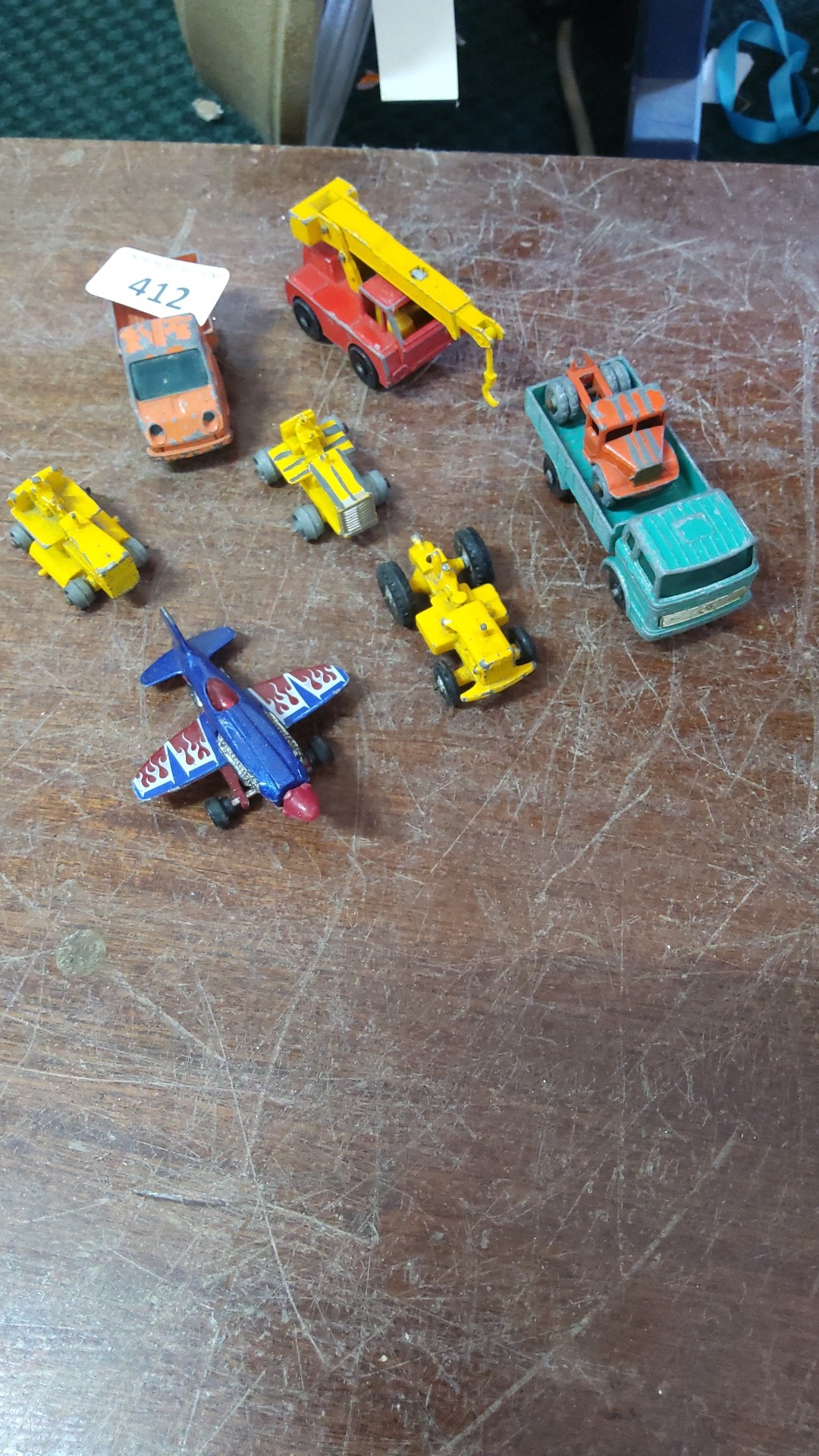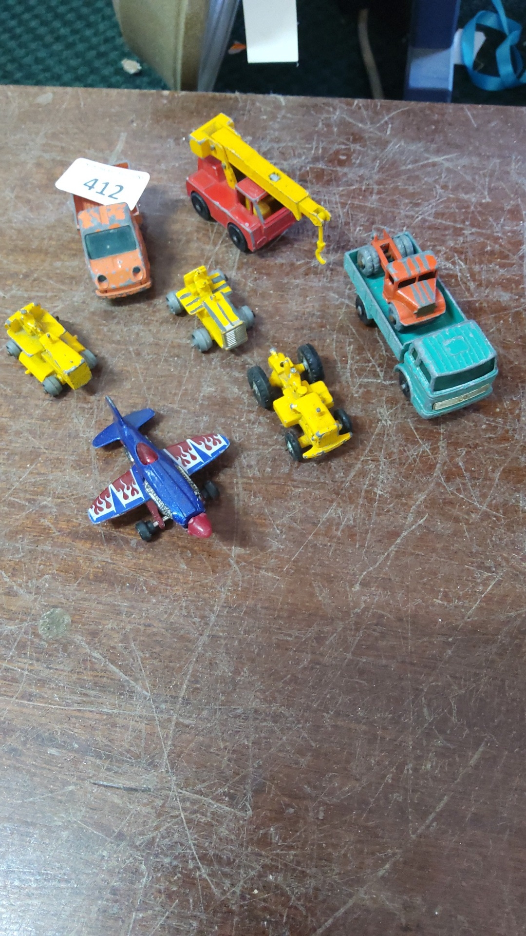 A group of die-cast toy vehicles and models including a crane lorry, flatbed truck with load, saloon car, two racing cars, a dragster, and a wheeled aircraft, in polychrome enamelled finishes.(Corgi & Matchbox included)