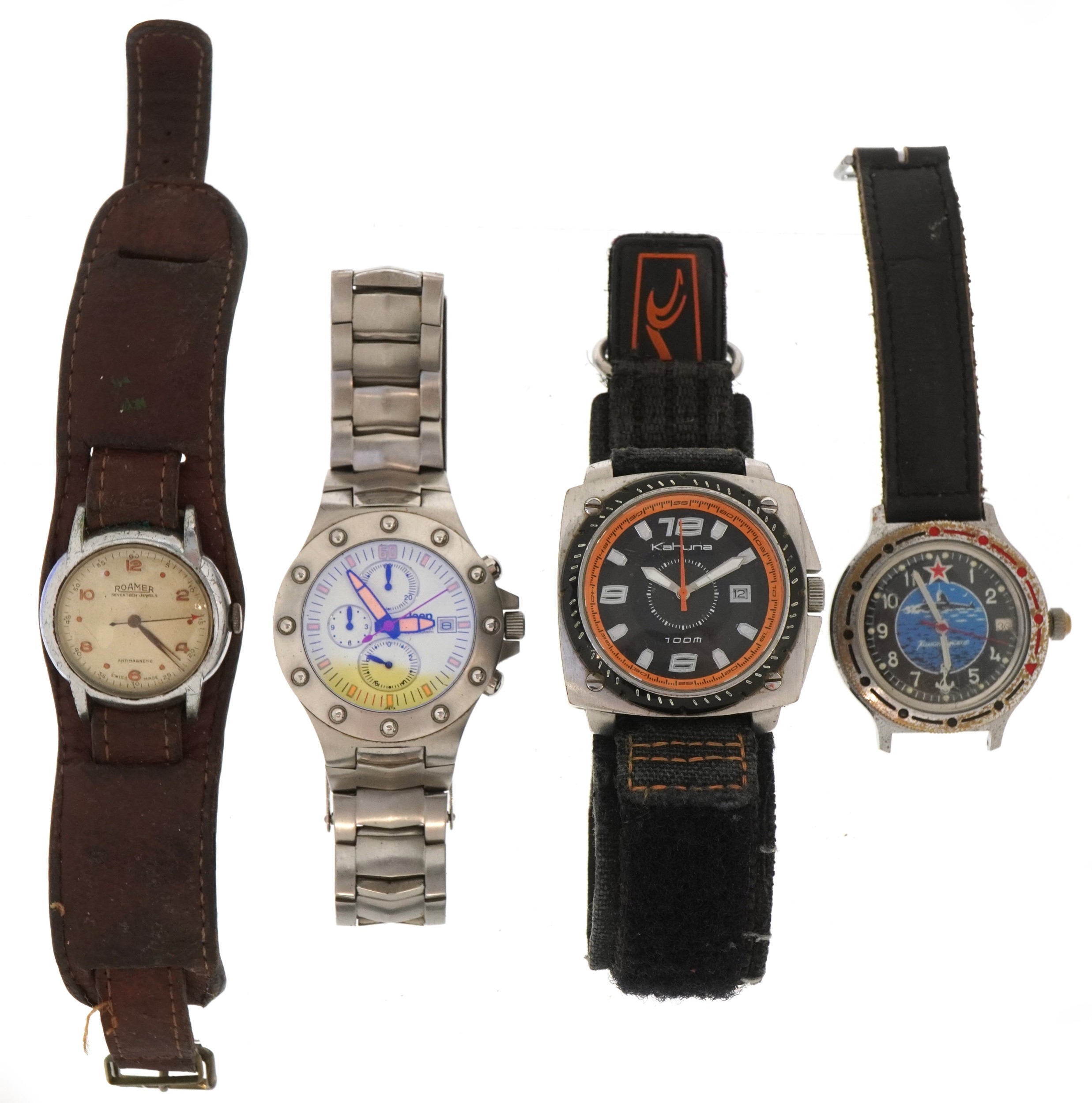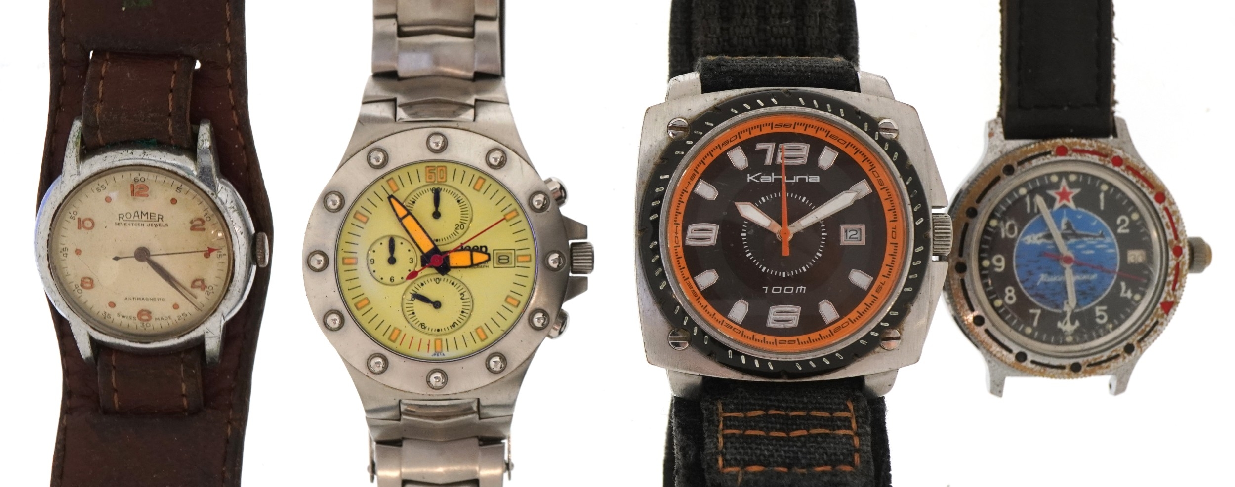 Four vintage and later wristwatches including a Russian example, Roamer and Kahuna.