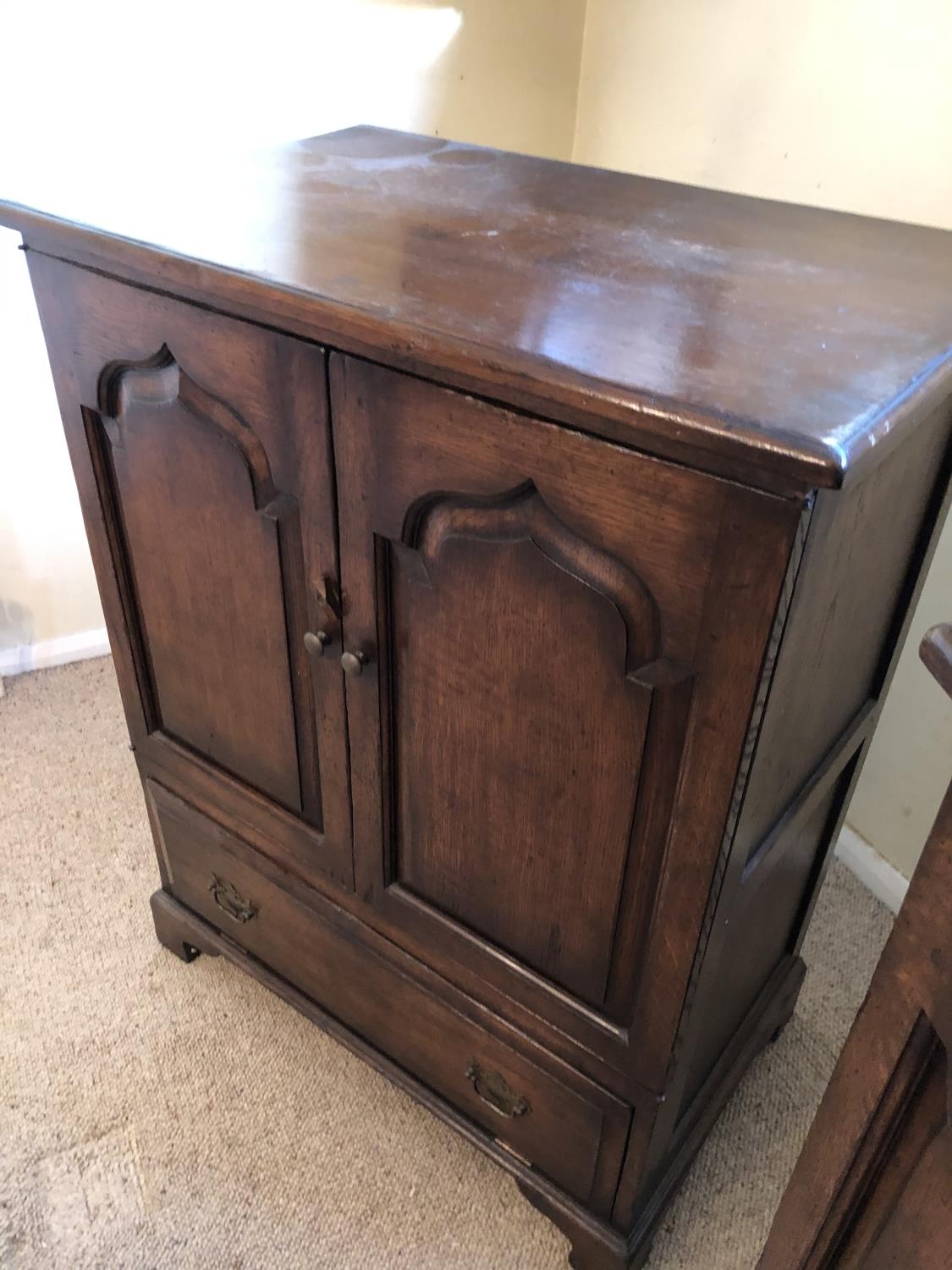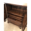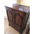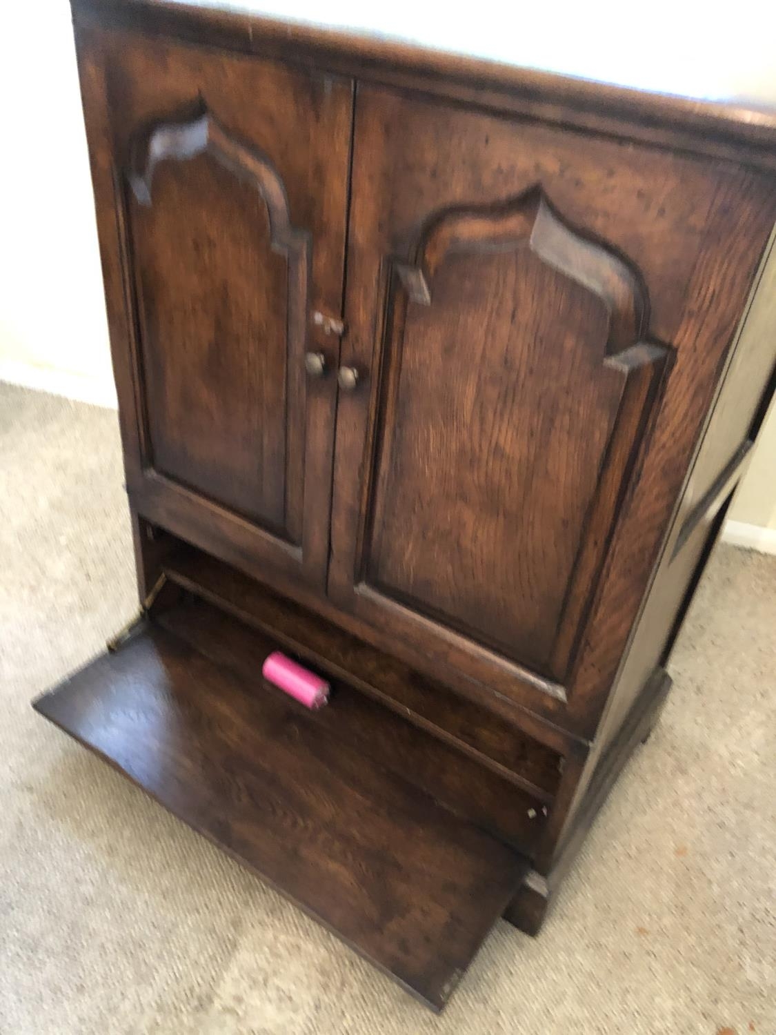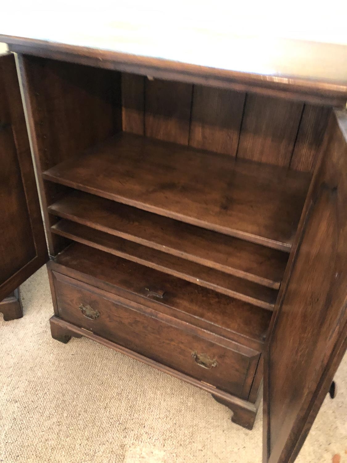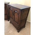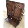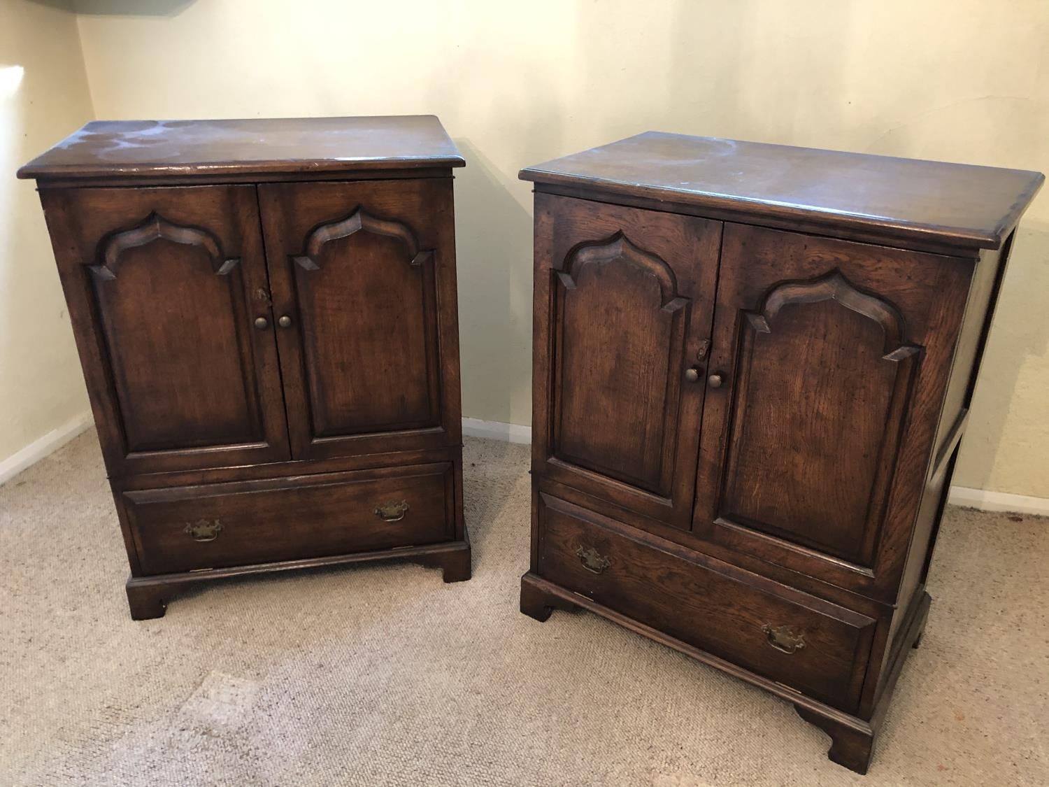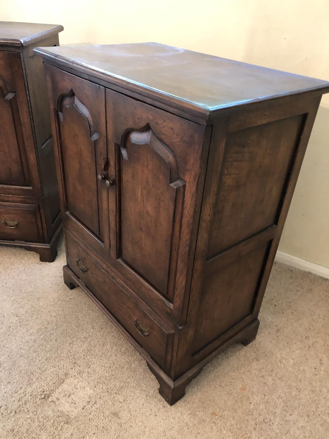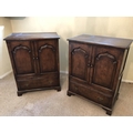 A pair of reproduction oak two door cupboards with panelled doors above a drop down flap to front 81x51x105