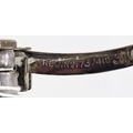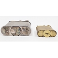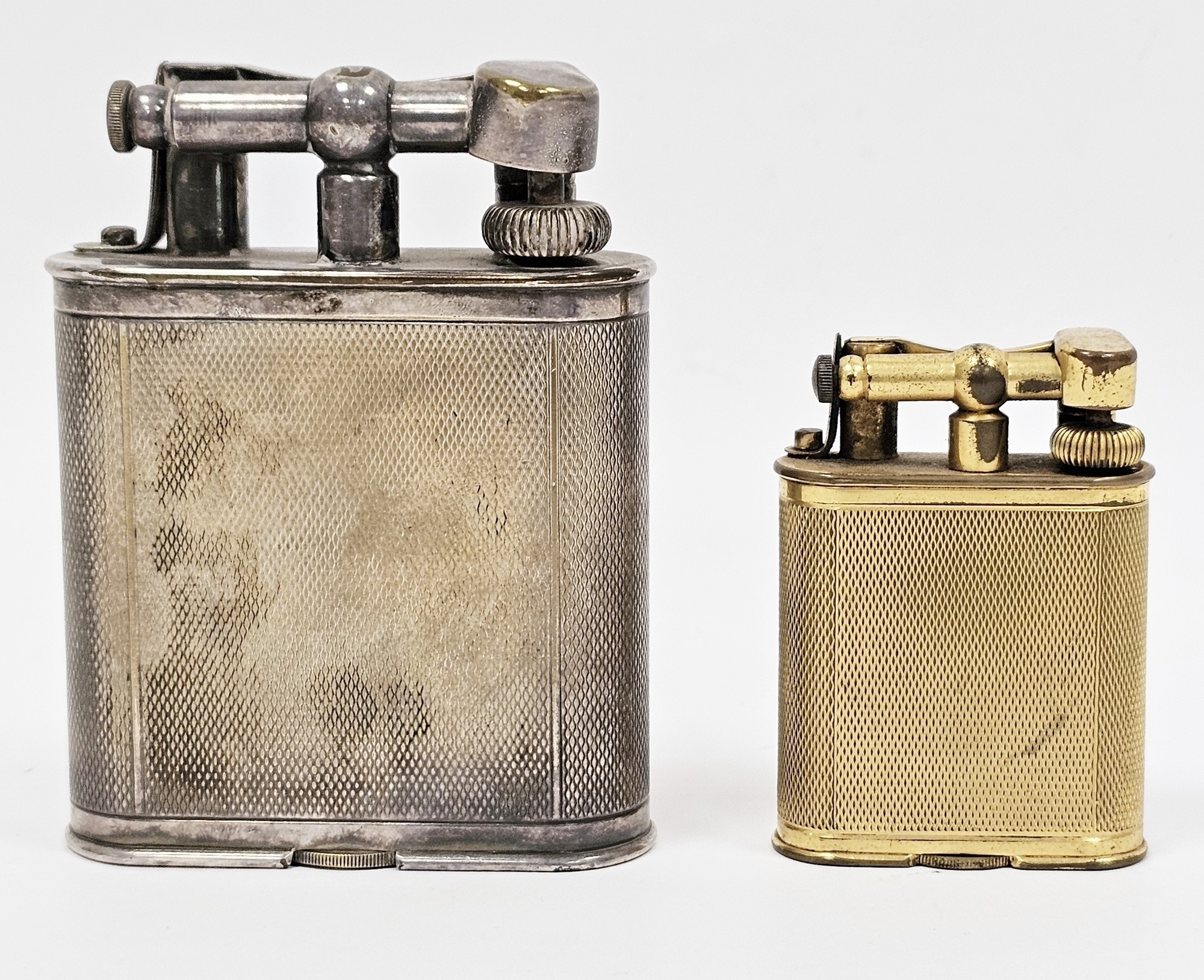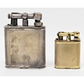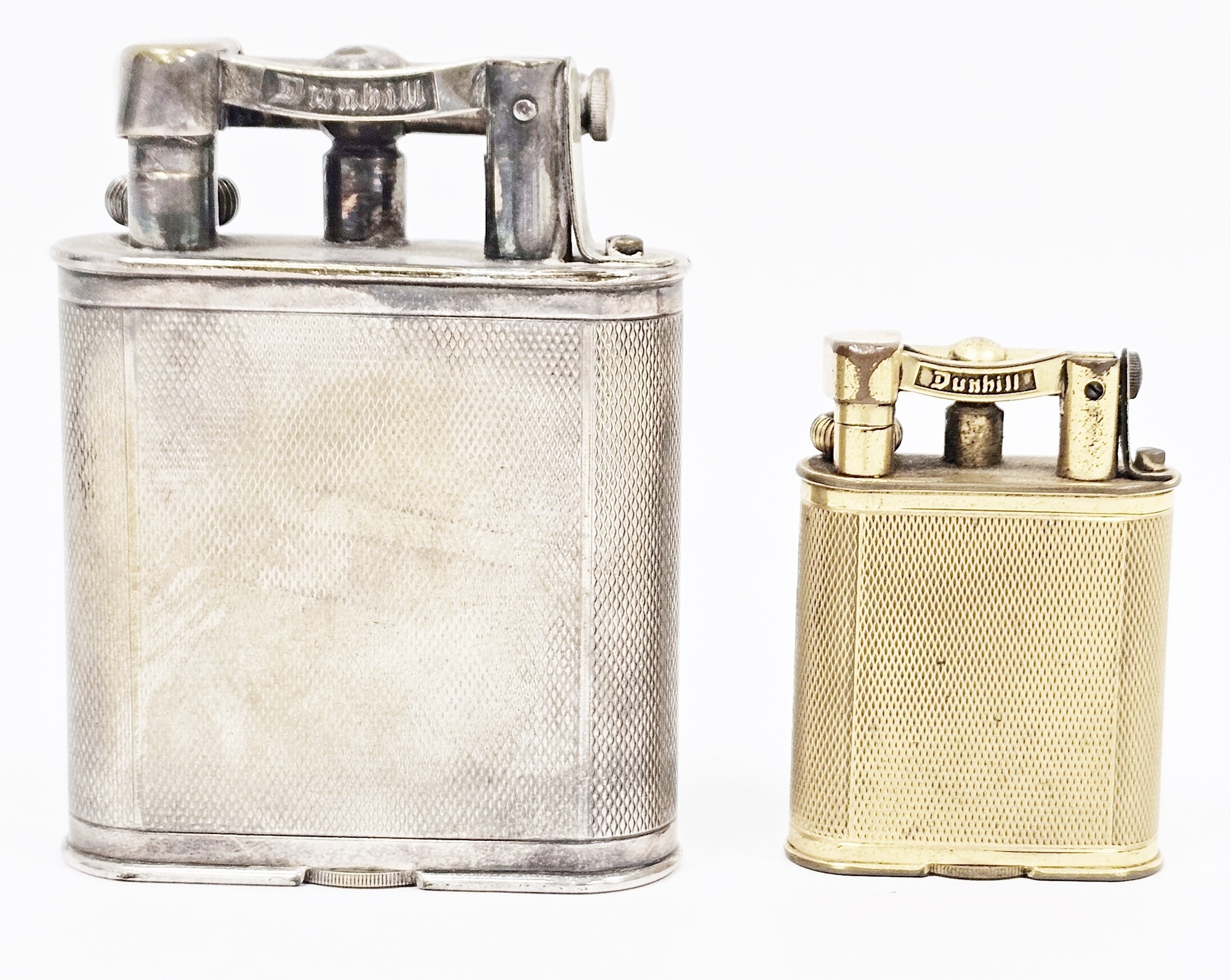 Two 1920's Alfred Dunhill lift-arm table lighters, one in a silver plated case and the other in a gilt metal case, both with engine-turned decoration and raised Dunhill mark to arm, silver plated lighter 11cm high, gilt lighter 7cm high (2)