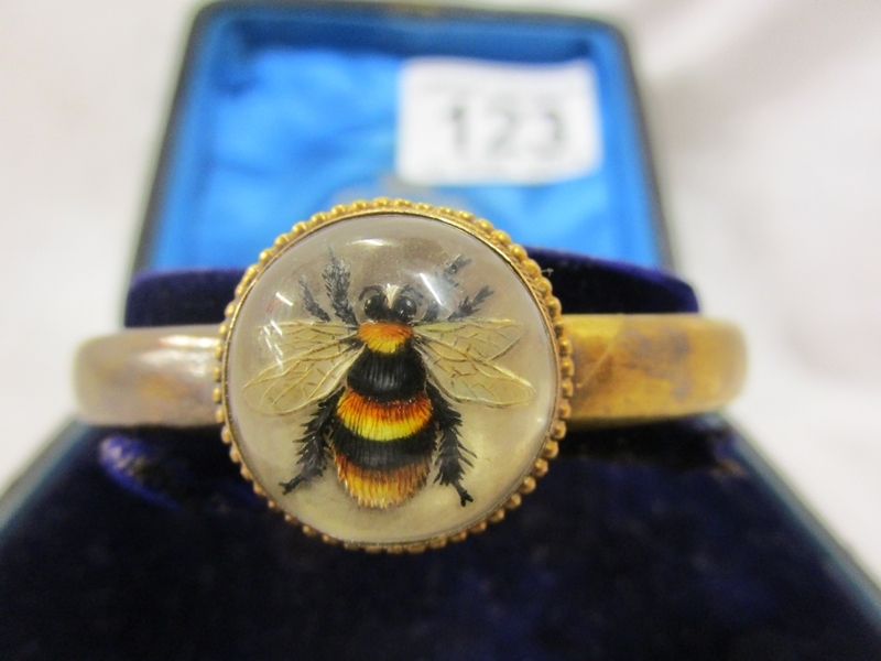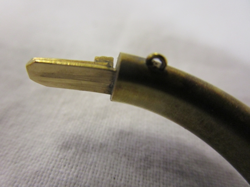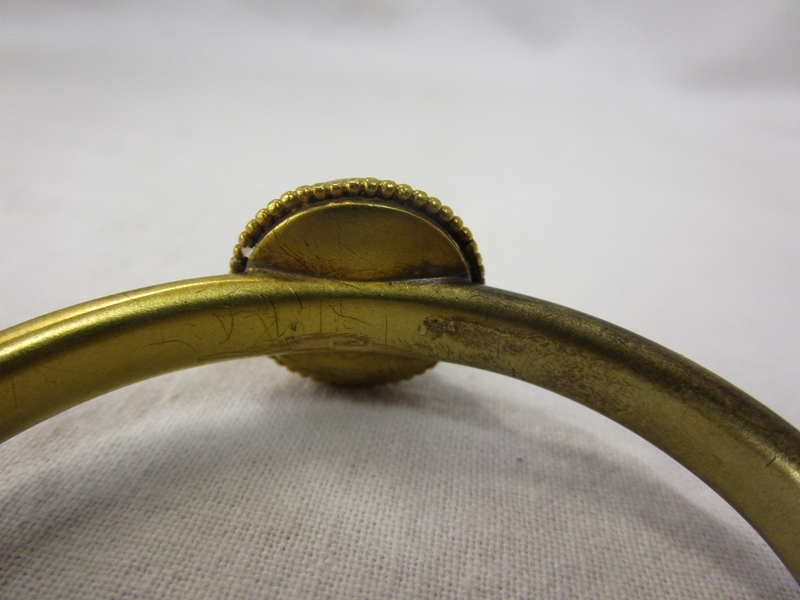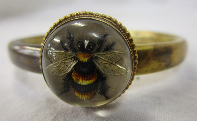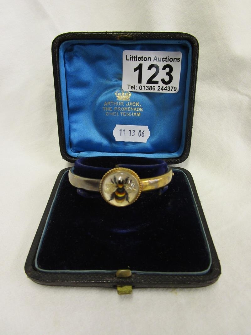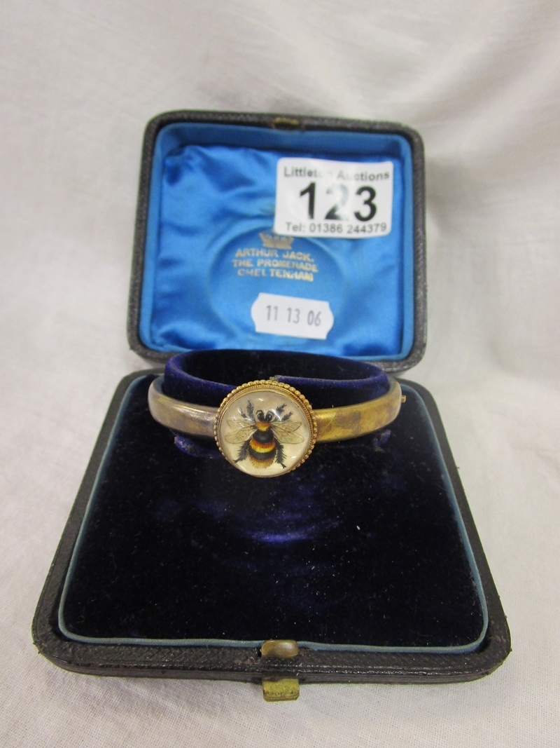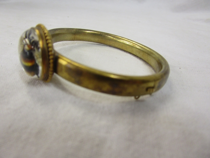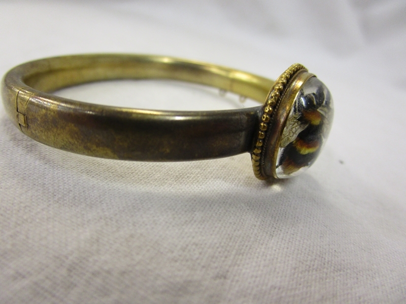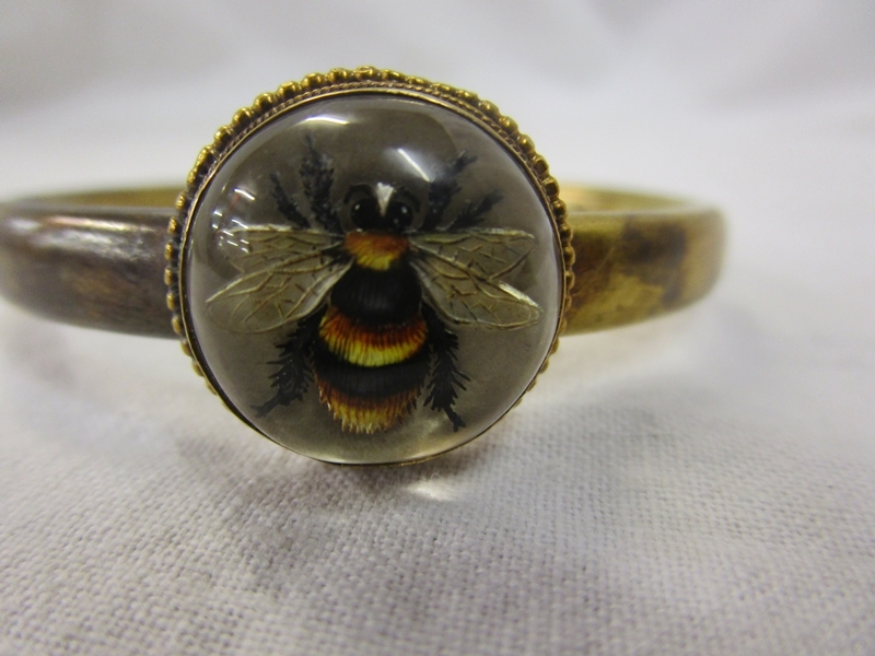 The bee does not look to me to be a real bee, however we are not sure. There are no hallmarks to show what the base metal is and the bangle does not have its safety chain present. The interior of the bangle is approx 5cm x 4cm. We have added extra images to show the condition in more detail