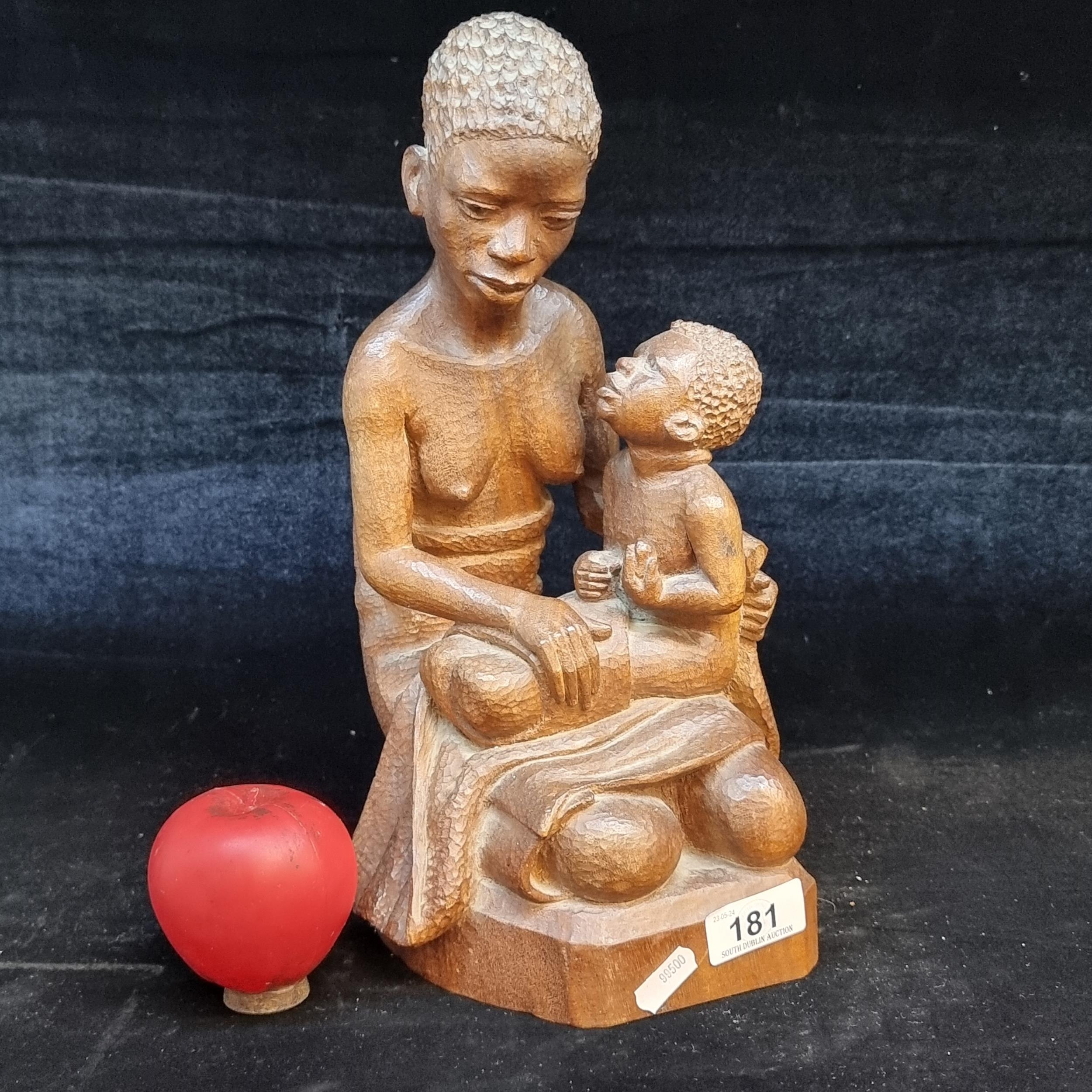 A wonderful hand carved wooden sculpture of an African Mother and Child. Signed 'Titous Mugari'. A nice unique piece of art clearly done by a very skilled sculptor.