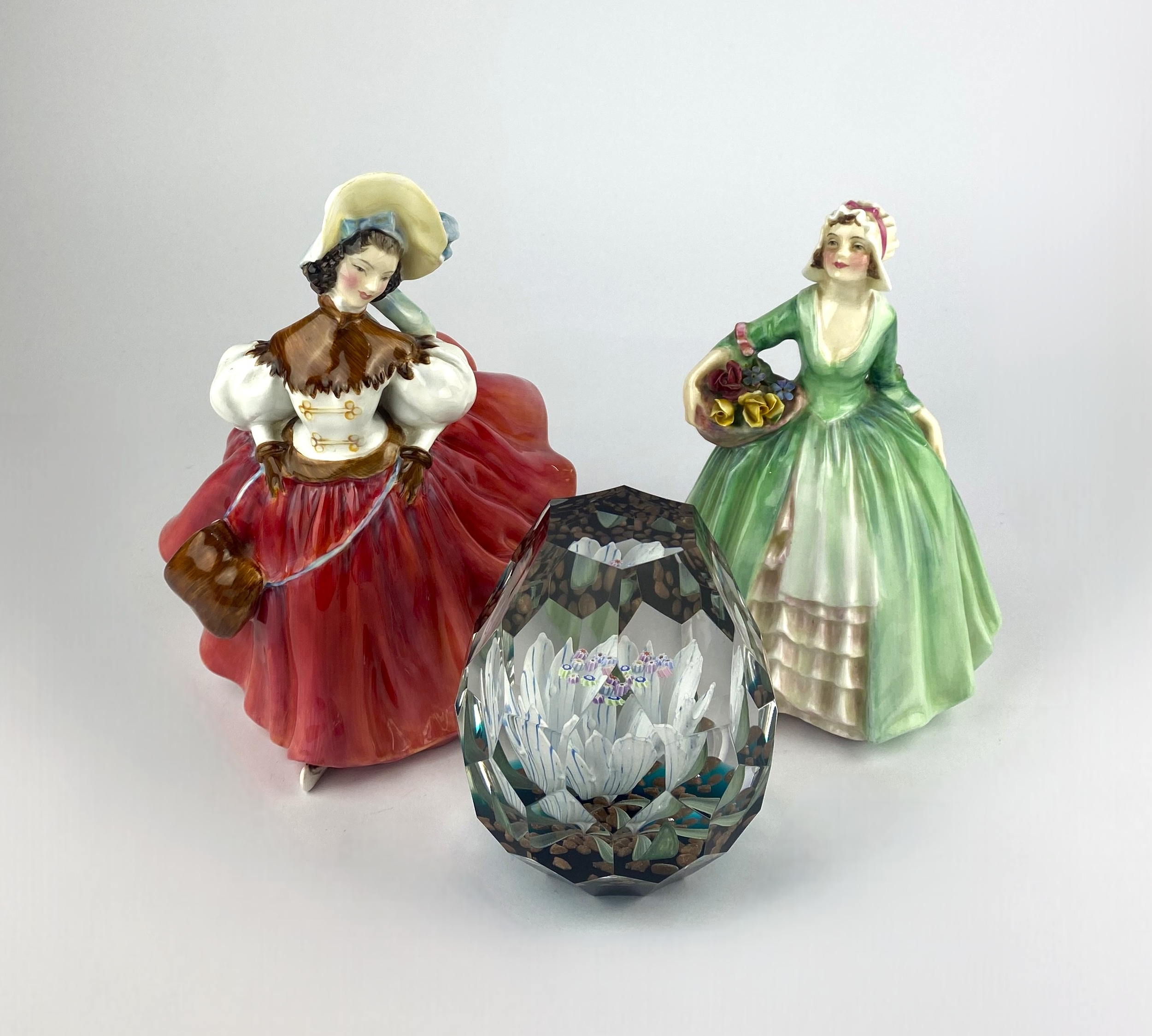 A Caithness 'Twilight Promise' limited edition glass paperweight, the base inscribed and numbered 15/75, 10.5cm high, together with two Royal Doulton models of ladies; 'Janet HN1737' and 'The Skater HN2117'