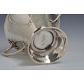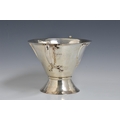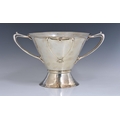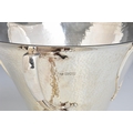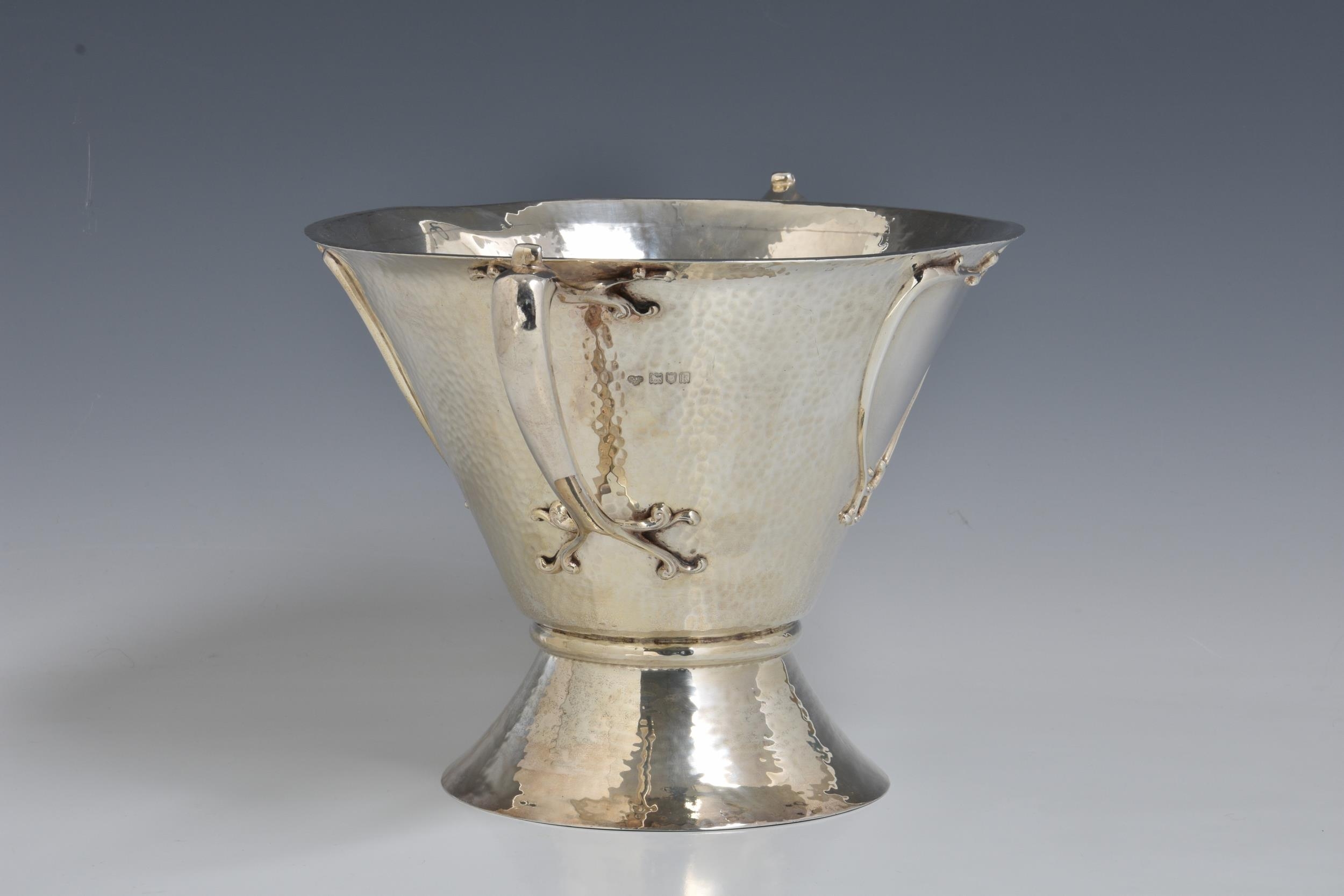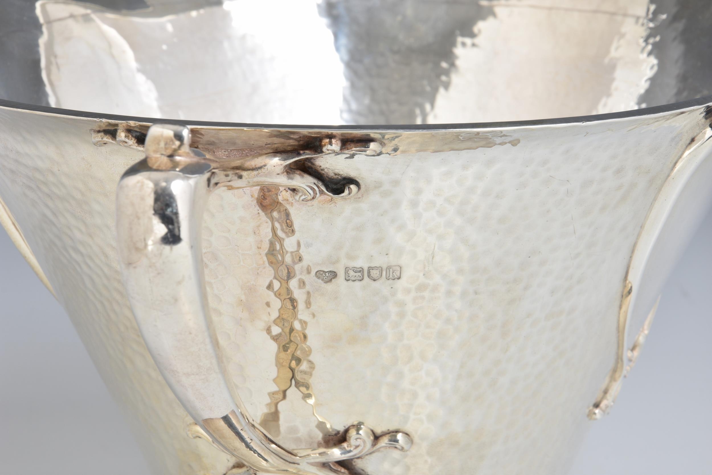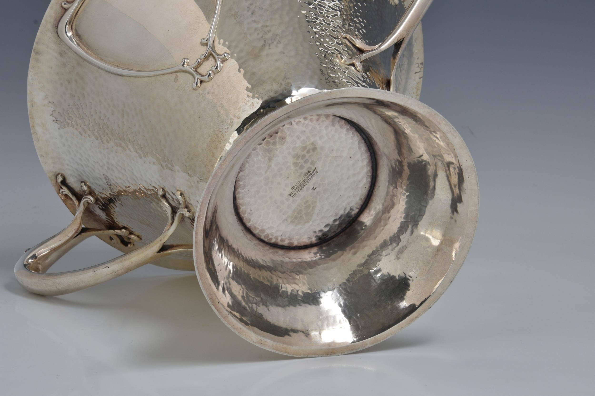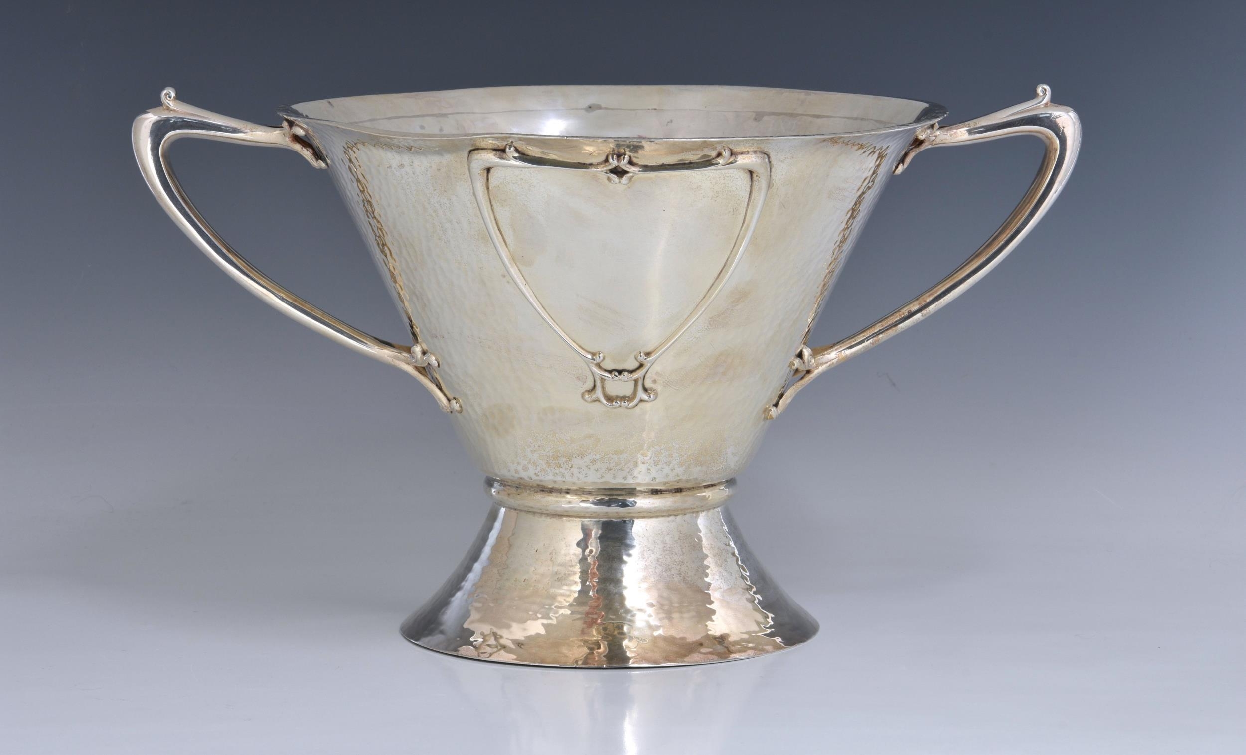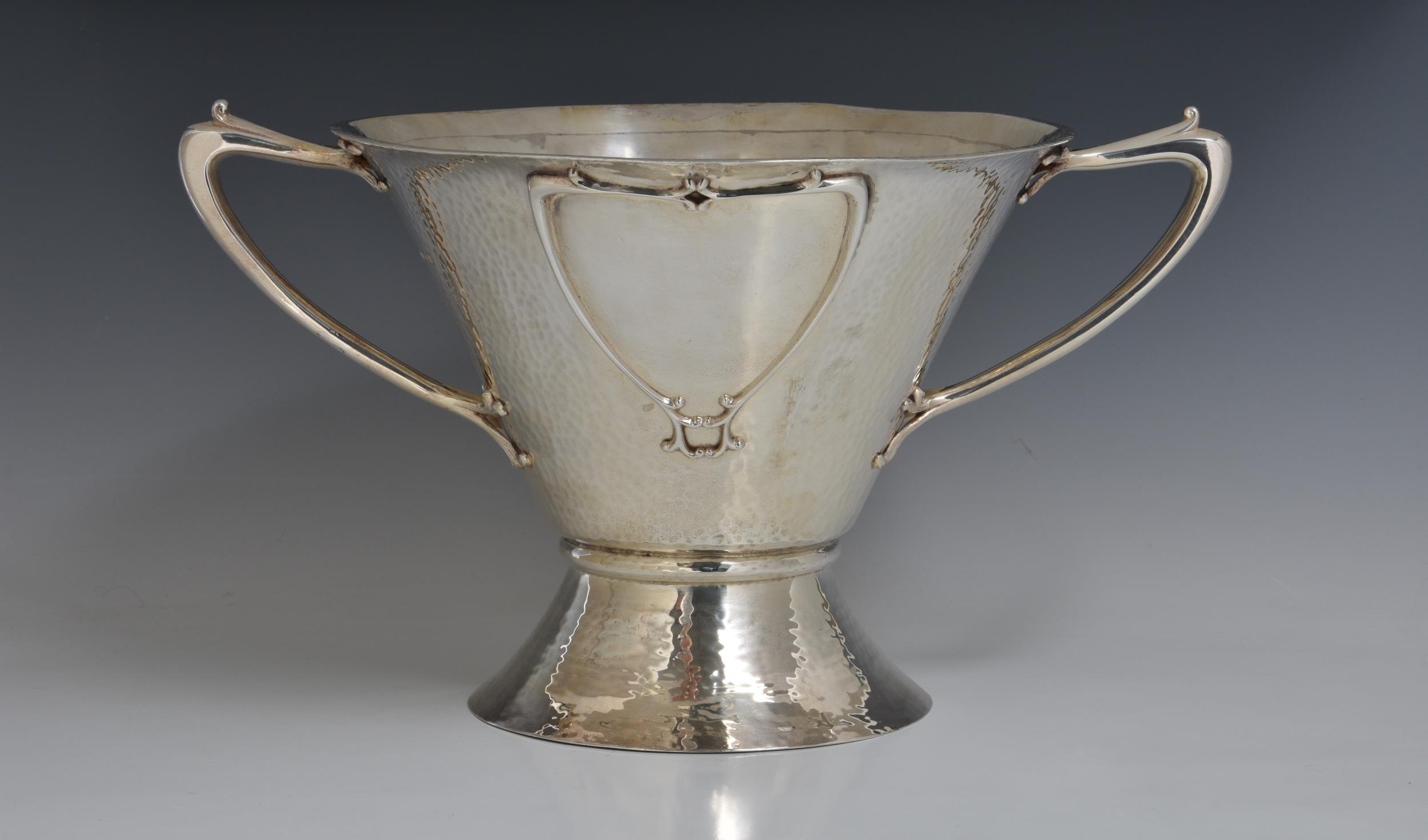 A rare Art Nouveau planished silver centrepiece / twin handle trophy bowl, Goldsmiths & Silversmiths Co Ltd, London, 1905, of conical form with organic twin bifurcated tendril handles, raised on spreading conical foot, having two stylised heart shaped vacant cartouche, one to either side, retail stamp to underside 'GOLDSMITHS & SILVERSMITHS COMPANY 112 REGENT STREET. W', 14¼in. (36.3cm.) handle to handle, 8¼in. (21cm.) high, heavy gauge, weight 52.58 tr.oz.. * Shallow dent to rim in one area, otherwise very good.