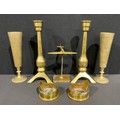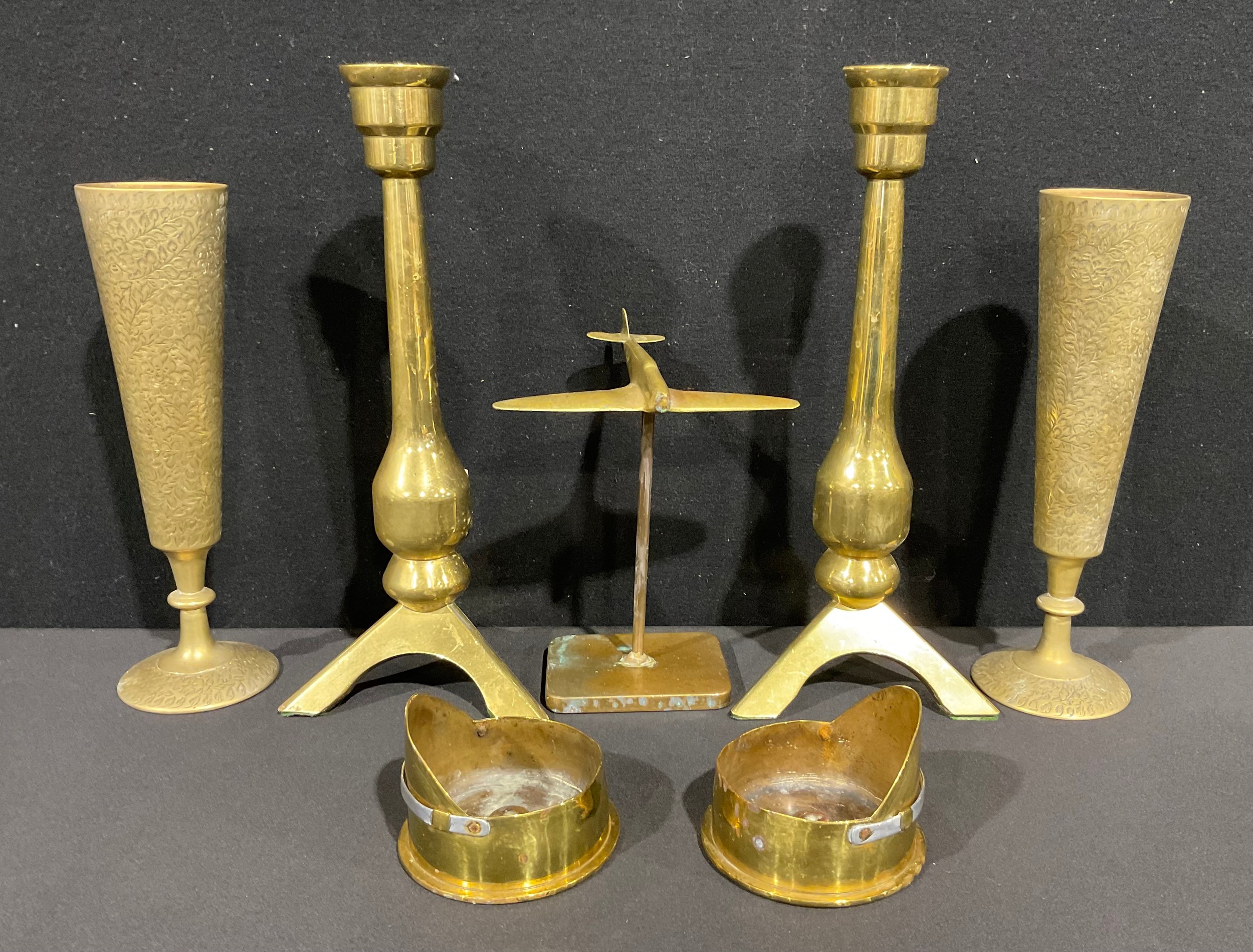 A pair of Brass rocket form candlesticks, tripod base, 30.5cm high, Trench Art shell case Cap shaped trinket trays, etc (7)