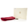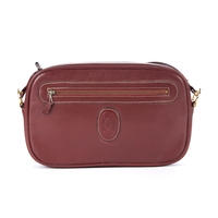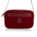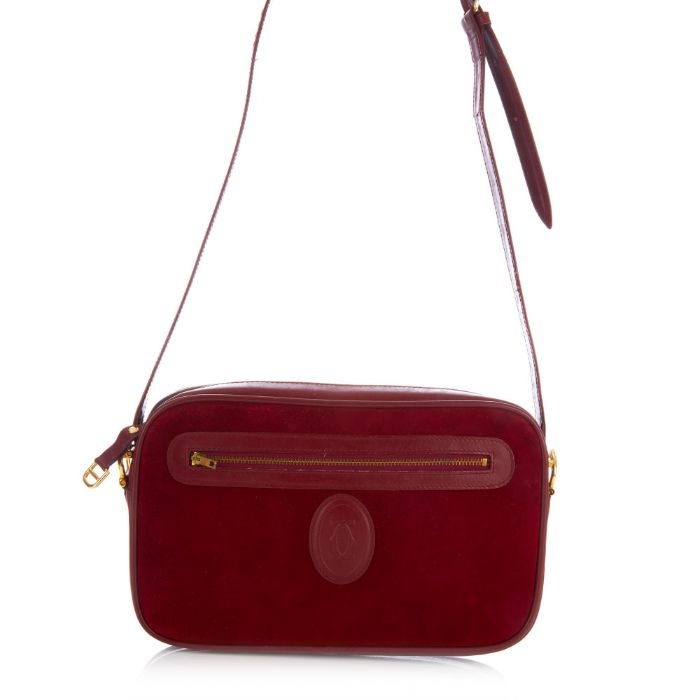 Cartier, a vintage Bordeaux camera bag, crafted from burgundy suede with smooth burgundy leather trim, featuring maker's logo emblem to the centre front, with one front zip pocket, adjustable leather crossbody strap and a top zip fastening, measuring 5 by 16 by 26.5cm, with maker's dust bag and box