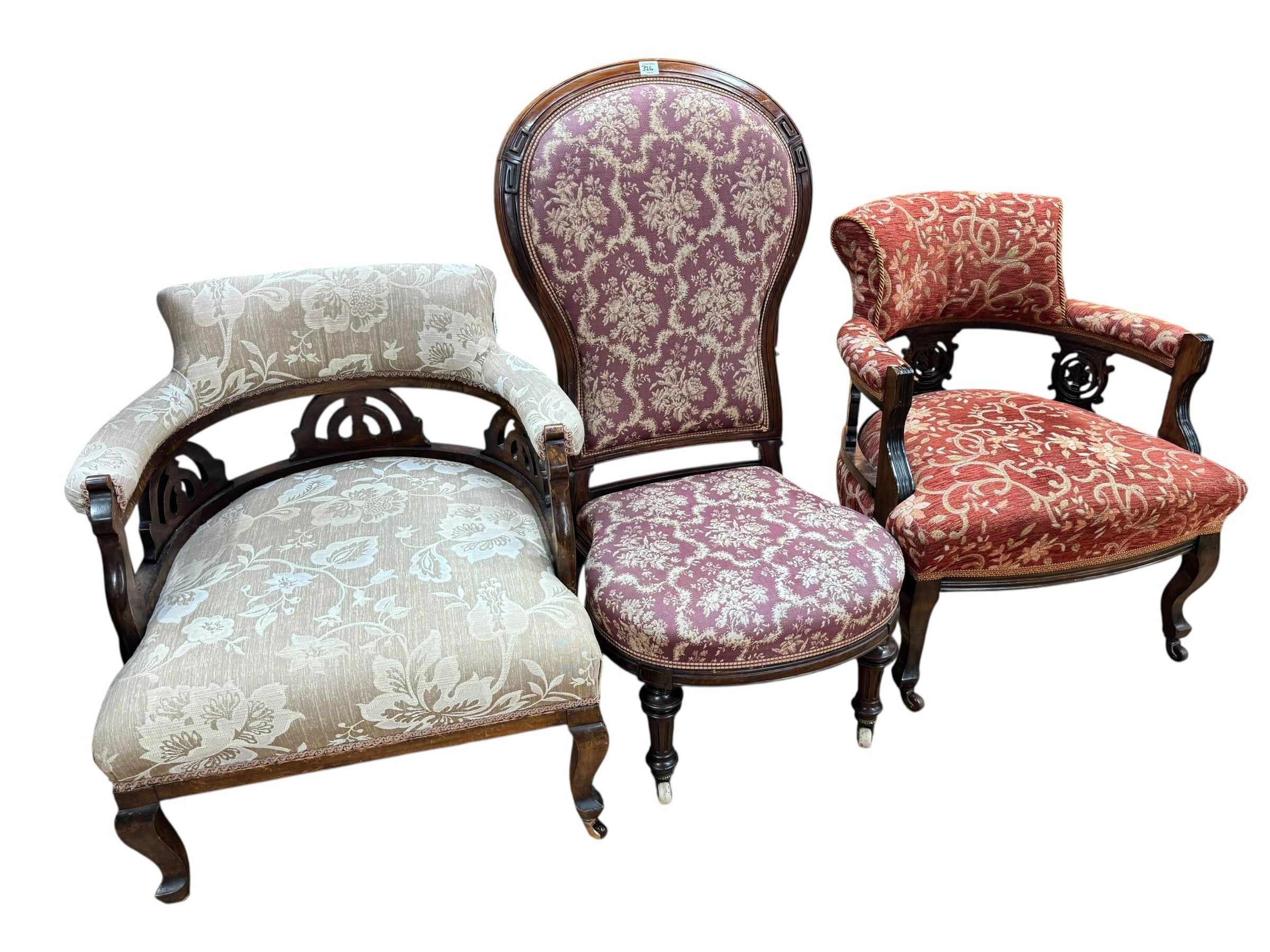 Victorian mahogany spoon back nursing chair and two late Victorian tub armchairs (3).