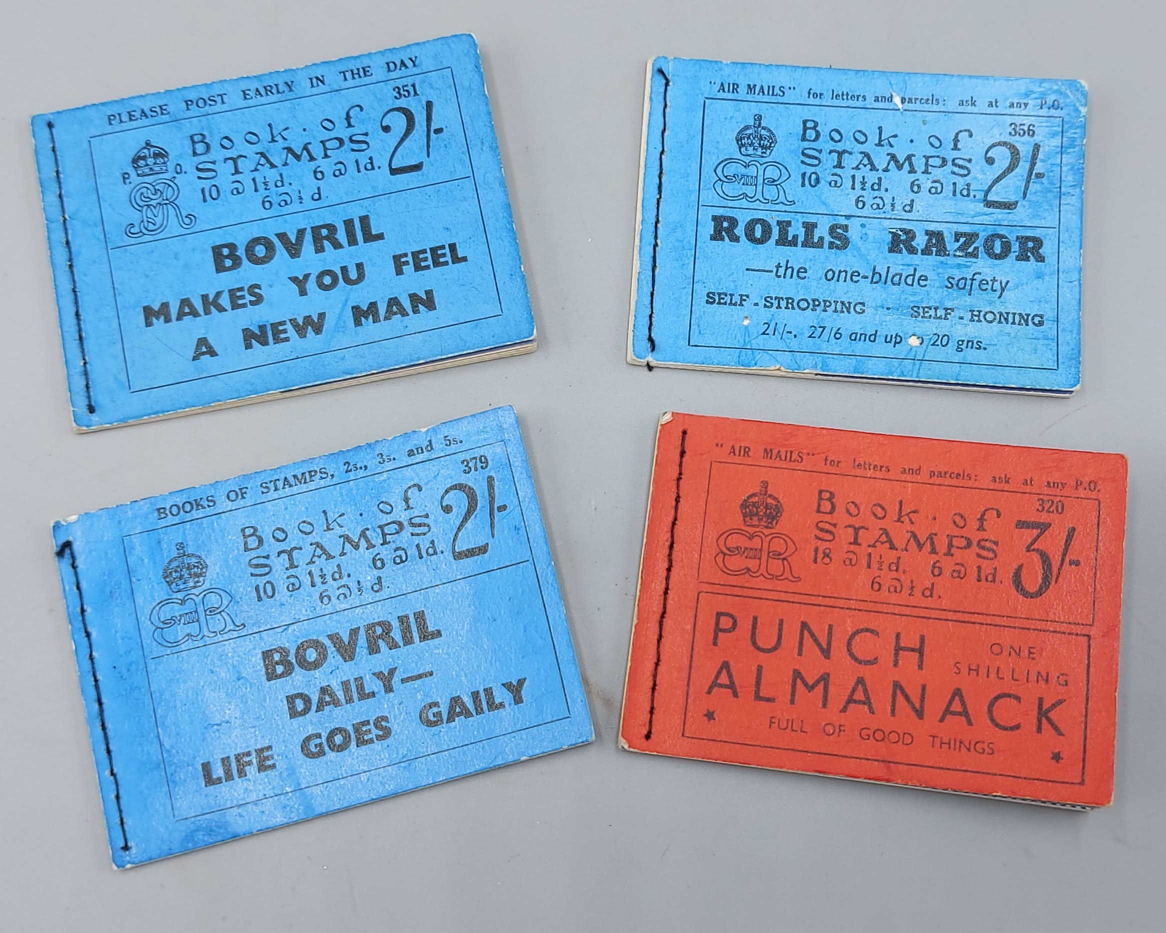 A King George V blue 2/- stamp booklet, Bovril, together with two King Edward VIII blue 2/- booklets and a red 3/- booklet
