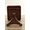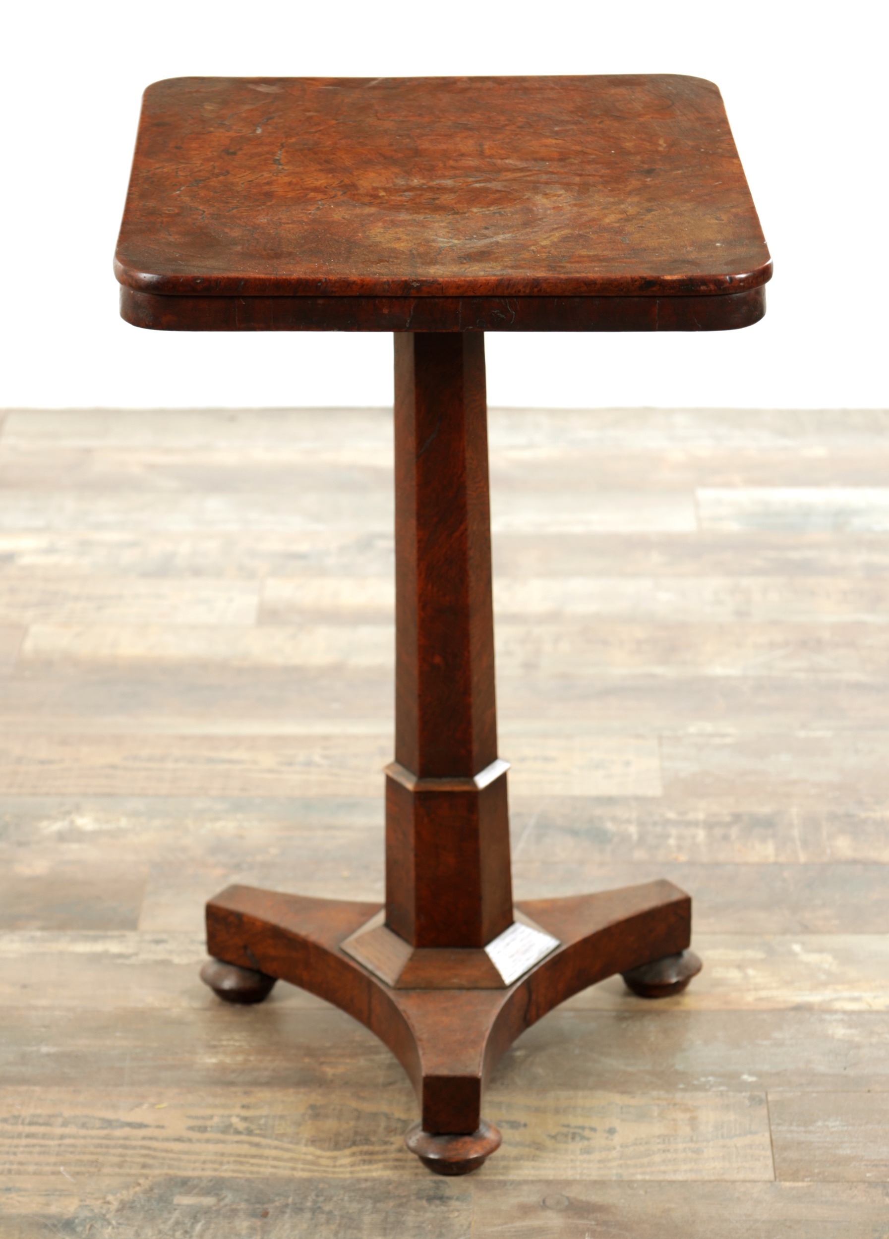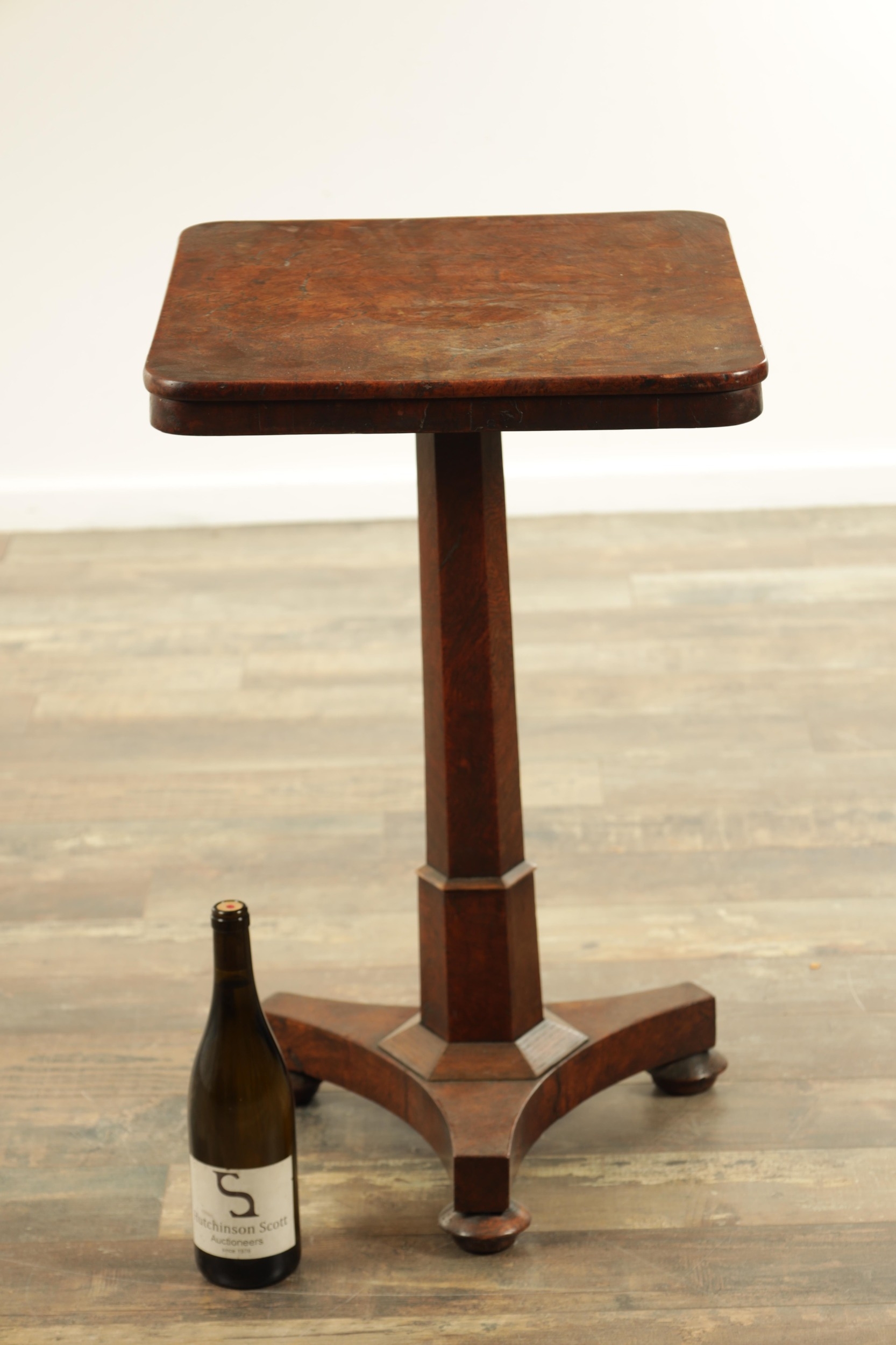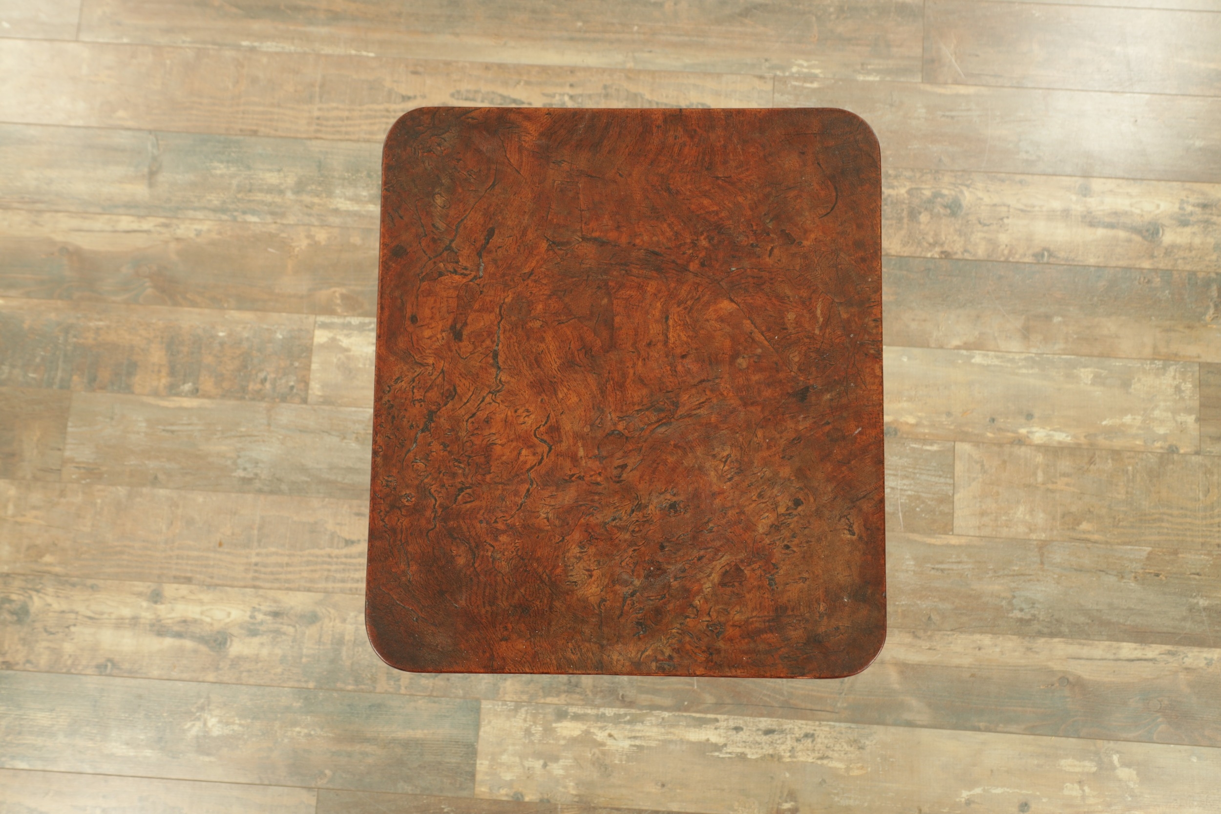 A REGENCY BURR ASH OCCASIONAL TABLE the hinged square top above a hexagonal shaped stem with platform base and bun feet. (44cm wide, 50cm deep, 71cm high )