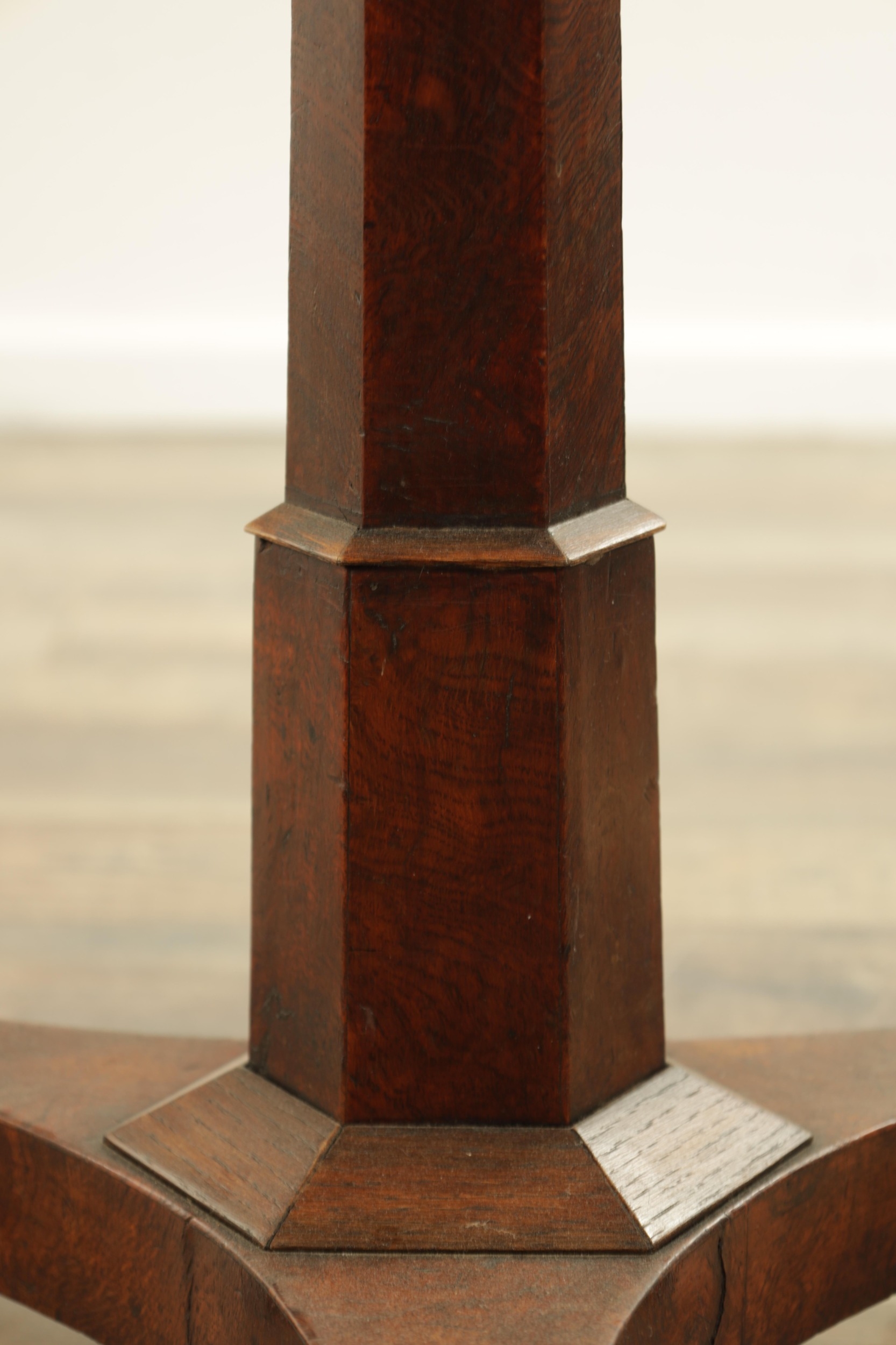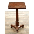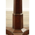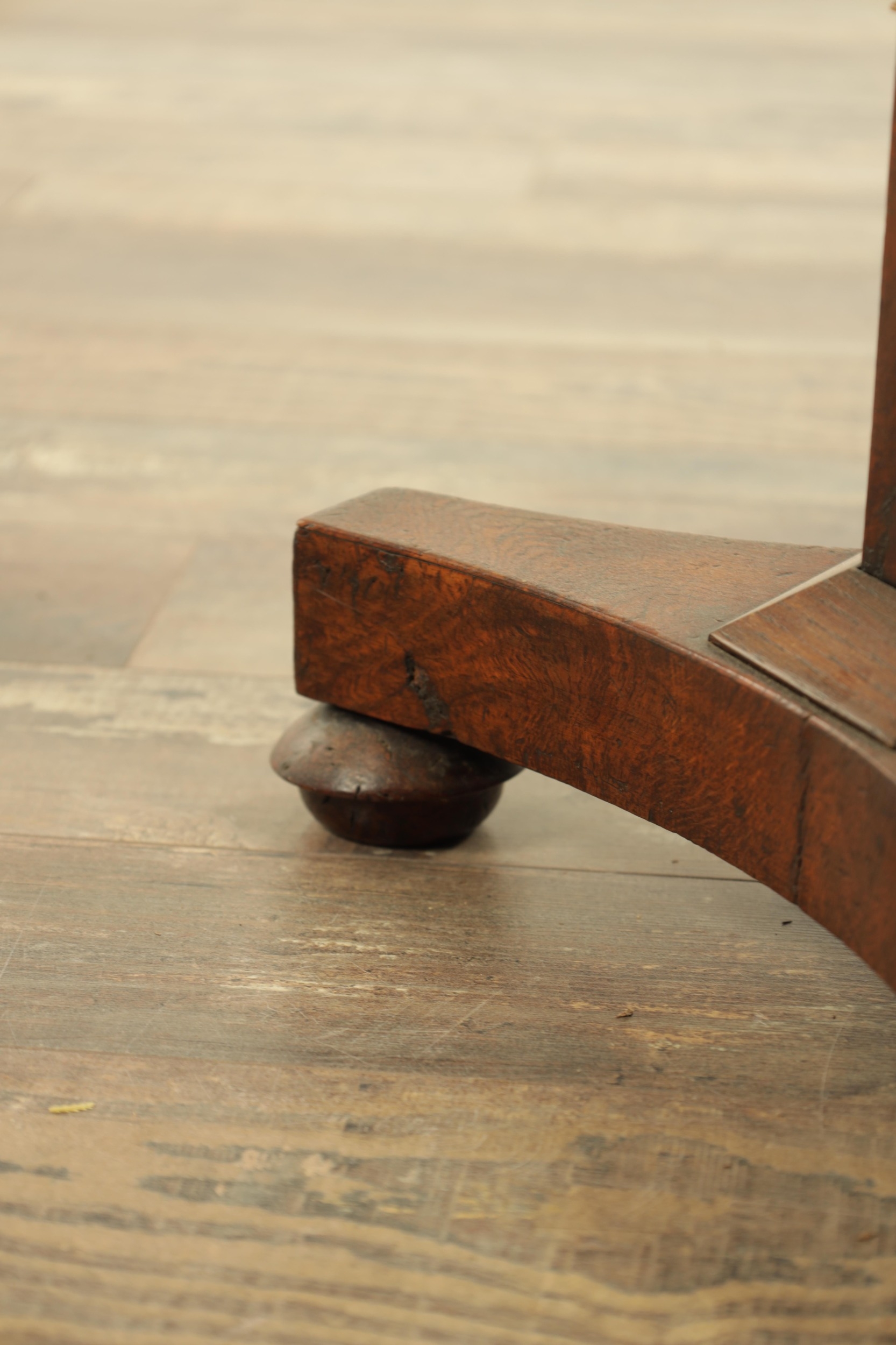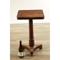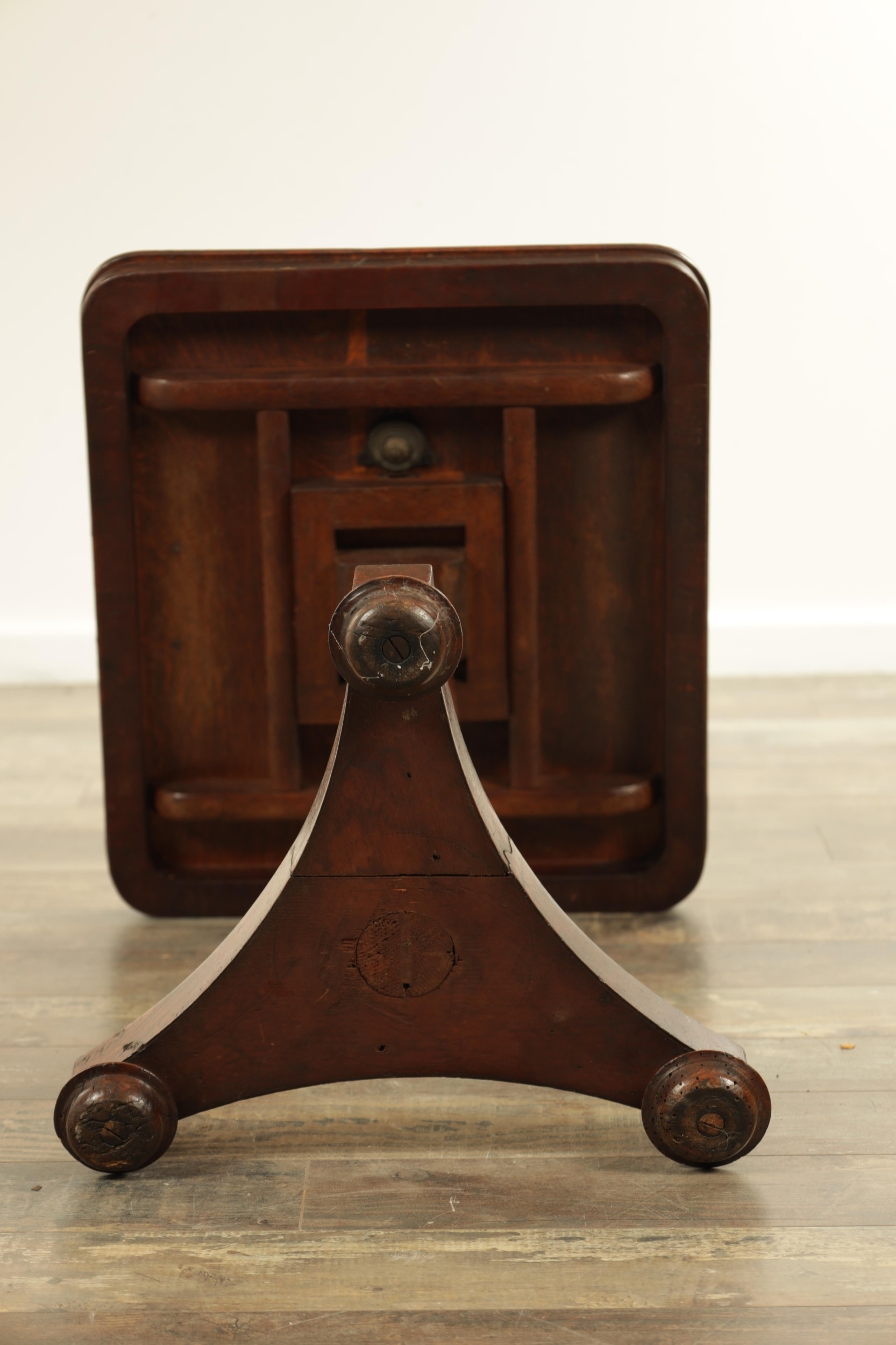 A REGENCY BURR ASH OCCASIONAL TABLE the hinged square top above a hexagonal shaped stem with platform base and bun feet. (44cm wide, 50cm deep, 71cm high )