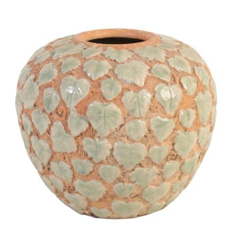 A JAPANESE CERAMIC VASE OF GLOBULAR FORM, carved with a vine leaf design highlighted in celadon glaze, on an unglazed pale terracotta ground, 13cm high