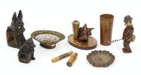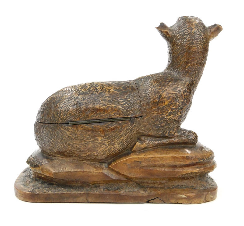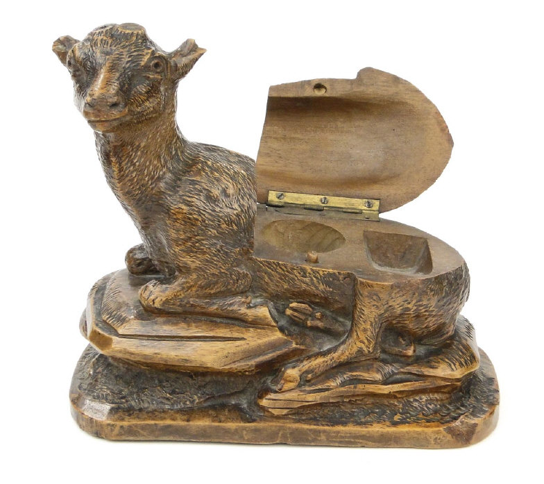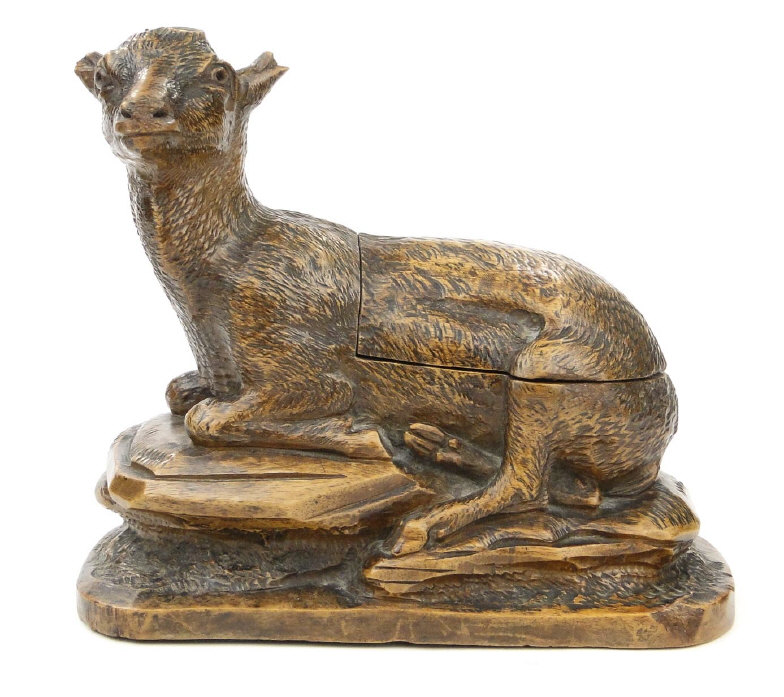 Black Forest style carved recumbent lamb desk stand with hinged body, 20cm in length