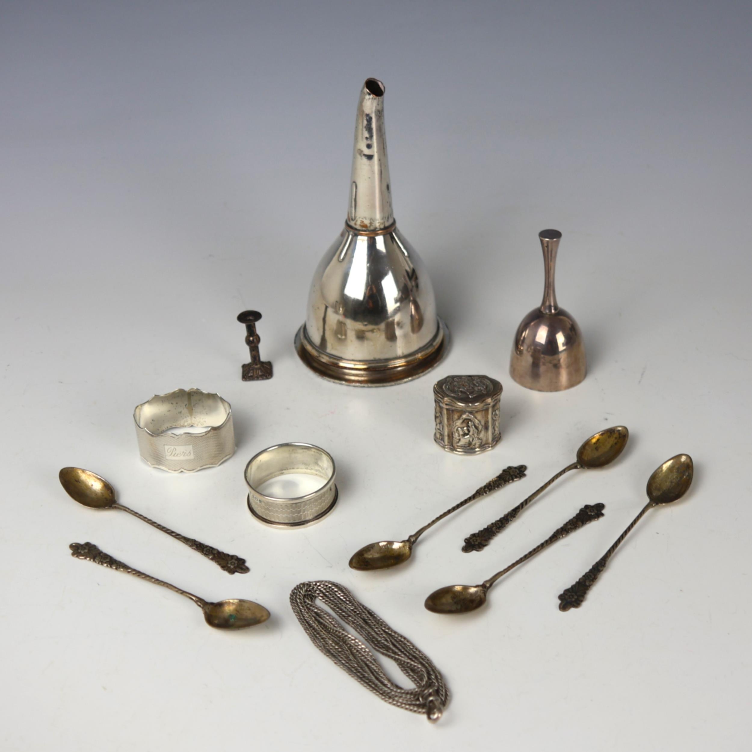 A selection of silver and silver plate, including a mid 20th century silver napkin ring, Henry Clifford Davis, Birmingham 1955, of oval form with shaped rim and initial detail, 5cm wide, a further silver napkin ring, a white metal box, a silver plated wine funnel and further silver plated pieces, gross weight of marked pieces 52gms (qty) (at fault)