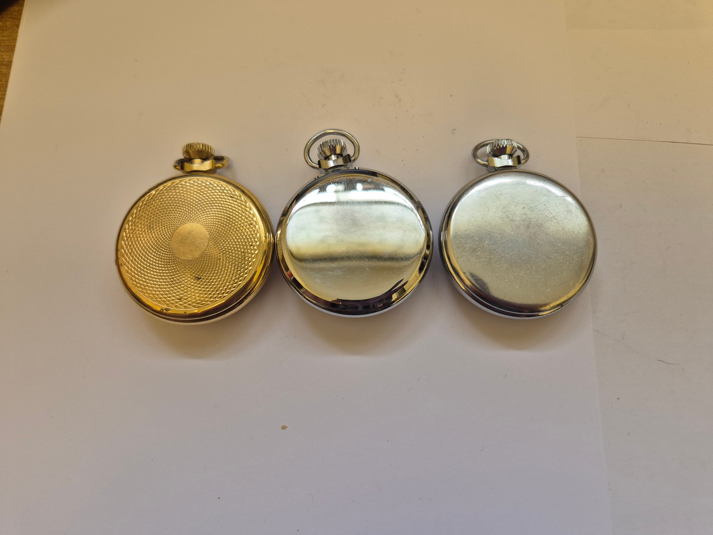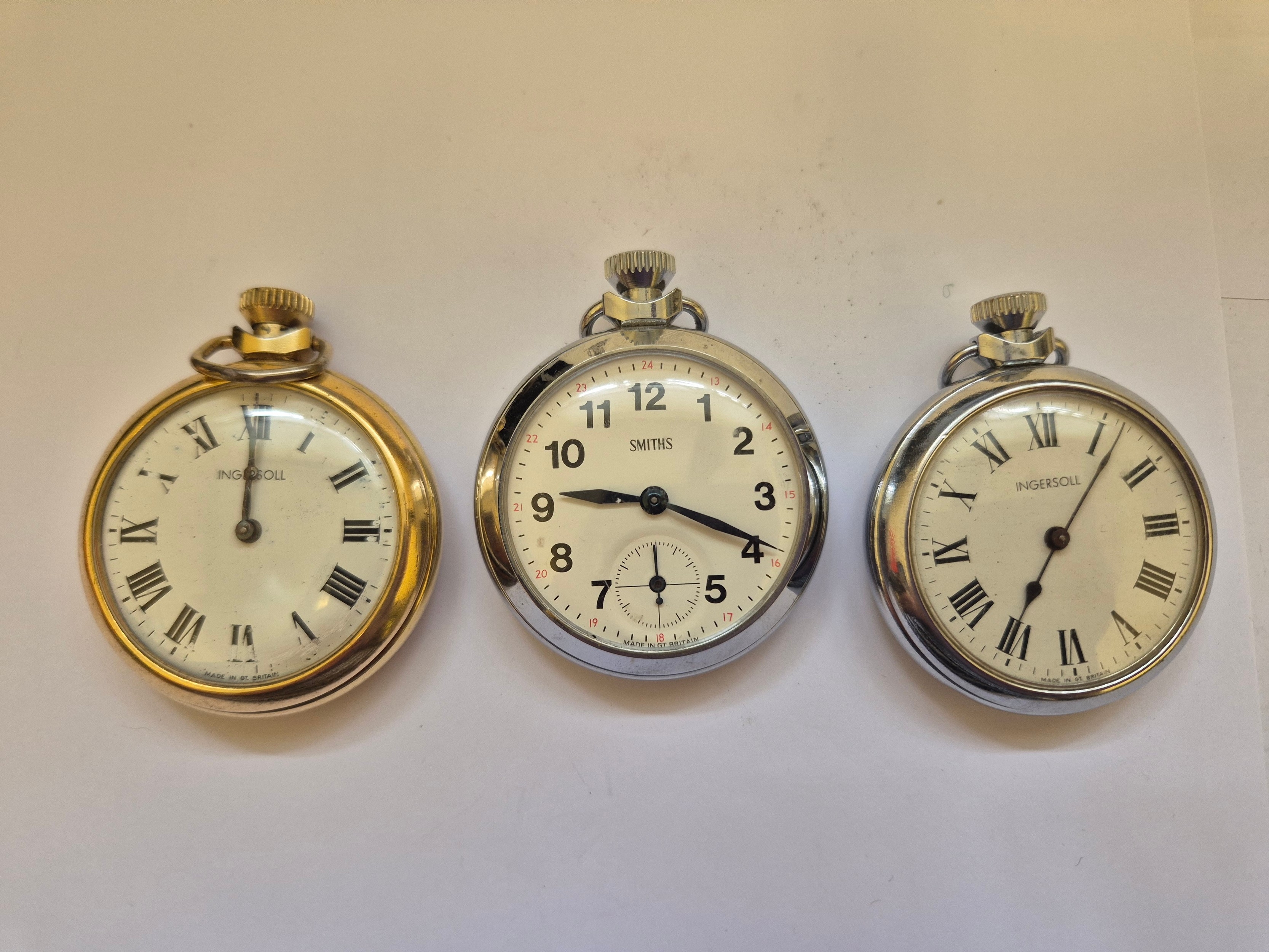 3x pocket watches, including a white metal Smiths with numerals and second dial (working), white metal Ingersoll with Roman numerals (working) and a yellow metal Ingersoll with roman numerals (ticks but needs attention).