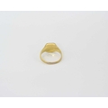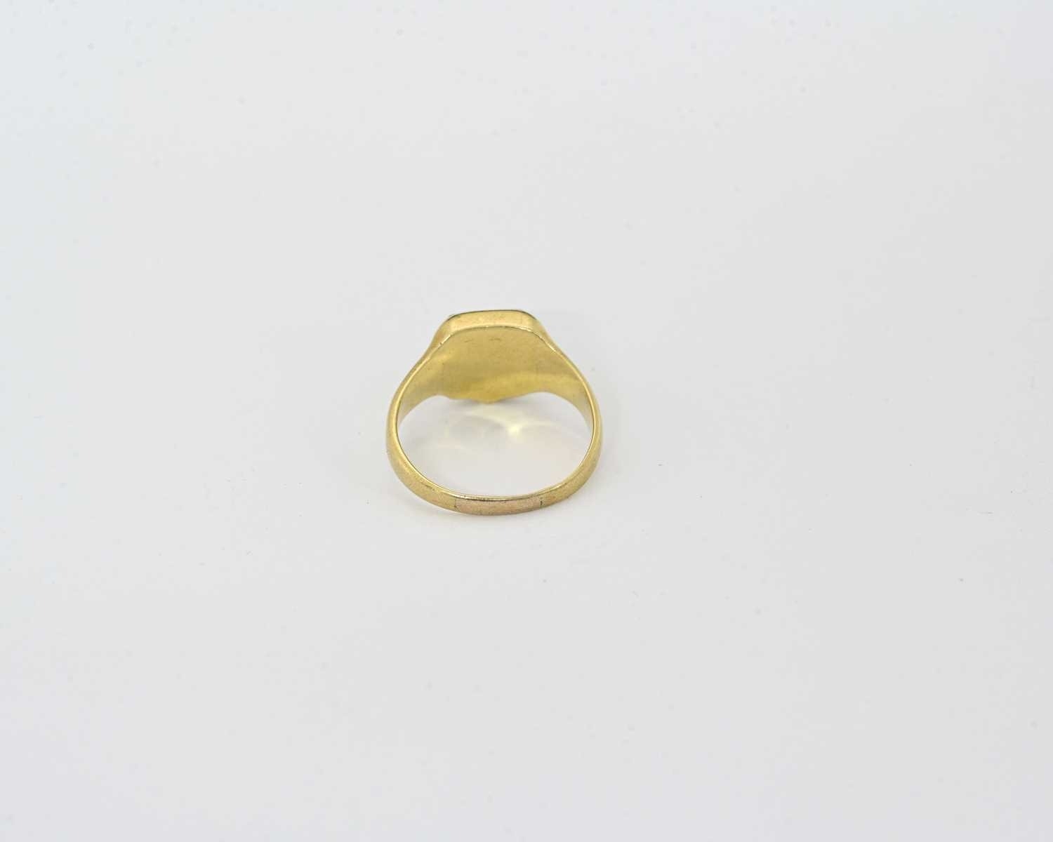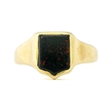 An early 20th century gold shield-shape bloodstone cabochon signet ring, ring size P1/2, 5.3g.