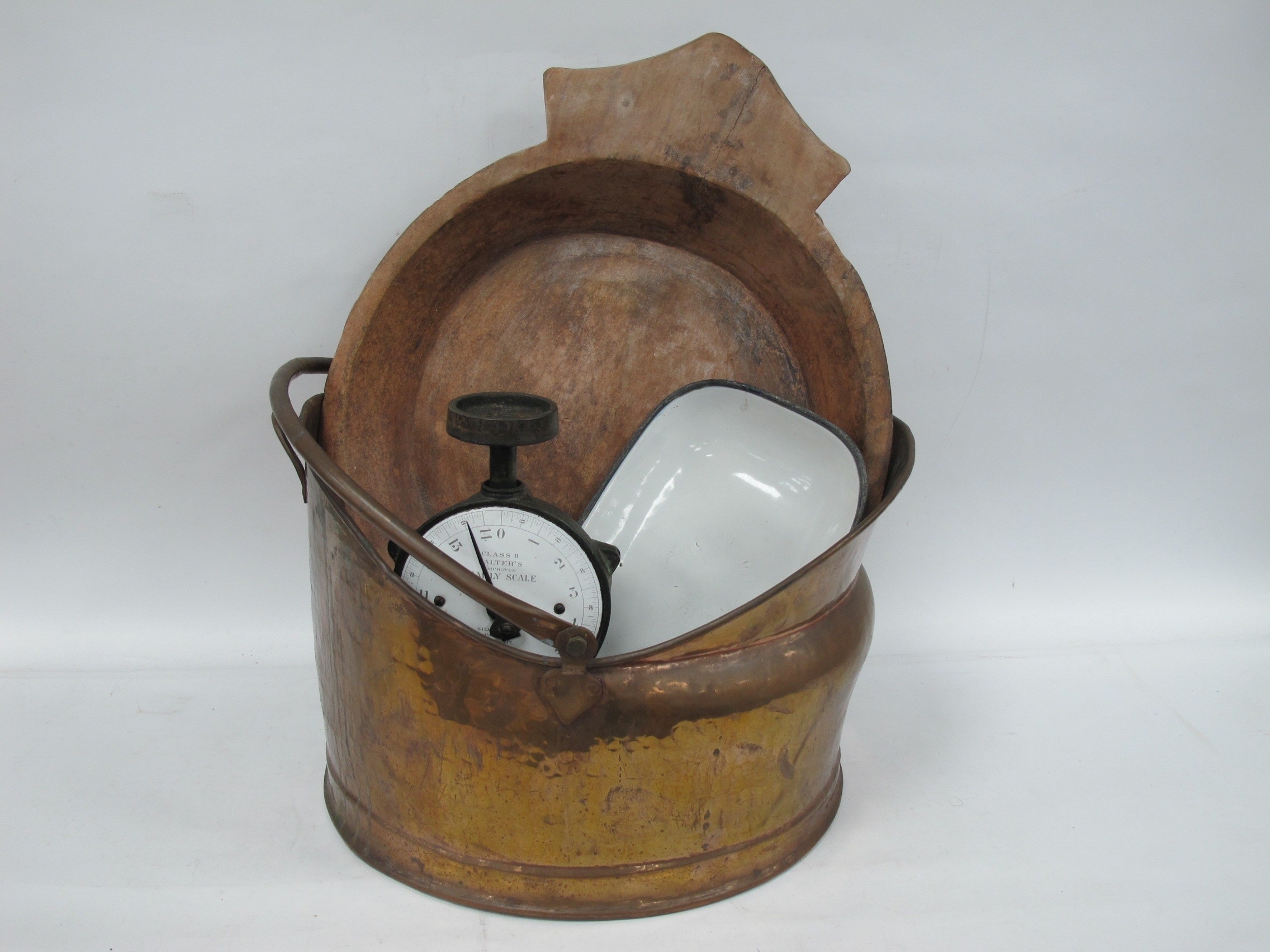 Salter's Family Scales with Enamelled Dial. Large copper log bucket. Two carved wooden shallow dough bowls (4).