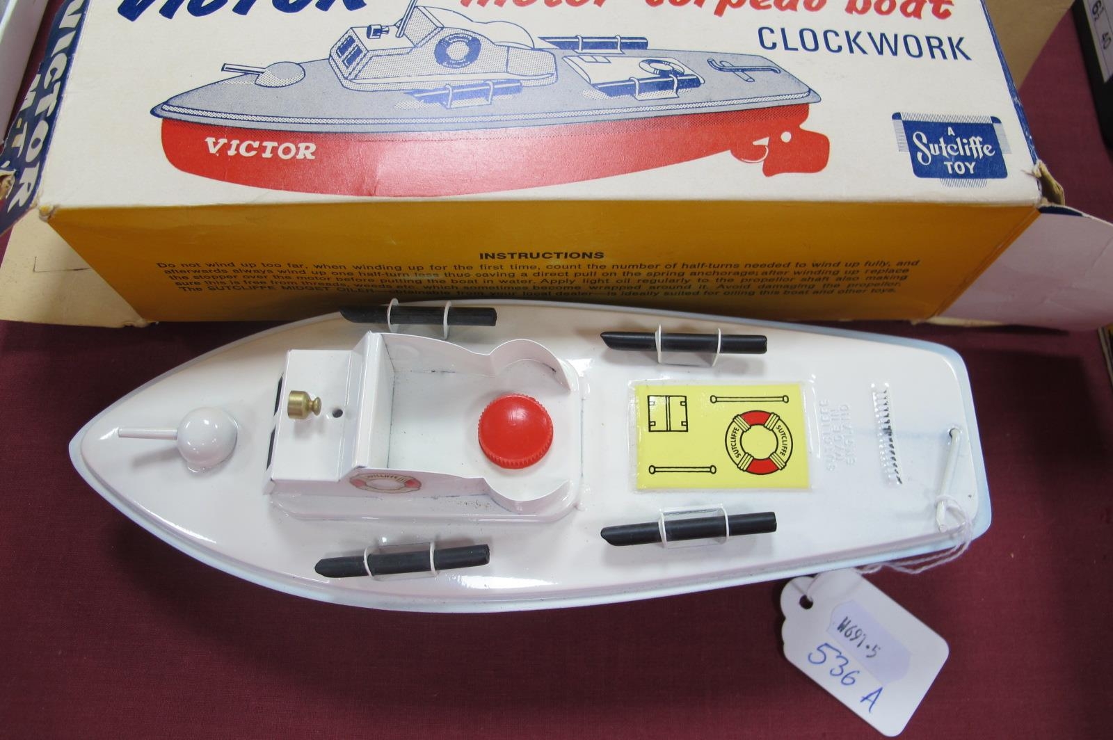 A Sutcliffe Toy Clockwork Model Tinplate Motor Torpedo Boat 'Victor', mast, original key, boxed.
