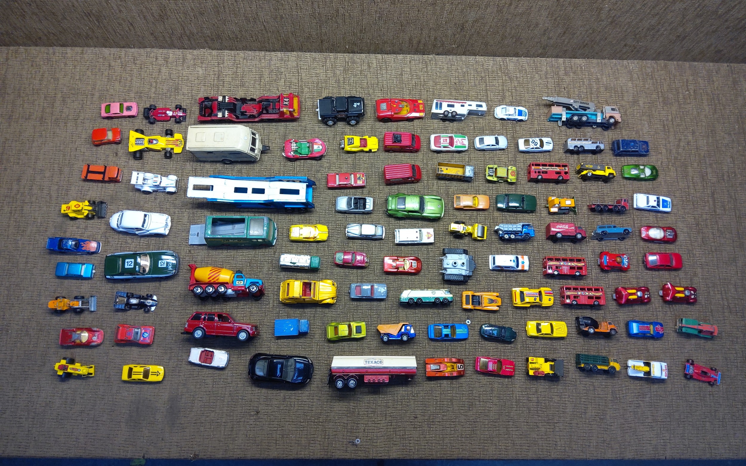 Wooden Box with a large quantity of vintage play worn die-cast cars.