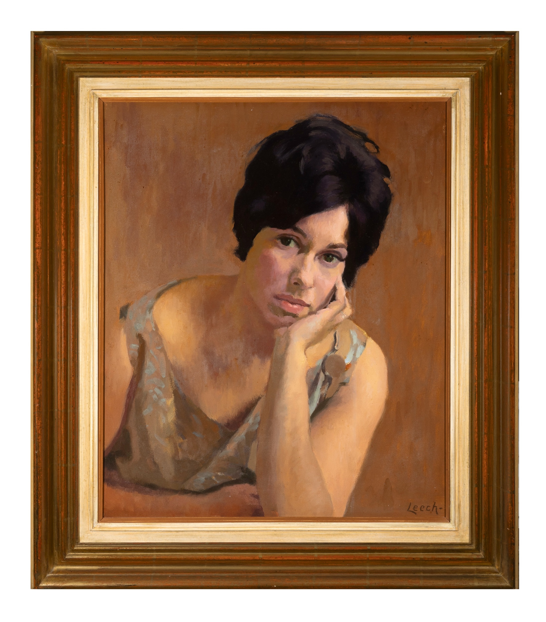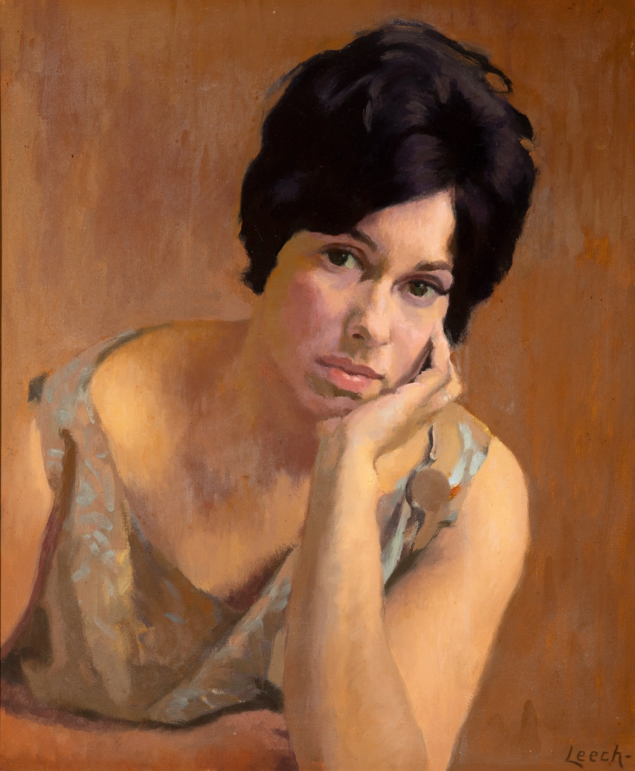 William John Leech RHA ROI (1881-1968) Portrait of Chloe Abbott (1965) Oil on canvas 61 x 51cm (24 x 20”) Signed Provenance: Commissioned from the artist by the sitter’s father in law; Collection of Mrs Chloe Abbott; Sale, Whytes, 30/04/07, lot 72 where purchased by the present owner. Literature: Denise Ferran, William John Leech: An Irish Painter Abroad, NGI, Dublin, 1996, p. 94, reproduced fig. 59. Leech was a fluent portrait painter, producing many portraits throughout his long career but the majority of these works were of family members, friends or acquaintances. Early in his career, after a dissatisfied female client rejected her portrait, he decided only to accept commissions from people he knew. His first wife, Elizabeth, was his favourite model from c. 1910 until 1918, exemplified in the works Convent Garden, Brittany and The Sunshade in the National Gallery and The Cigarette and The Tinsel Scarf in the Hugh Lane Gallery. After the First World War, when Leech returned to London, impoverished and his marriage to Elizabeth failing, he was unable to paint. To encourage Leech back into painting, his brother Cecil introduced him to Percy Botterell, a successful London solicitor, who commissioned Leech from 1919 until 1923, to paint his wife May, his two sons, Jim and Guy, his daughter Suzanne, and himself. May Botterell, then replaced Elizabeth as his favourite model and became his lifelong companion. Leech did not accept any further commissions until he undertook, this, his last portrait commission from Chloe Abbott’s father-in-law, in 1965, to paint his new daughter-in-law. Leech, at this time, was depressed after May’s death and felt unable to paint. The portrait took six months to complete with two or three sittings every week. Granted Leech was then over eighty and getting slower. He was not a prolific painter, often waiting long periods for inspiration, for a change of light or for suitable subject matter. His young neighbour in West Clandon, near Guildford in Surrey, Chloe Abbott, befriended him and kept a watchful eye on him because she knew he was depressed, not just because of his loneliness but also because he had been diagnosed with cancer. She was young, vivacious and interested in art and she encouraged Leech to begin painting again. As a result he completed some of his last self-portraits and views of his garden. The day he slipped out of the back of his house in West Clandon and walked to the railway bridge from which he fell, Chloe Abbott was entertaining a friend in her front sitting room and unfortunately missed his departure. Leech recounted his life as an artist to Chloe Abbott. He told her of his years painting in France, which he loved and then, his time in Steele’s Studios, Hampstead, London. He missed the company and the conversation of other artists and the loss of May, his constant companion for forty-six years. Leech has captured the soft youthfulness of this young bride with her hauntingly sad look, perhaps an early indication of a marriage that was not to last long. The artist has lost none of his painterly dexterity in depicting the light, falling on her face and arm, the diagonal thrust of her body, yet capturing a true likeness which made her instantly recognisable to me when I met her nearly a quarter of a century later. We are grateful to Dr. Denise Ferran for providing the above catalogue note.