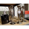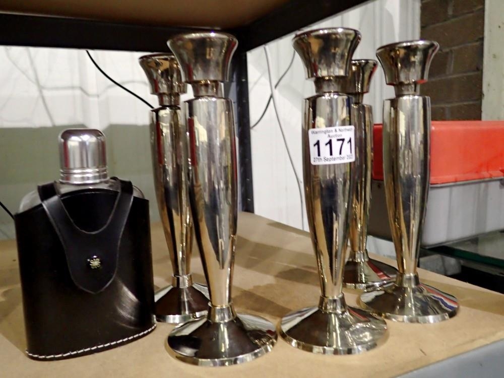 Five polished steel candlesticks and a hip flask. Not available for in-house P&P