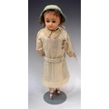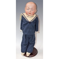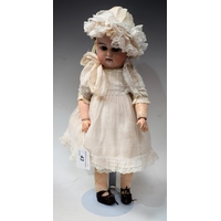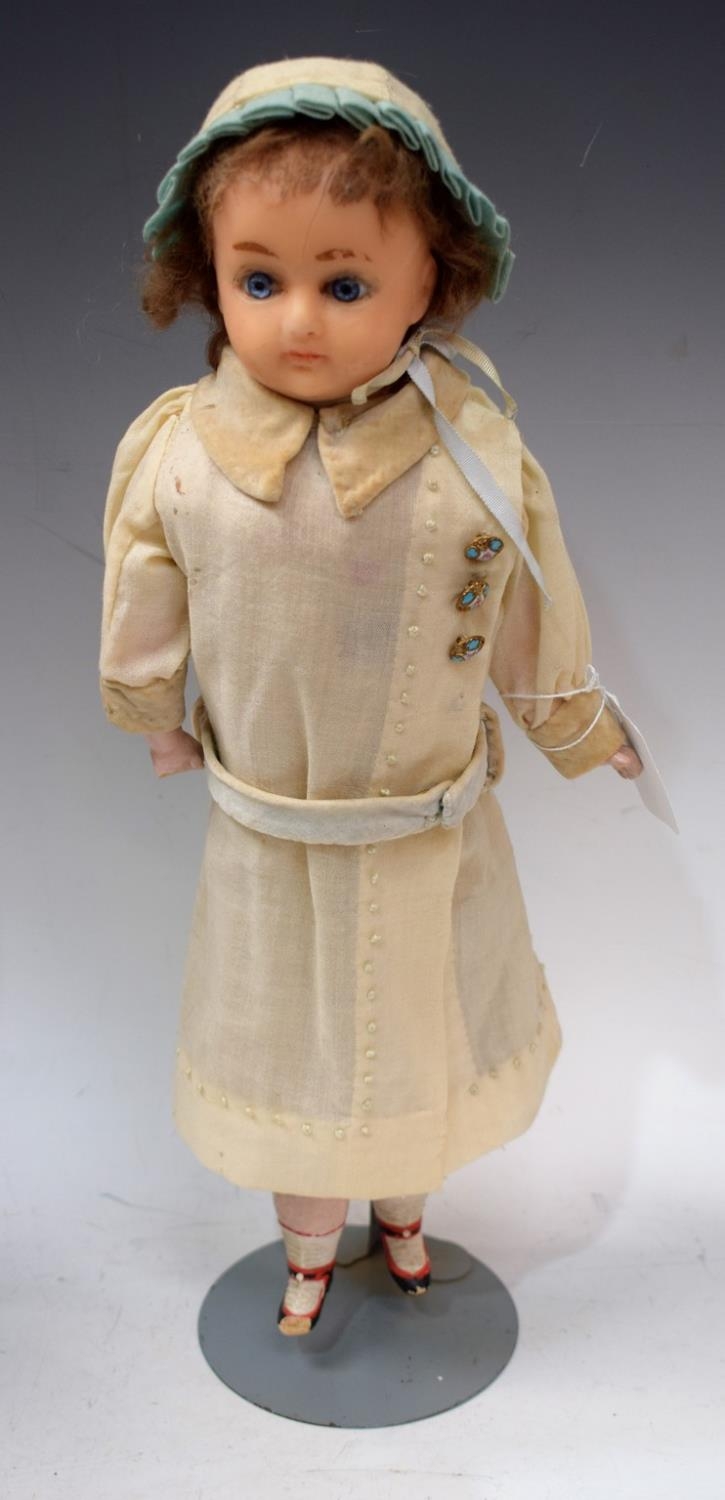 A wax head shoulder doll, moulded face, inset fixed blue glass eyes, closed mouth, mixed length brown hair, stuffed cloth body, composite lower arms and legs, white dress with enamelled buttons, velour collar and belt, pale blue bonnet, painted shoes, 41cm high overall