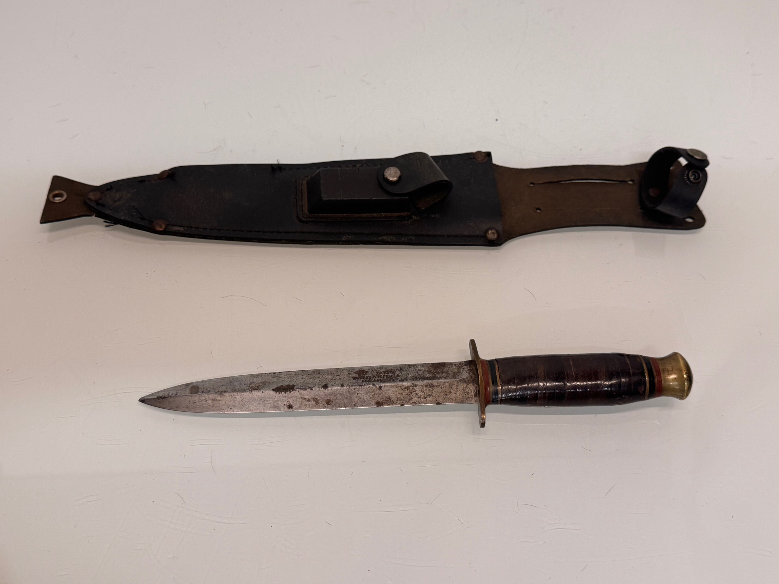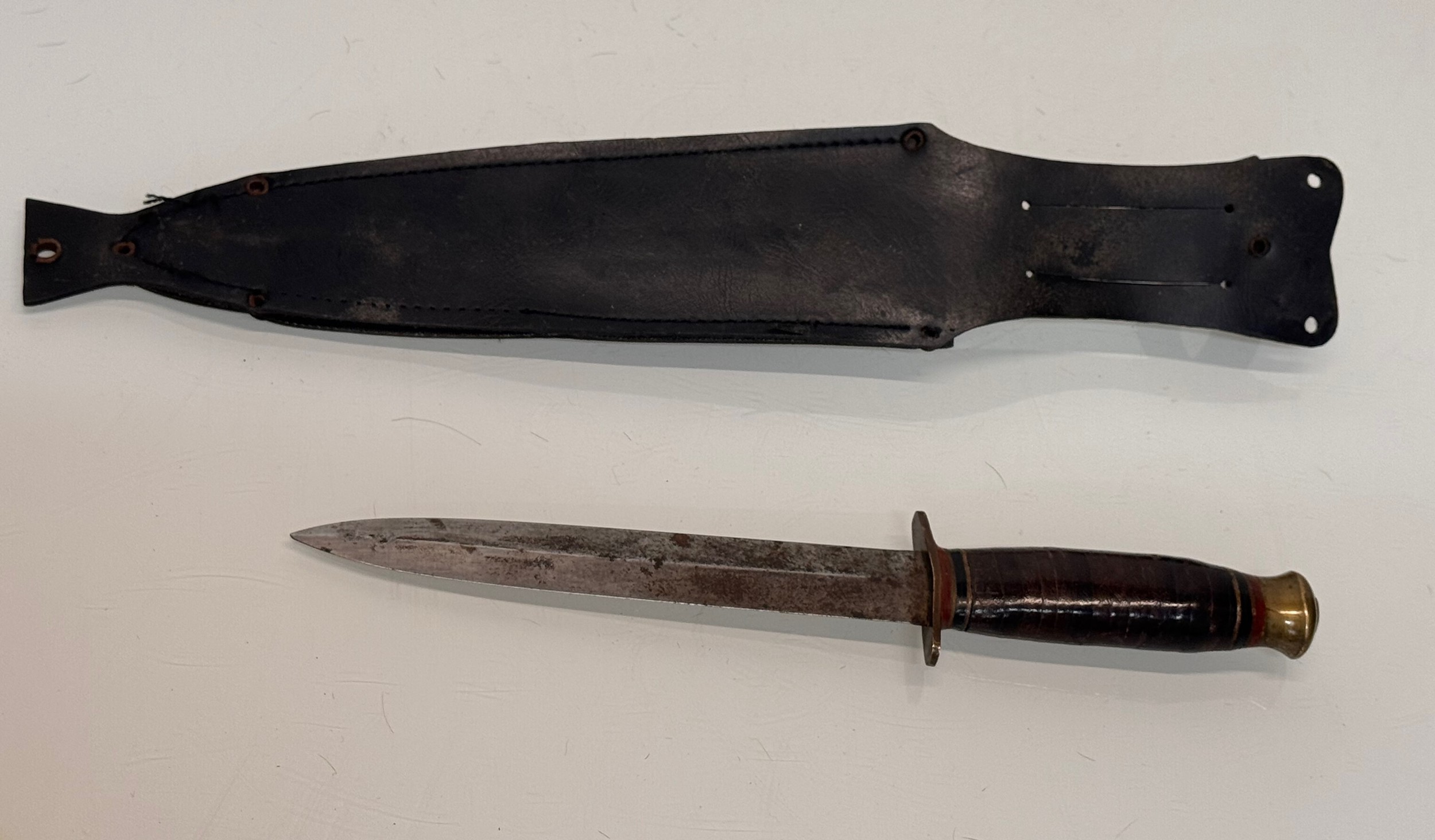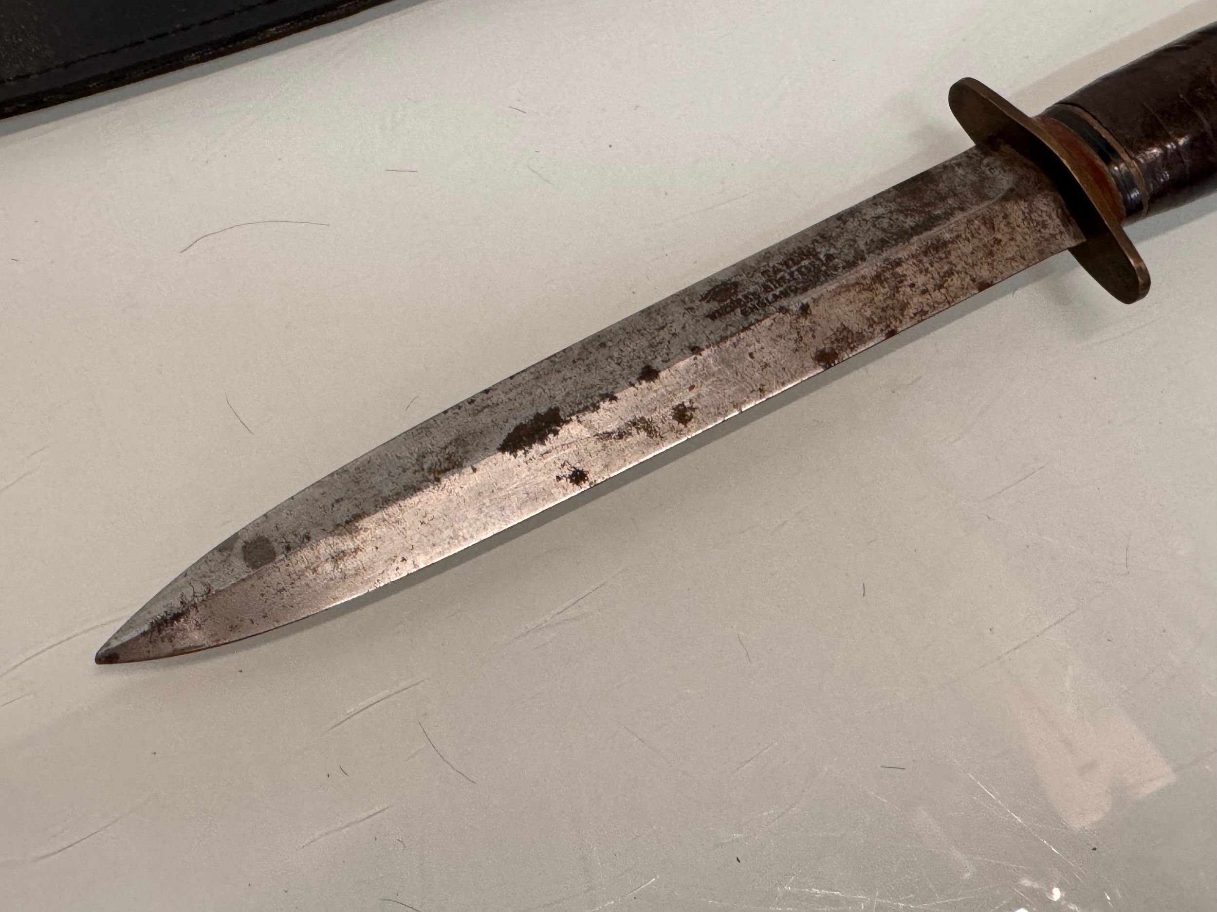 Militaria, British military edged weapons, WWII era fighting knife marked Taylor Witness Sheffield with sheath.