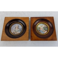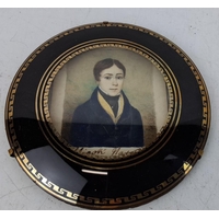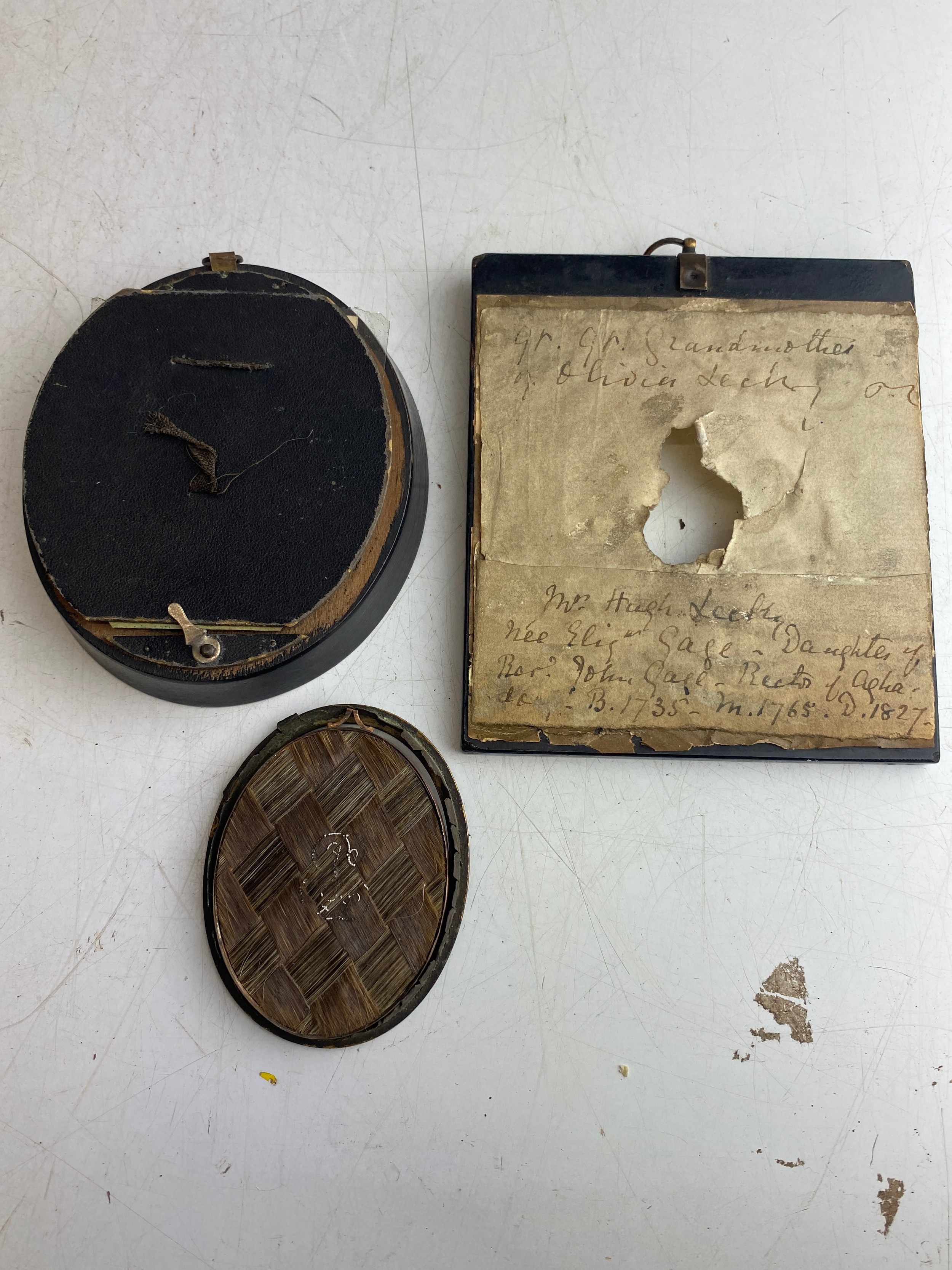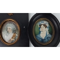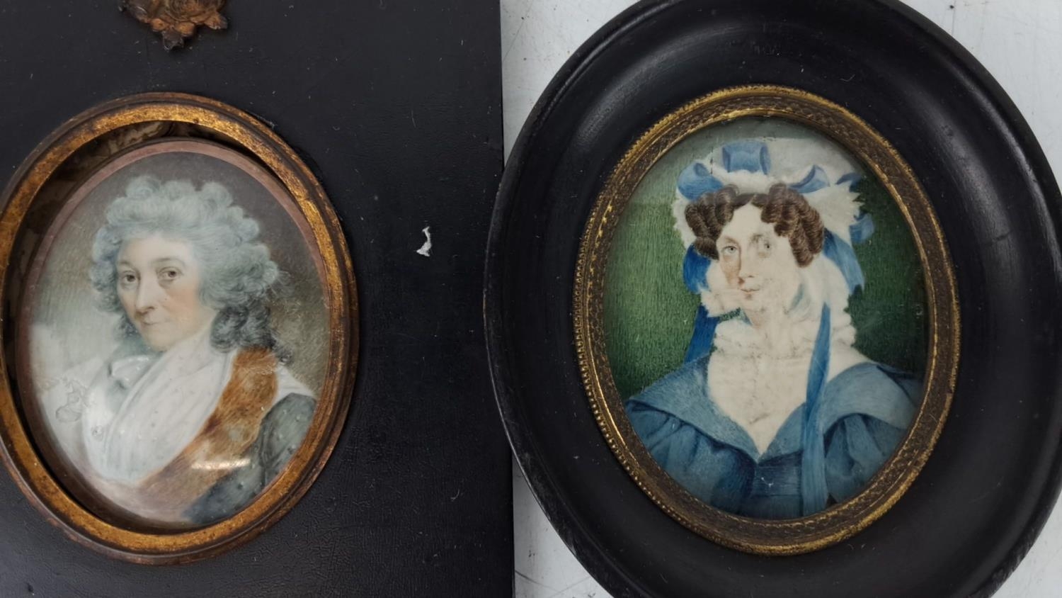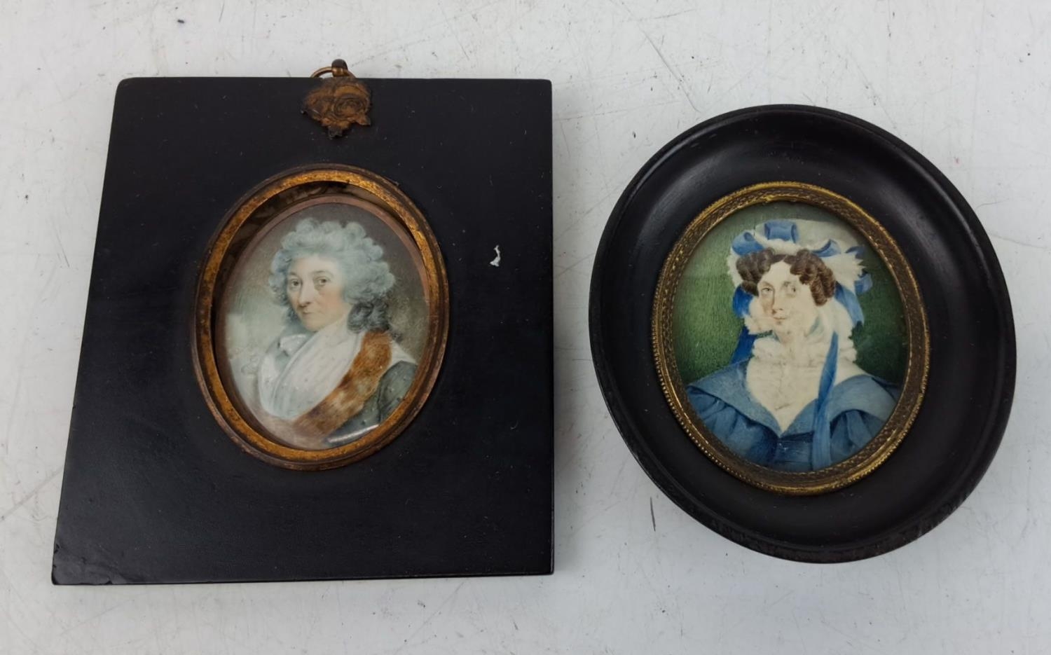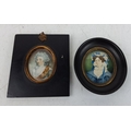 An antique hand painted miniature of a gent inscribed on reserve 'Gr Gr Grandmother Olivia Lecky - Mr Hugh Lecky - nee Eliz Gage daughter of Ror? John Gage - Rectory of Aghadowey B1735 - M 1765 D1827 and another hand painted miniature on paper of a lady in a black oval frame, measuring 13.5cm x 12cm and 12cm x 10cm.
