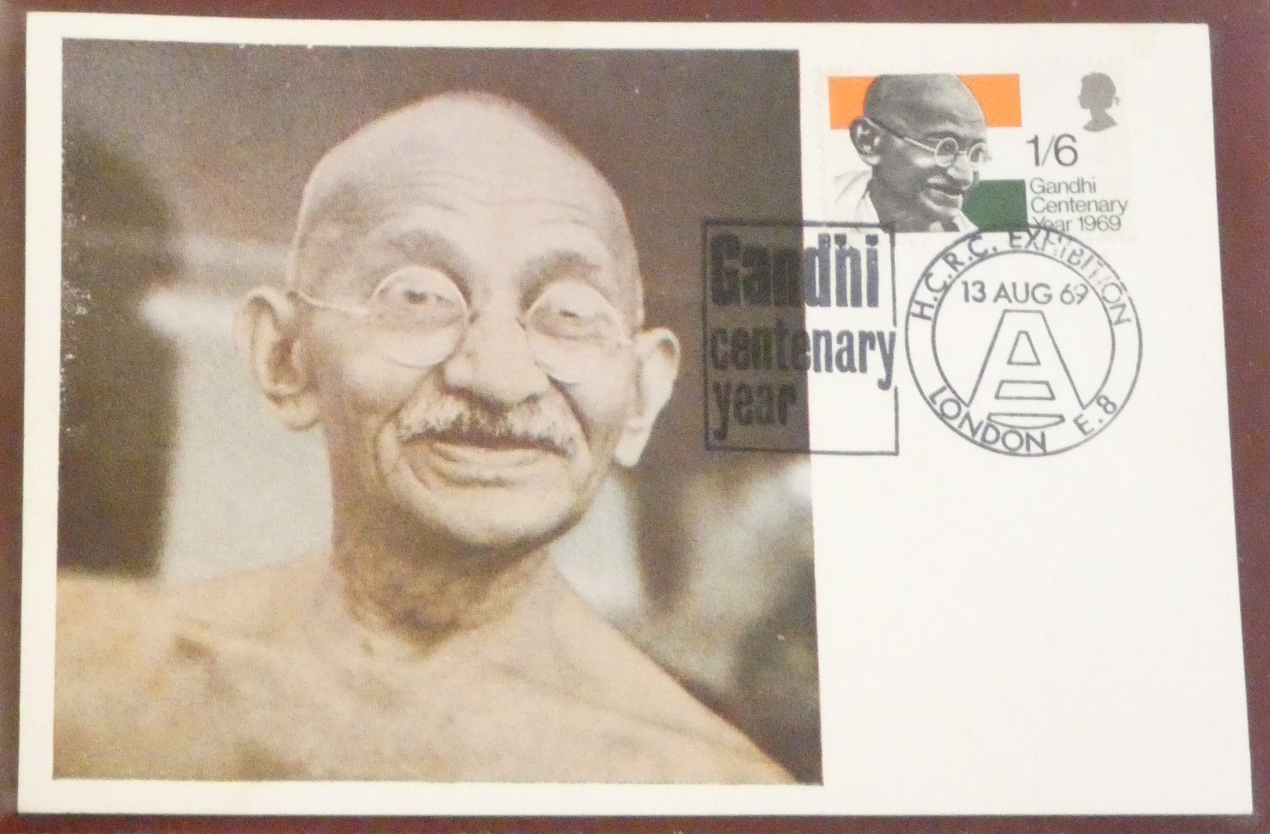 GB FDCs 1969 (13 August) Ghandi first day of issue card with Ghandi Centenary Year H.S.R.C London E8, Exhibition hand stamp.