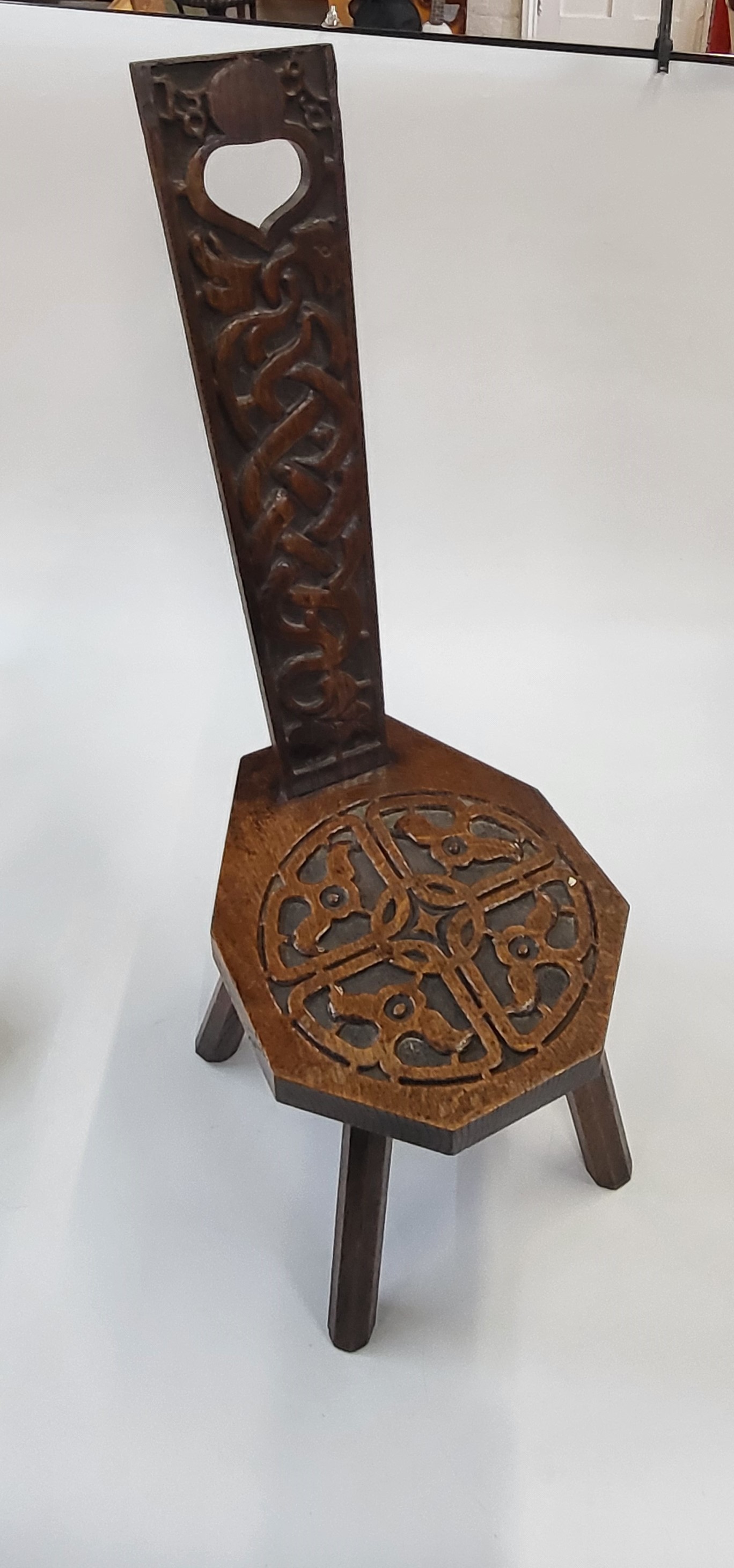An oak Welsh spinning chair carved in 1898. 83 x 29 x 36cm.