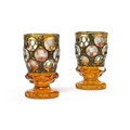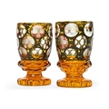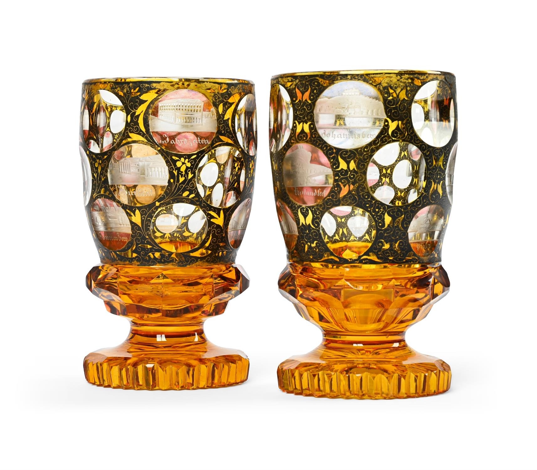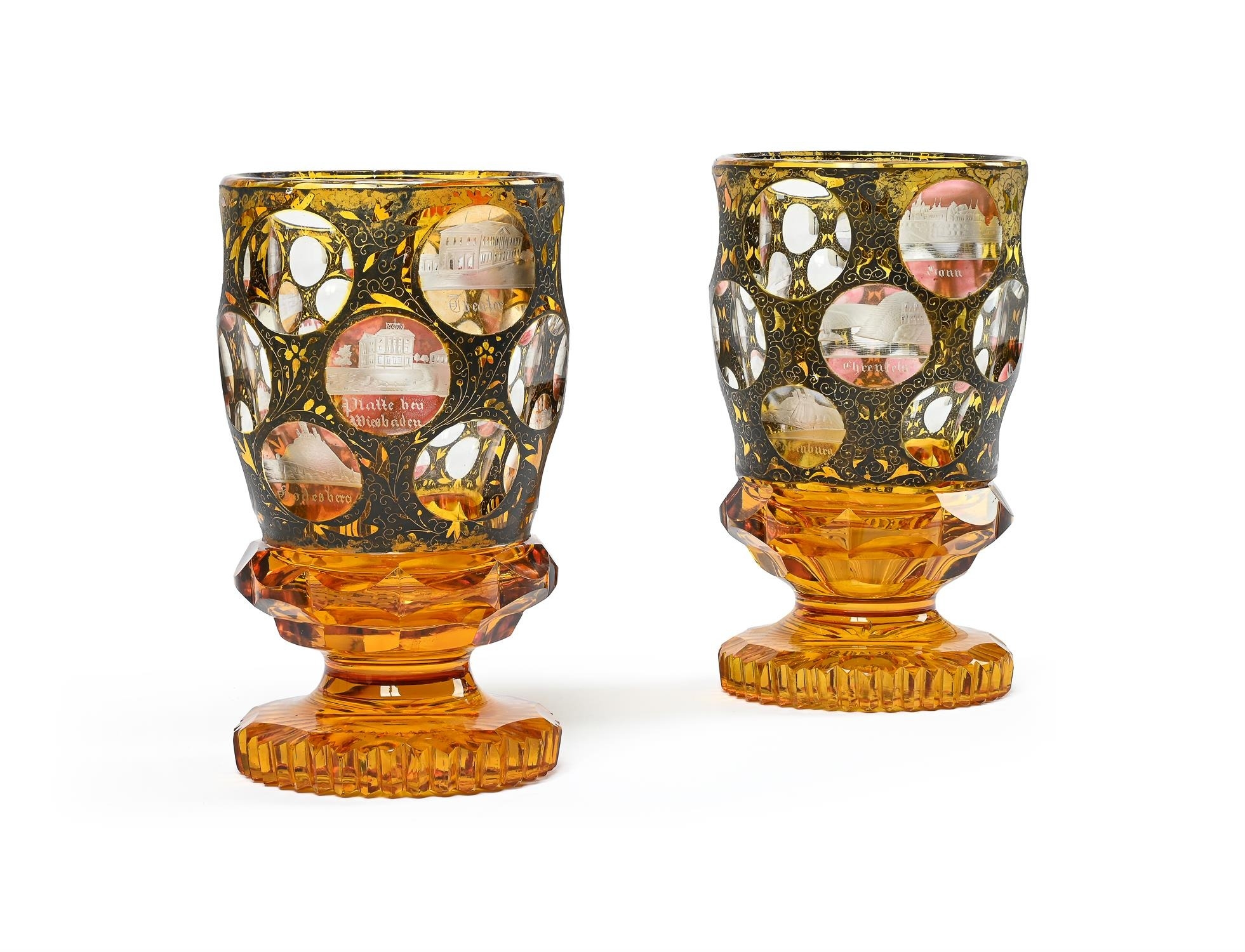 A PAIR OF BOHEMIAN CLEAR-GLASS AND AMBER OVERLAY 'SPA' GOBLETSTHIRD QUARTER 19TH CENTURY Decorated with engraved round polished panels of topographical spa towns reserved on a black enamel ground16.5cm high, 9.5cm diameter