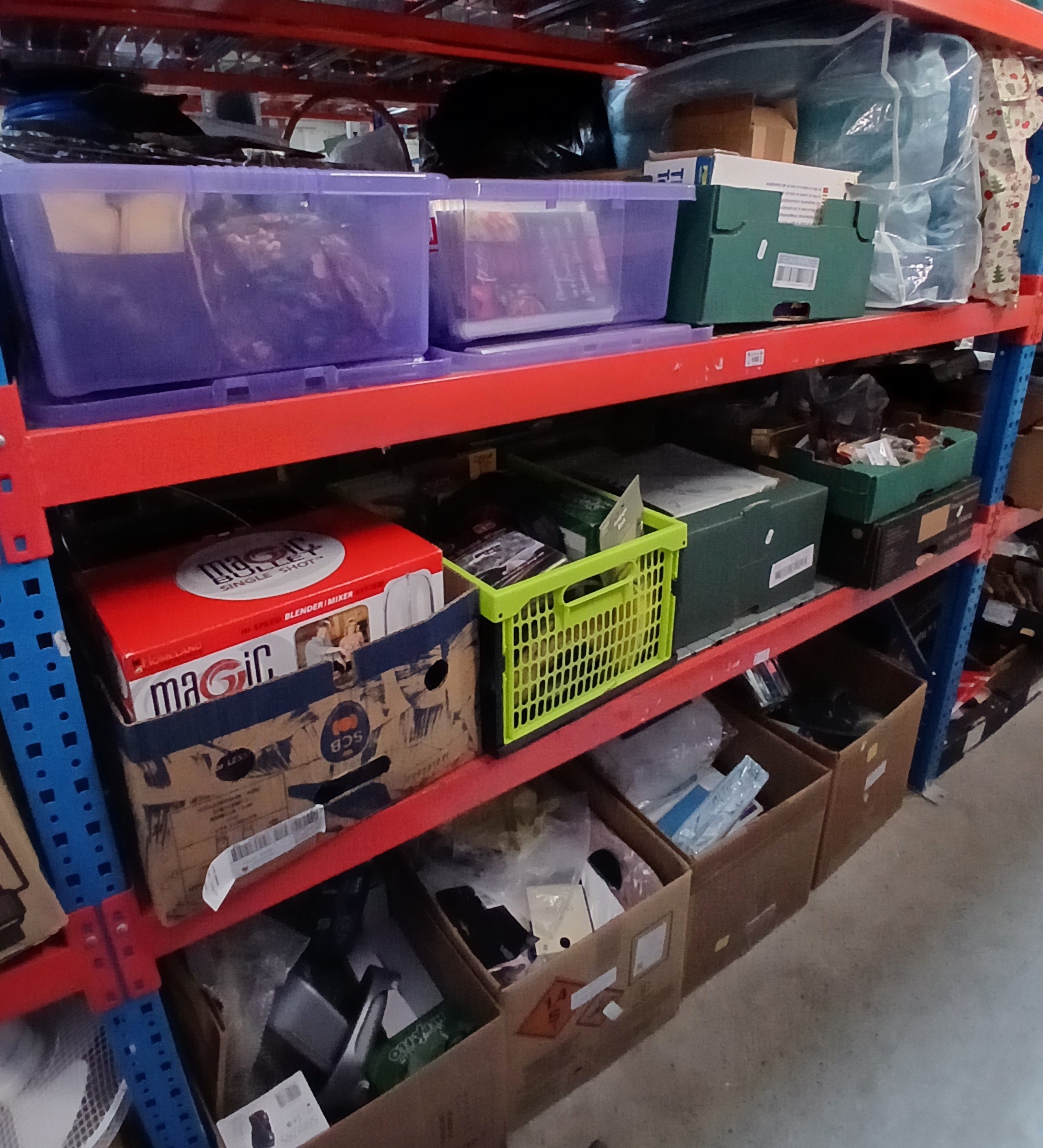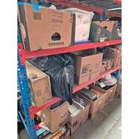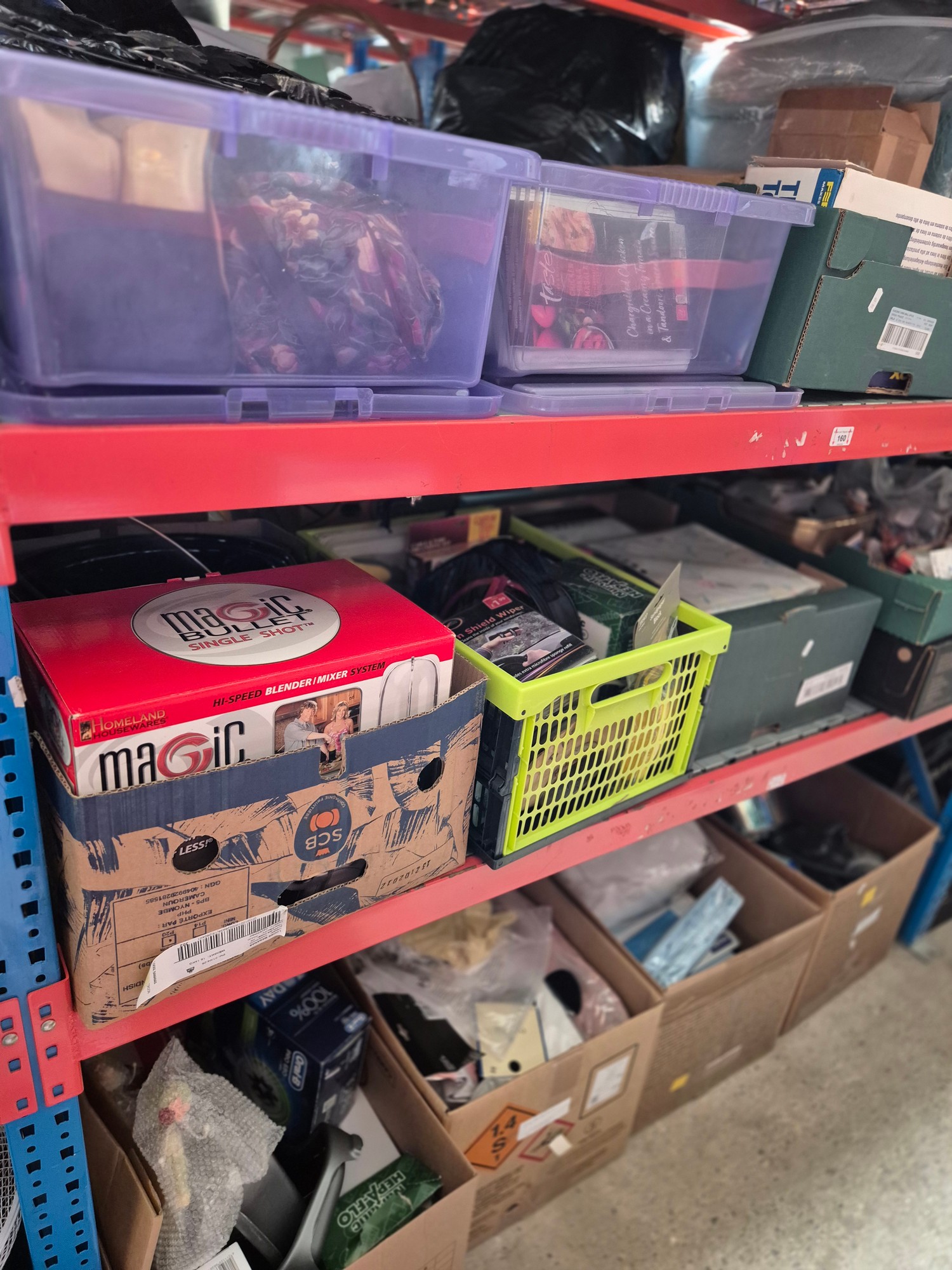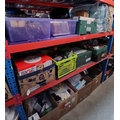 A mixed lot on 3 shelves (12 boxes and 2 bags) to include automatic slide projector, detail sander, crafting items including Sizzix Big Shot, dash cam, clothing, bedding sets, quilts, jump lead kit, chisels set, kitchen pans, metal wall art, ceramics, ornaments, paperweights etc