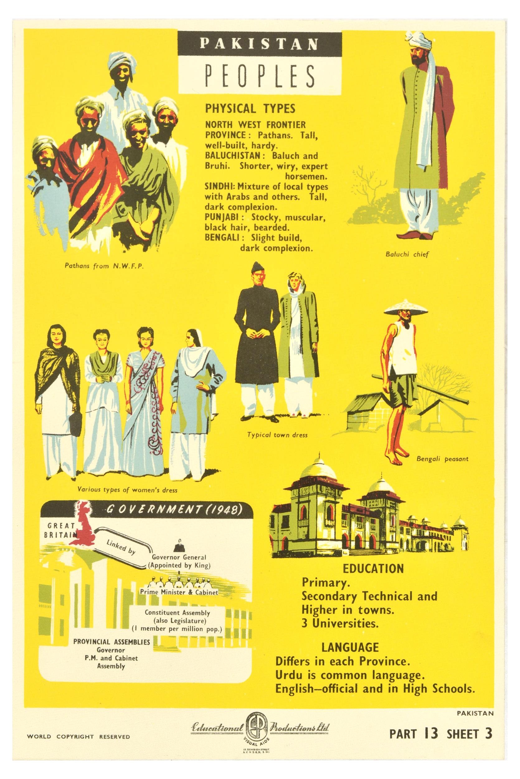 Propaganda Poster Pakistan People Education Language Government. Original vintage educational poster for Pakistan featuring list and illustrations of main physical types, dress, language, education and government structure. Printed by Educational Productions Ltd. Very good condition, minor creasing, minor staining. Country of issue: UK, designer: Unknown, size (cm): 46x31, year of printing: 1940s.