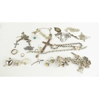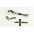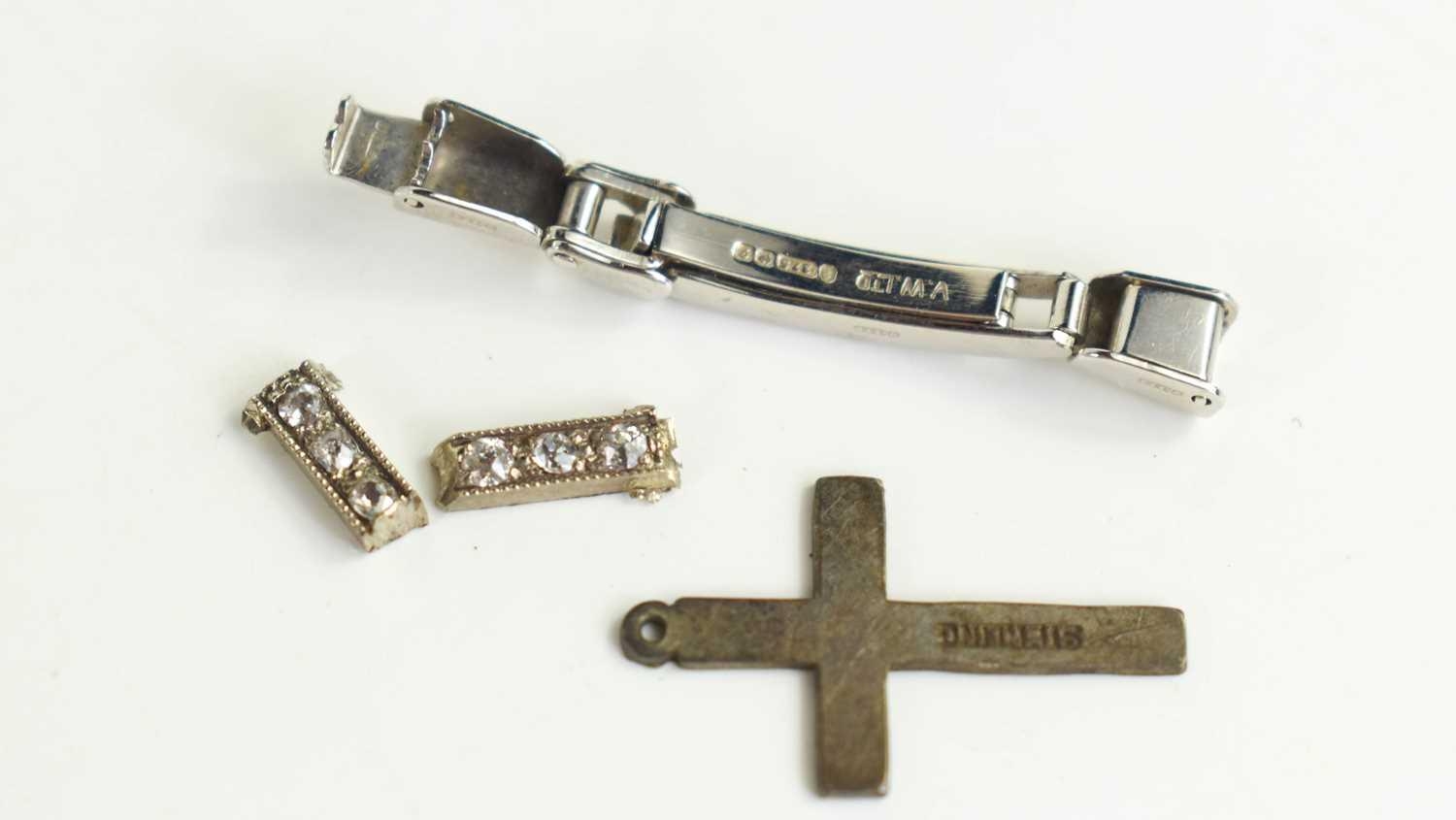 A 9ct gold bracelet clasp, 2.3g, a silver cross pendant, and two sections of precious metal, likely white gold set with small diamonds A/F.