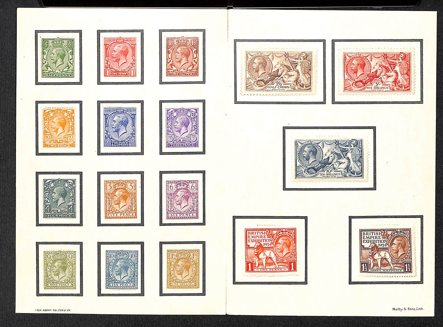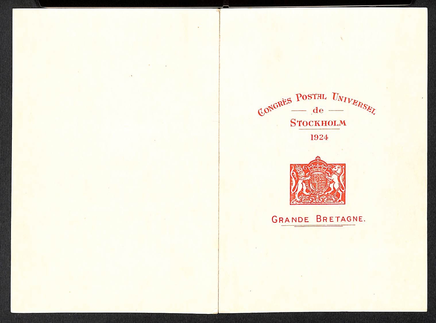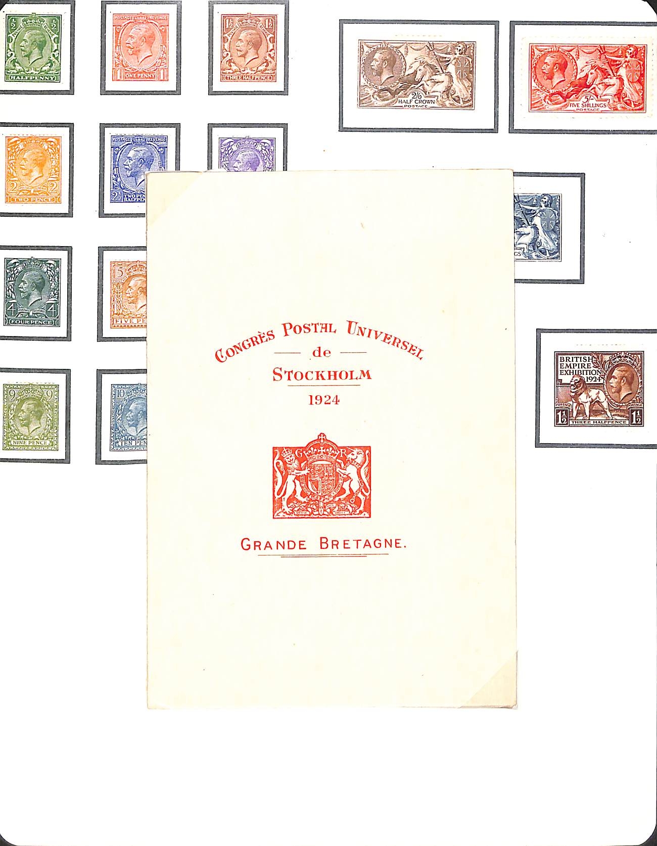 1924 Presentation booklet with printed cover "CONGRES POSTAL UNIVERSEL de STOCKHOLM 1924. GRANDE BRETAGNE", containing KGV ½d - 1/- (½d and 1½d Block Cypher, others Royal Cypher), Bradbury Wilkinson 2/6 - 10/-, 1924 Wembley 1d and 1½d, all mounted with hinges. The 5/- creased, otherwise superb and very scarce, presented to delegates at the U.P.U Congress.