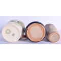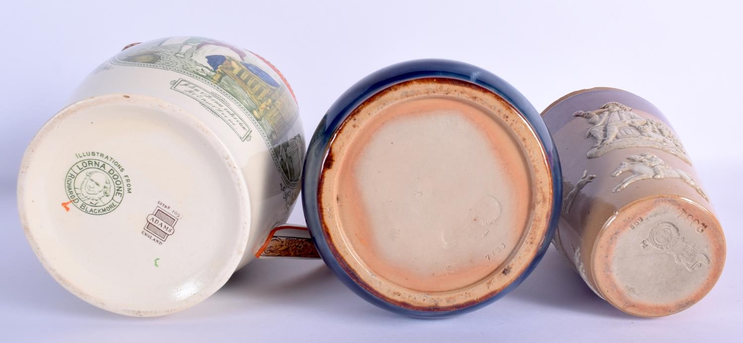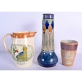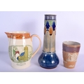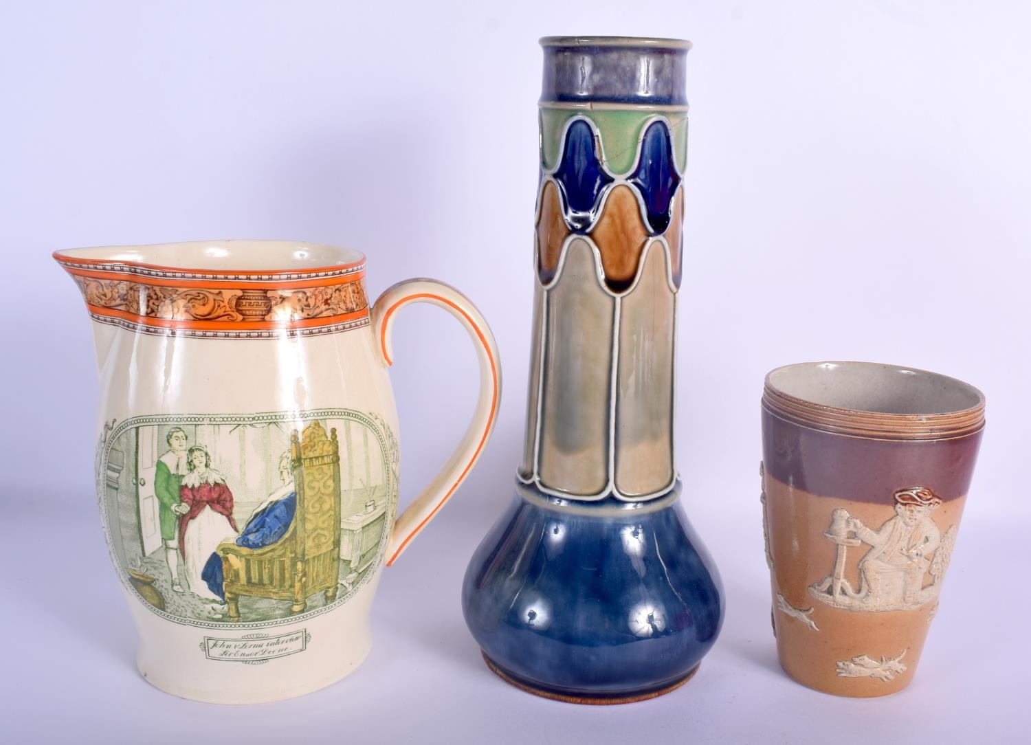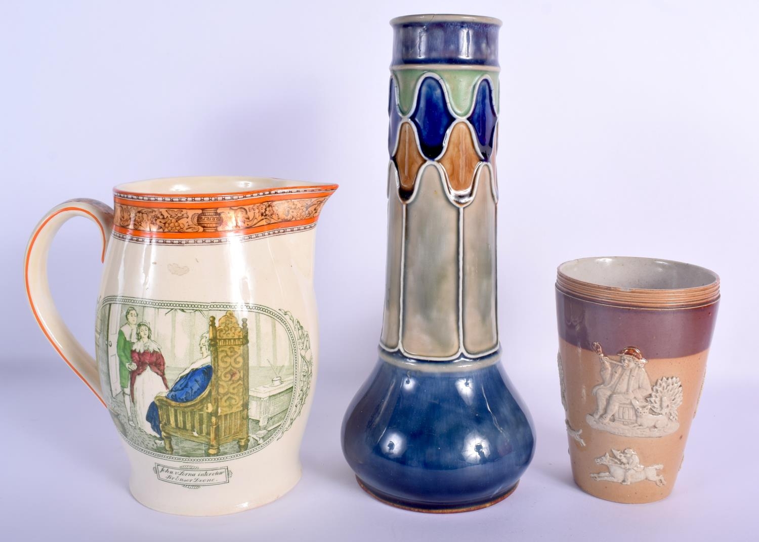AN ANTIQUE DOULTON STONEWARE BEAKER together with another Doulton vase & a rare Adams jug. Largest 29 cm high. (3)