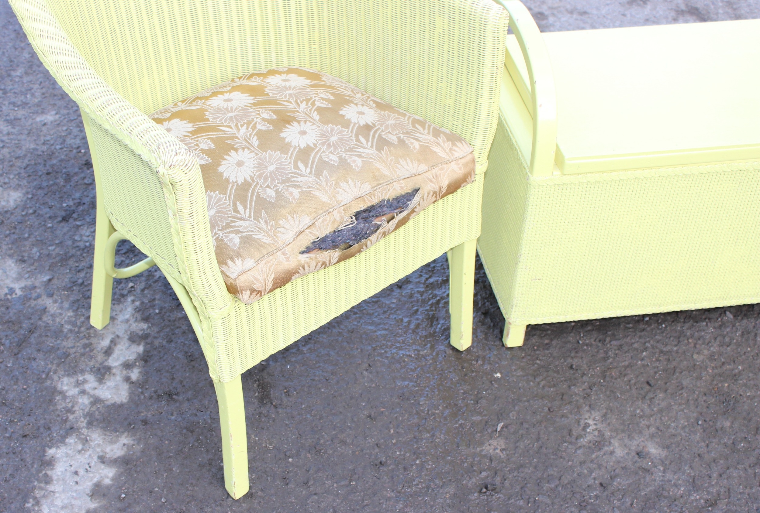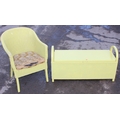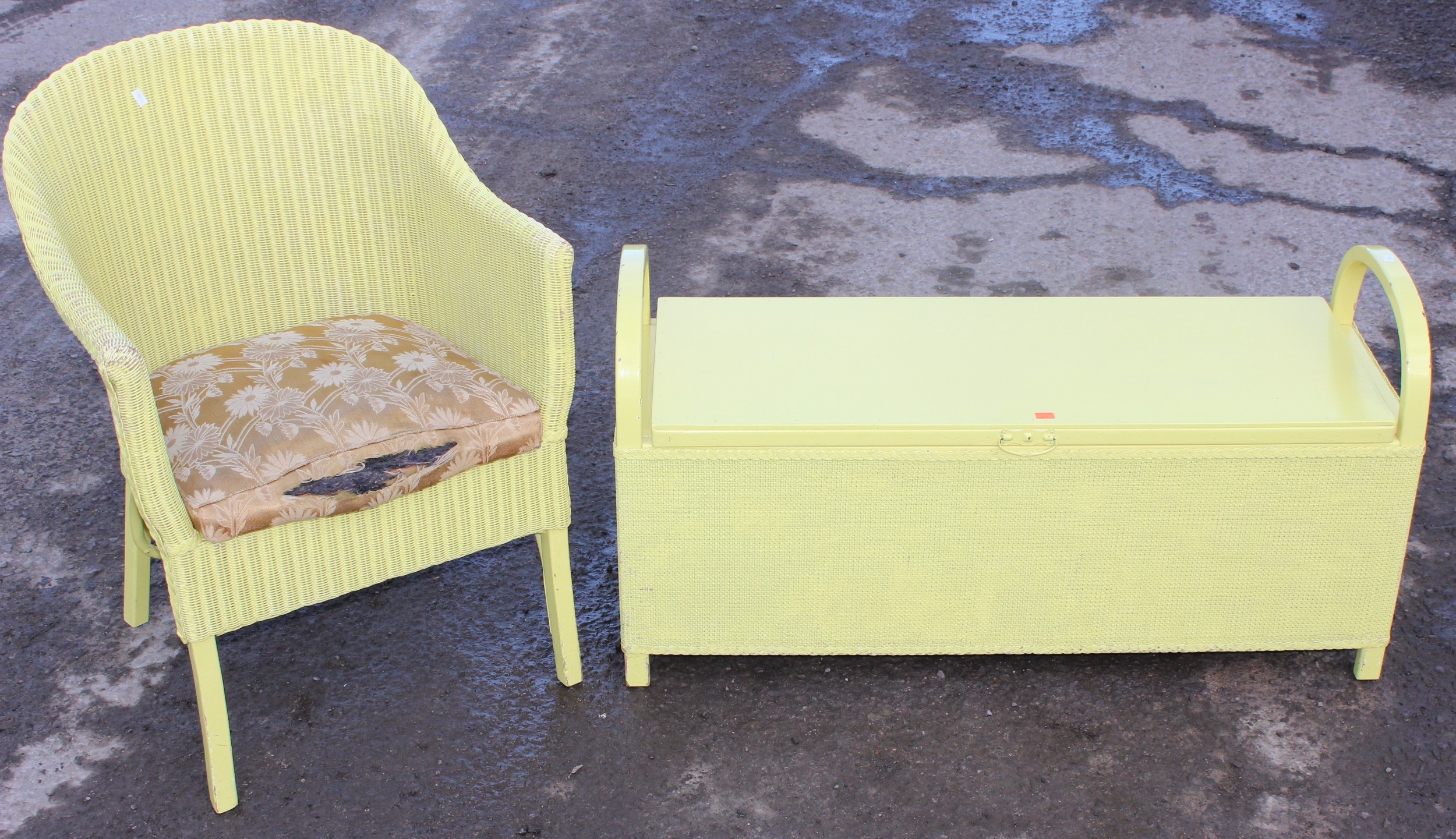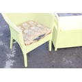 A yellow painted Lloyd Loom style chair and ottoman, the ottoman approx 100cm wide x 37cm deep x 50cm tall