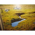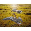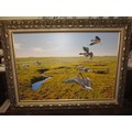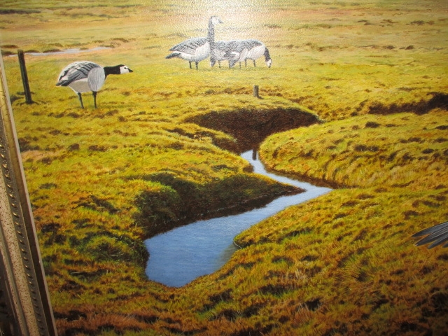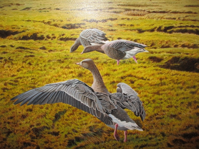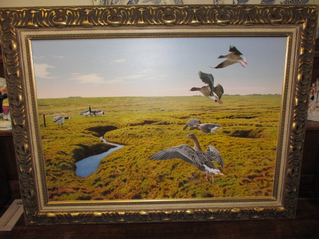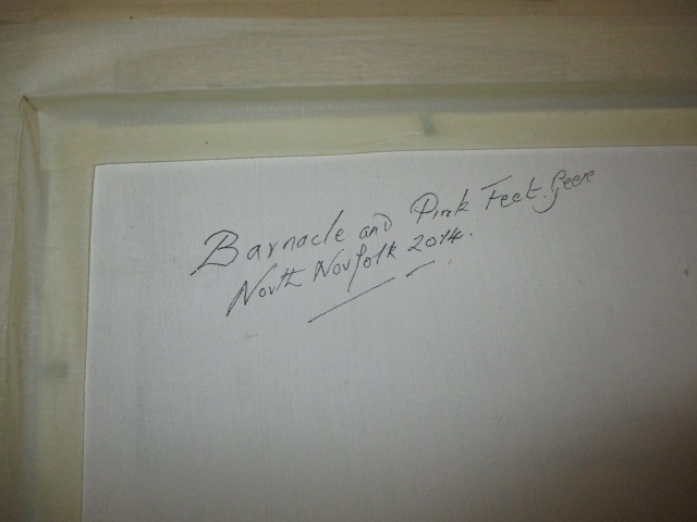 A contemporary painting of pink feet geese over a Norfolk landscape, signed lower right, dated verso 2014, approx frame size 98x74cm, in good pre-owned condition